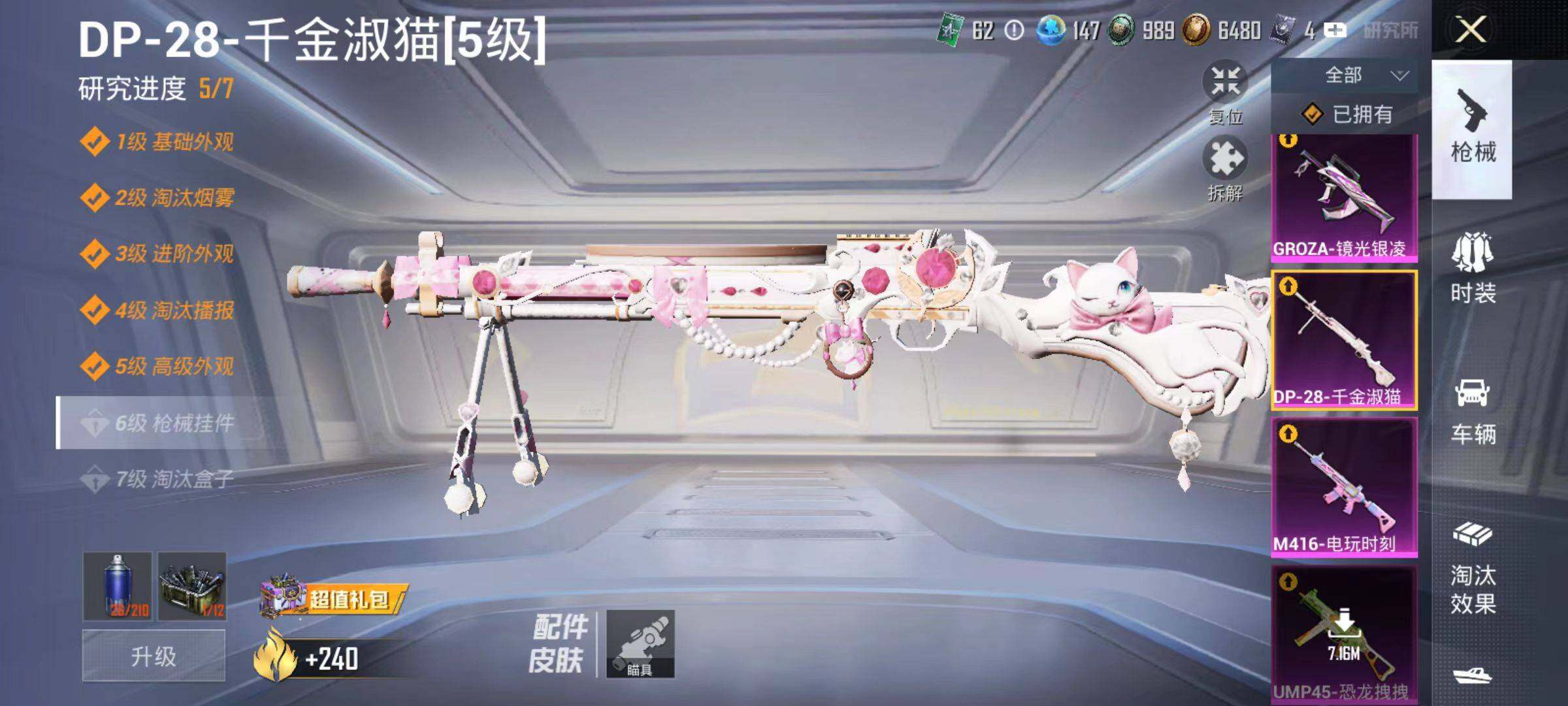 【粉色枪皮等级】:M416-电玩时刻(五级),GROZA-镜光银凌(五级),A