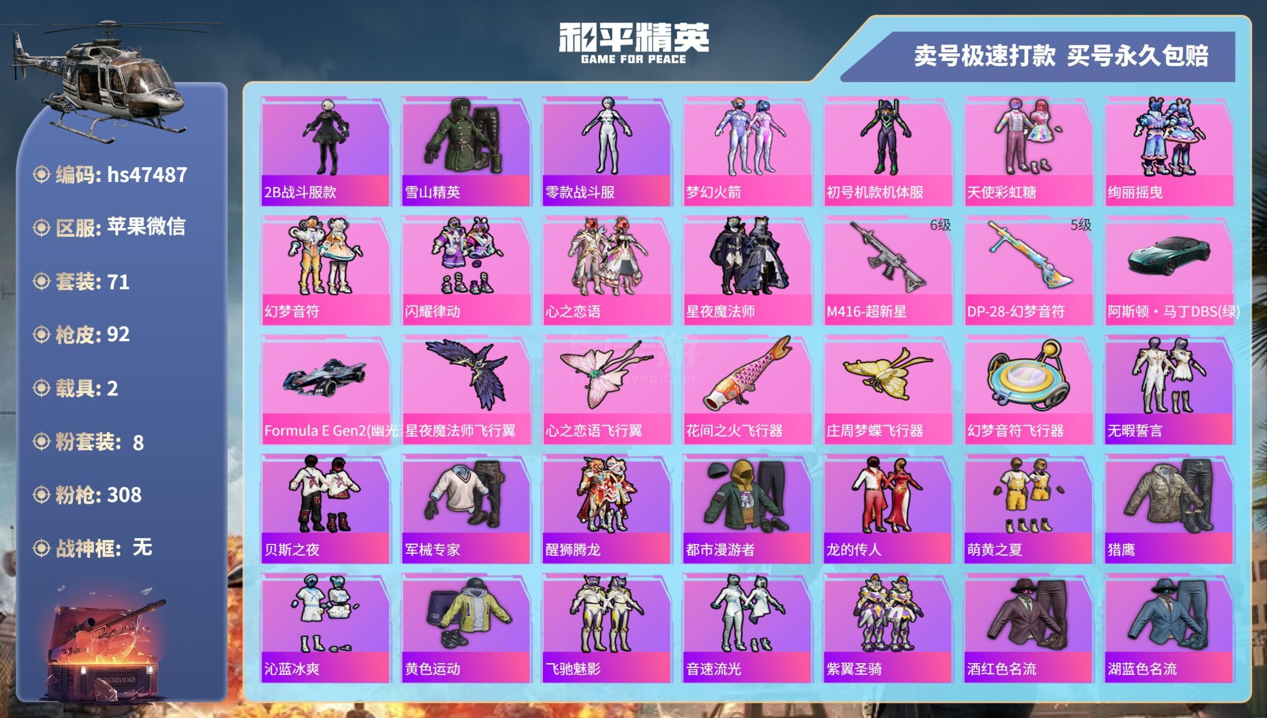 hs47487 苹果v-3王牌印记-8粉装-2特效枪-2载具-35839热力值-71套装-92枪皮