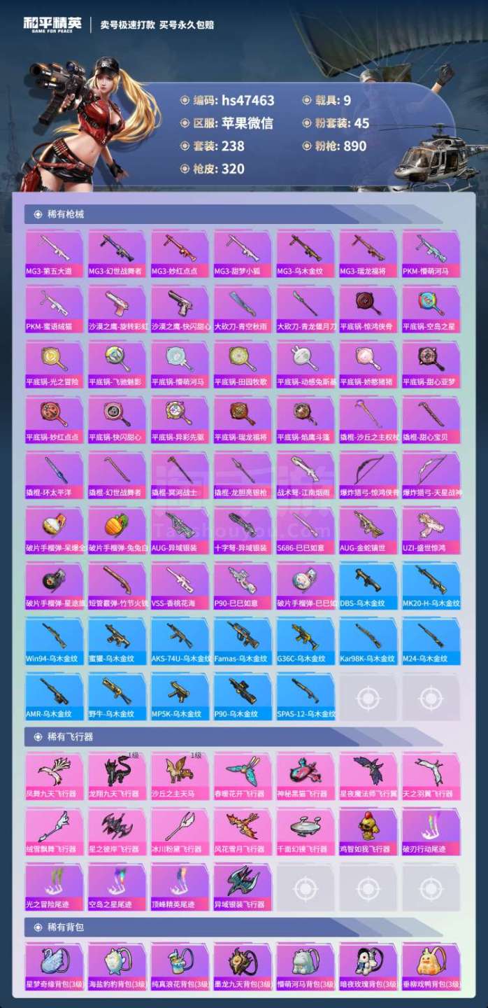 hs47463 苹果微-19王牌印记-1红装-45粉装-22特效枪-9载具-154147热力值-2