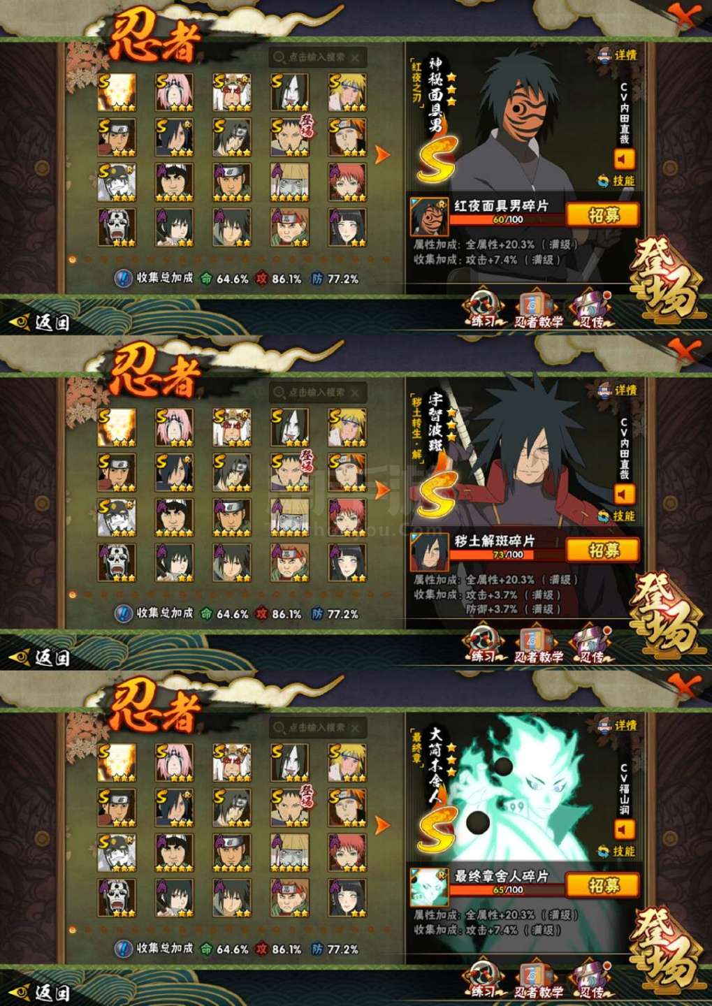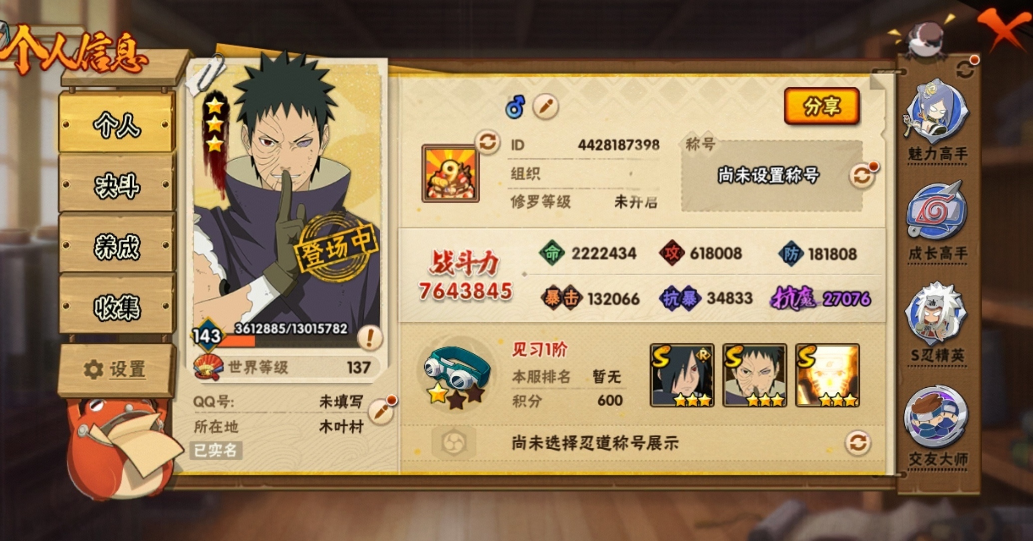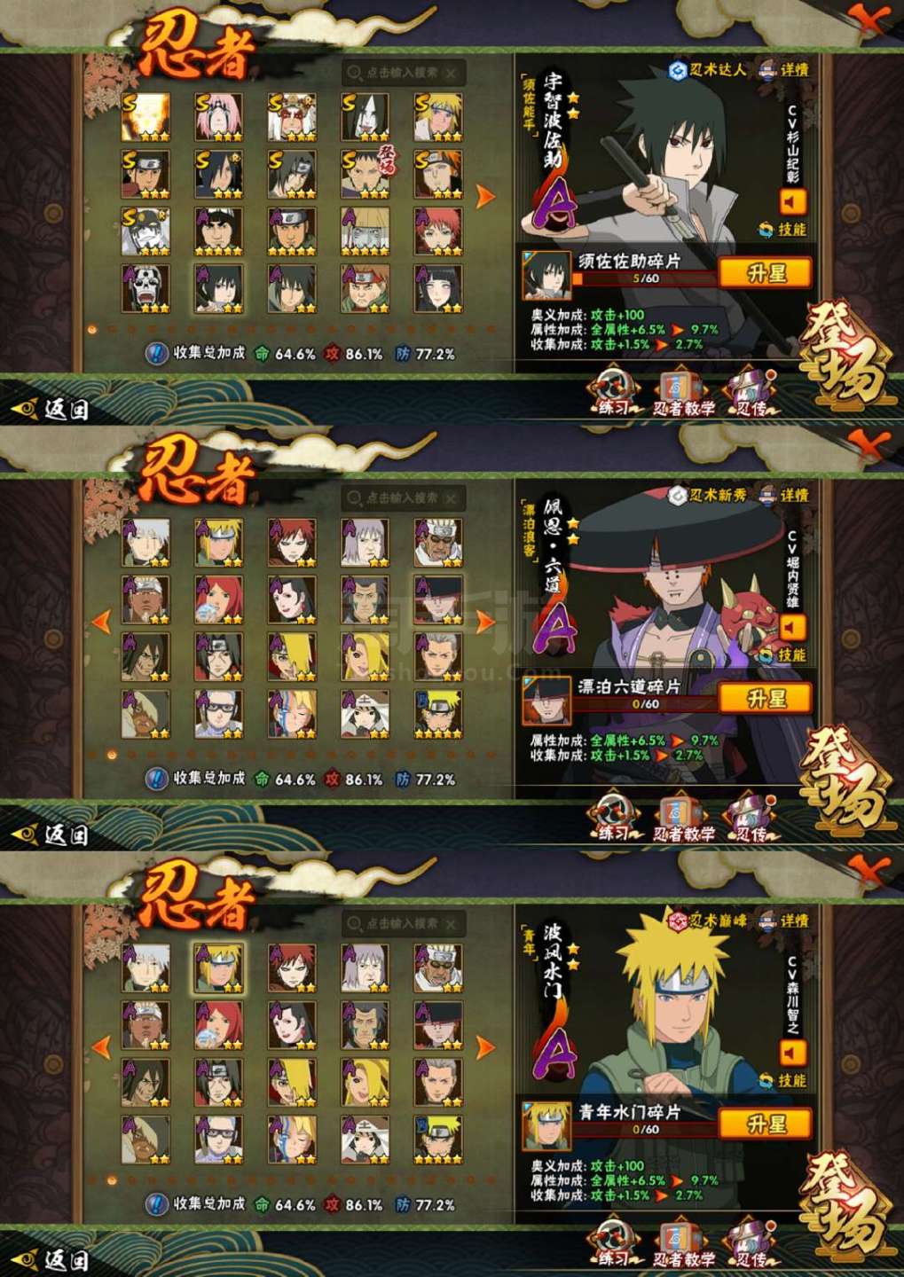 火影忍者【安卓QQ】能二次修改实名认证,号非常安全,自选a忍还未选,解斑舍人红夜快出了,号里都是火影热门强势忍者,看图