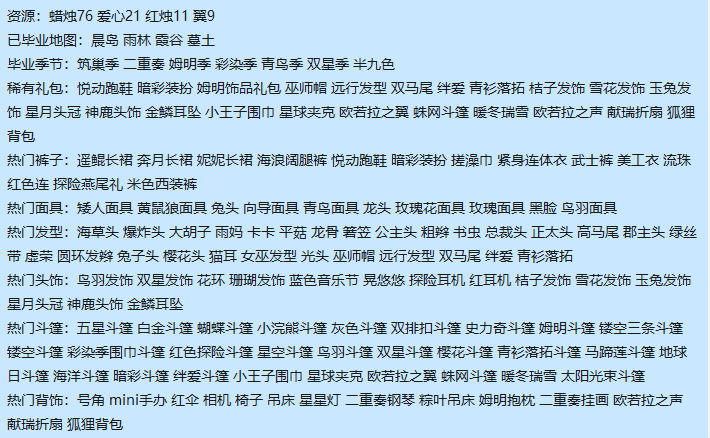 稀有礼包:悦动跑鞋 暗彩装扮 姆明饰品礼包 巫师帽 远行发型 双马尾 绊爱 青衫落拓 桔子发饰 雪花发饰 玉兔发饰 星月头冠 神鹿头饰