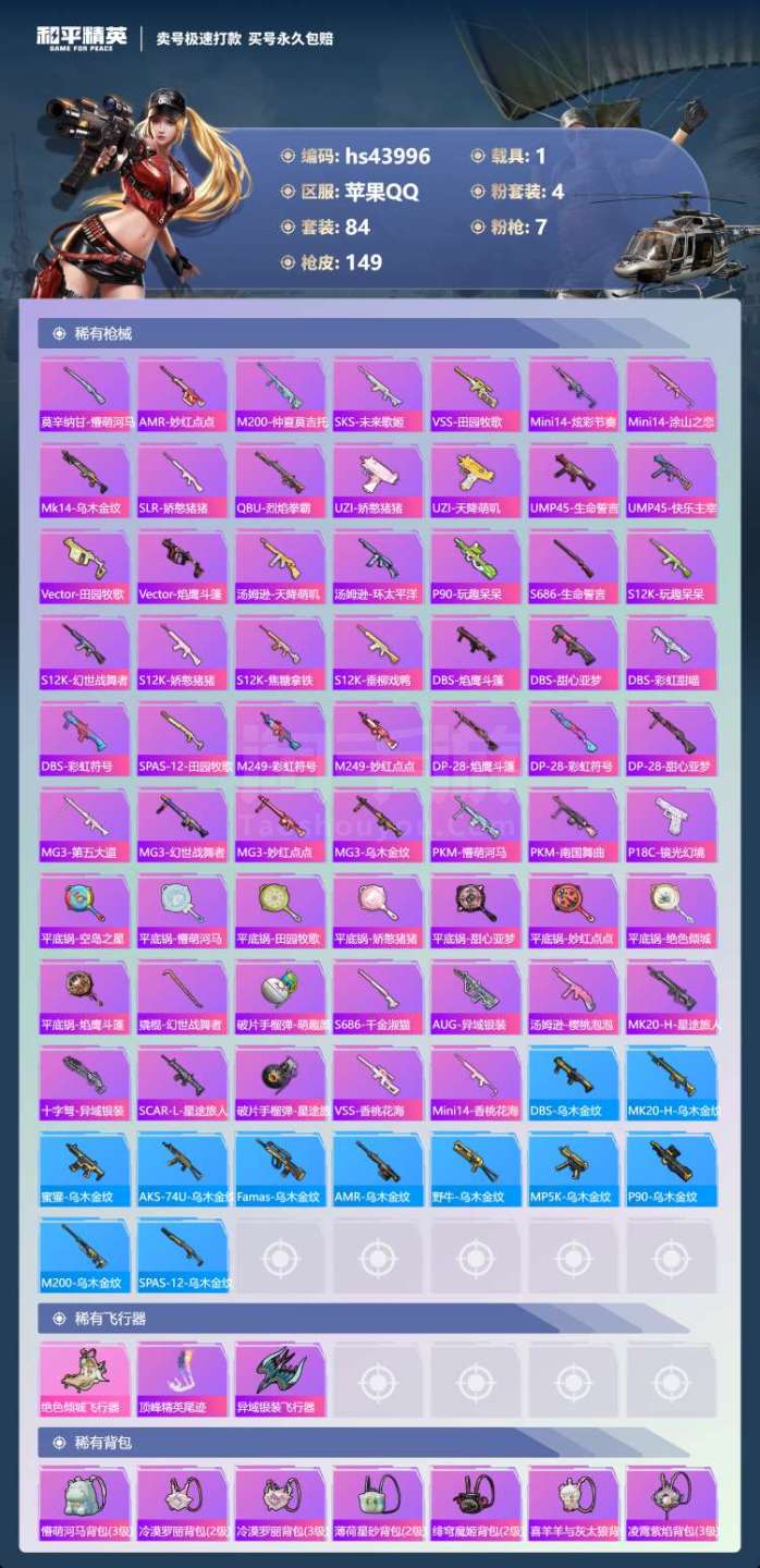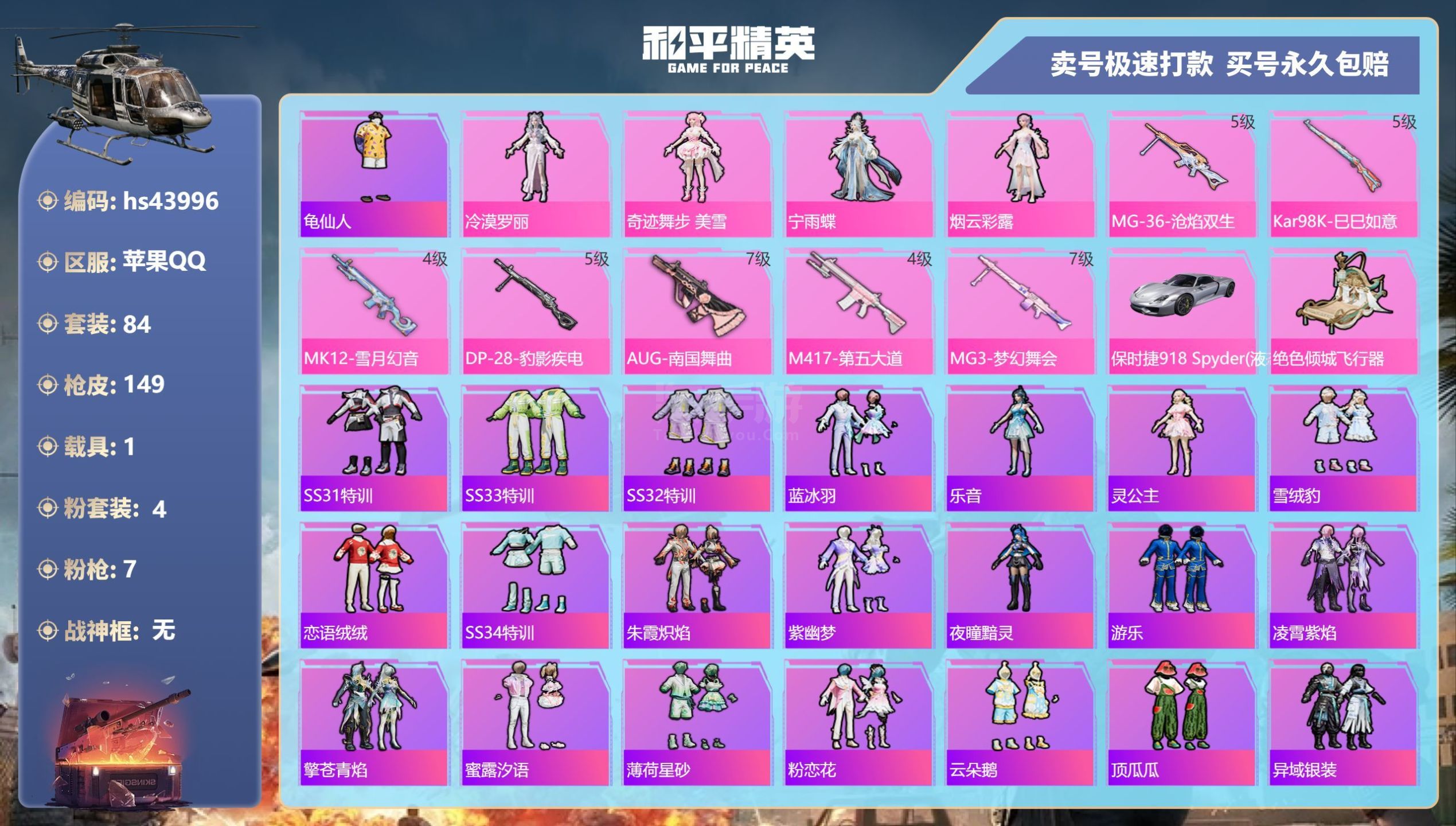 hs43996 苹果手Q-3王牌印记-4粉装-7特效枪-1载具-44783热力值-84套装-149枪