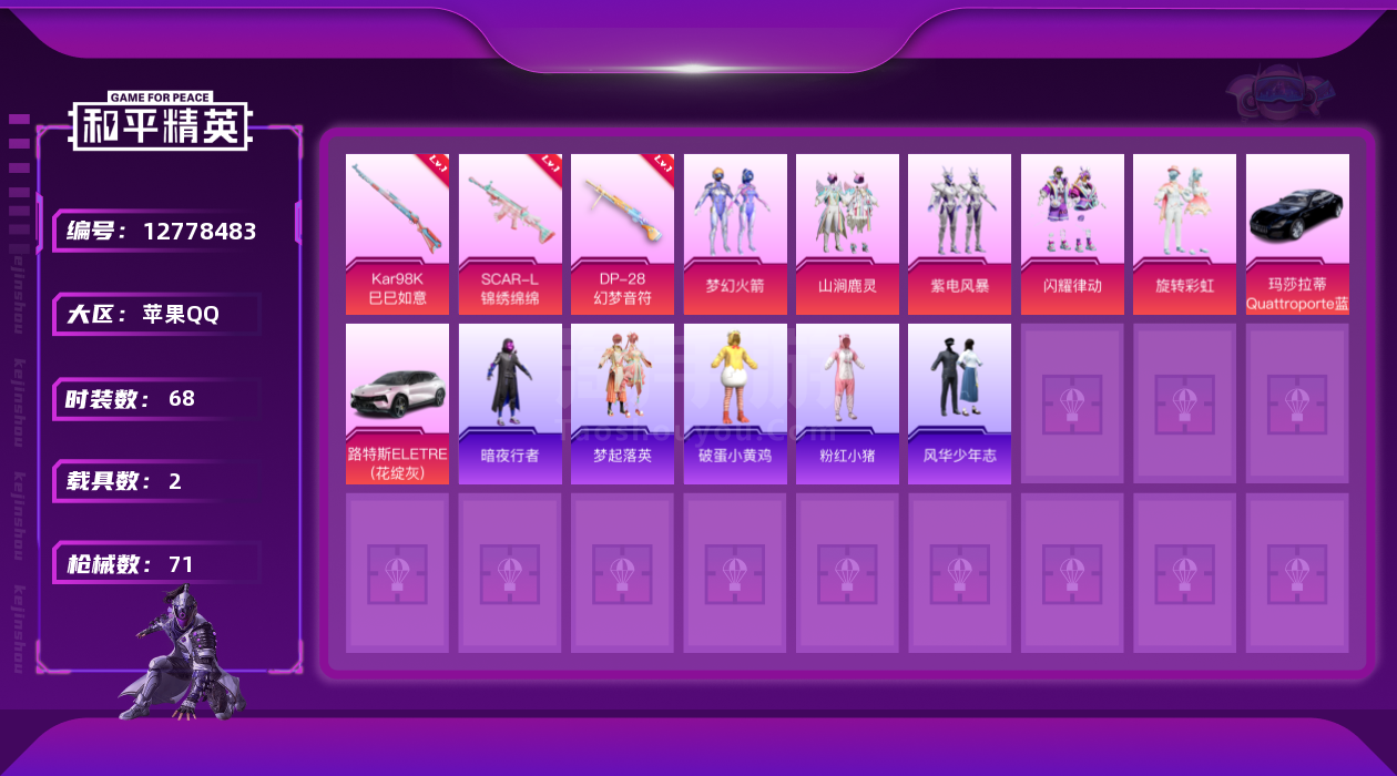 XS510【身法号2载具5粉装3特效枪 梦幻火箭 暗夜行者】苹果Q-27181热力值 2王牌印记 历