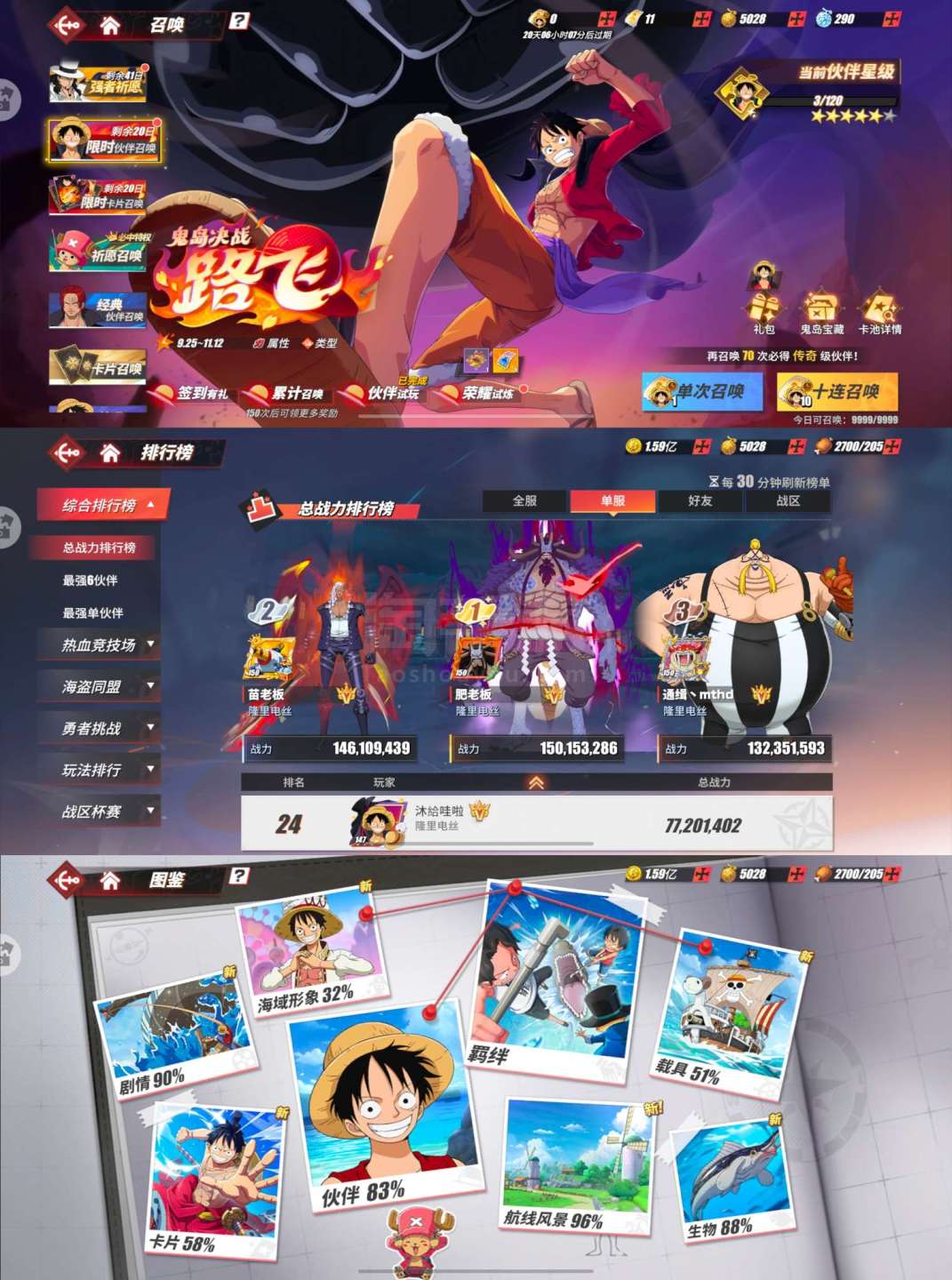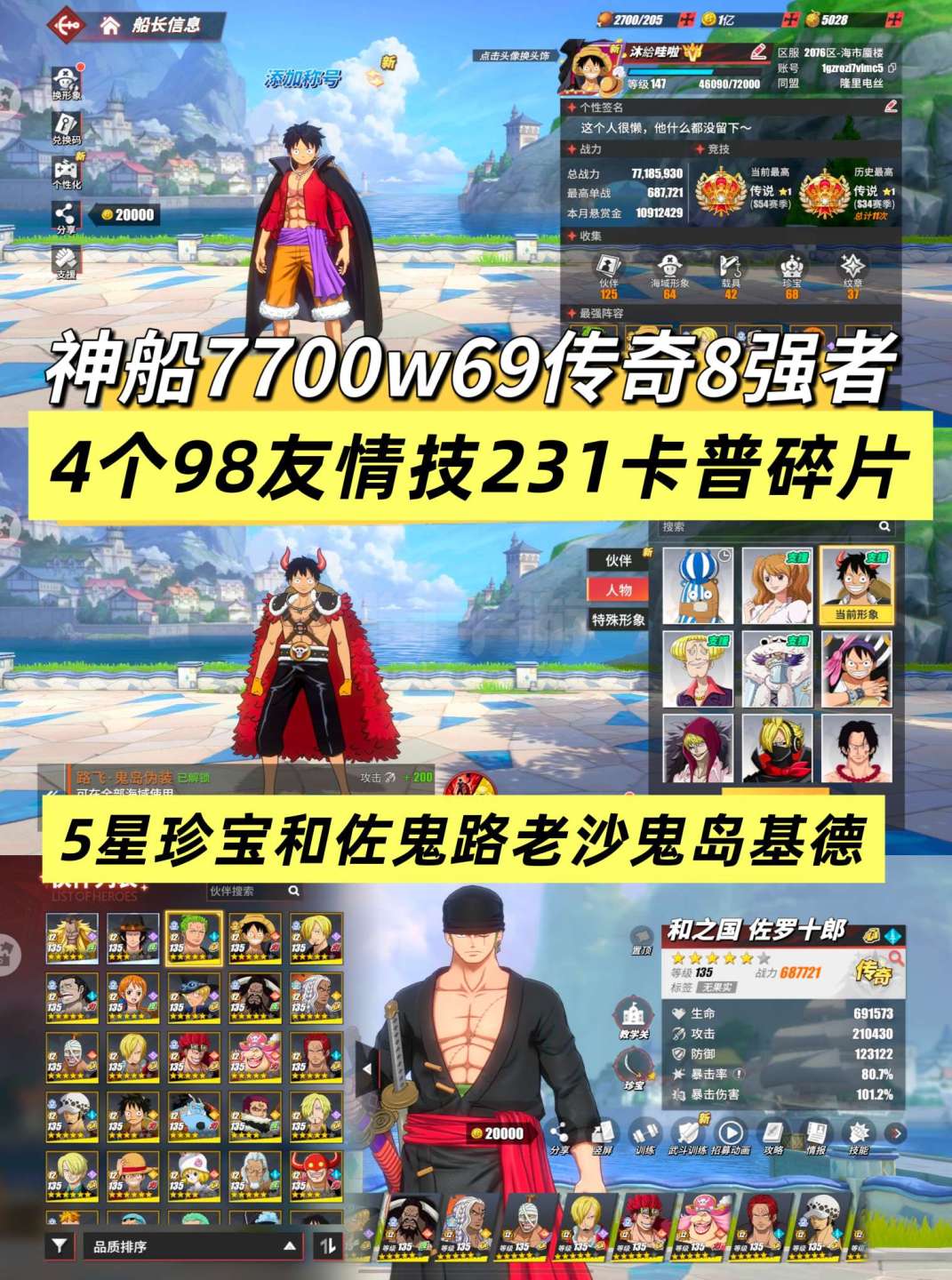 航海王热血航线【安卓华为】神船7700w69传奇8强者四个98友情技,青年卡普231碎片,一盟马上出卡普,单站最高68w五星珍