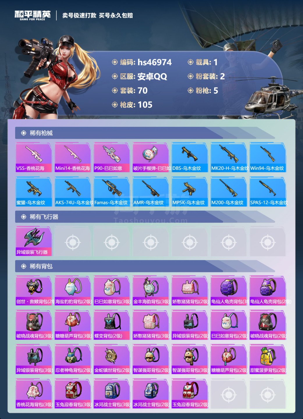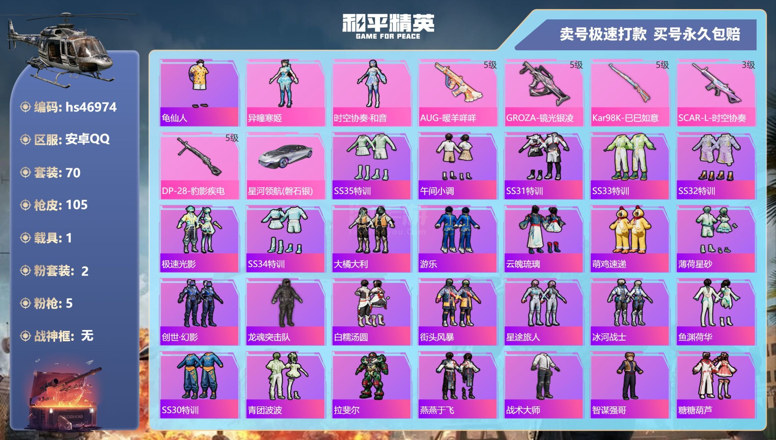 安卓Q-1载具2粉装5特效枪3热门70套装105枪皮 29312热力值 10印记 历史传奇王牌12星