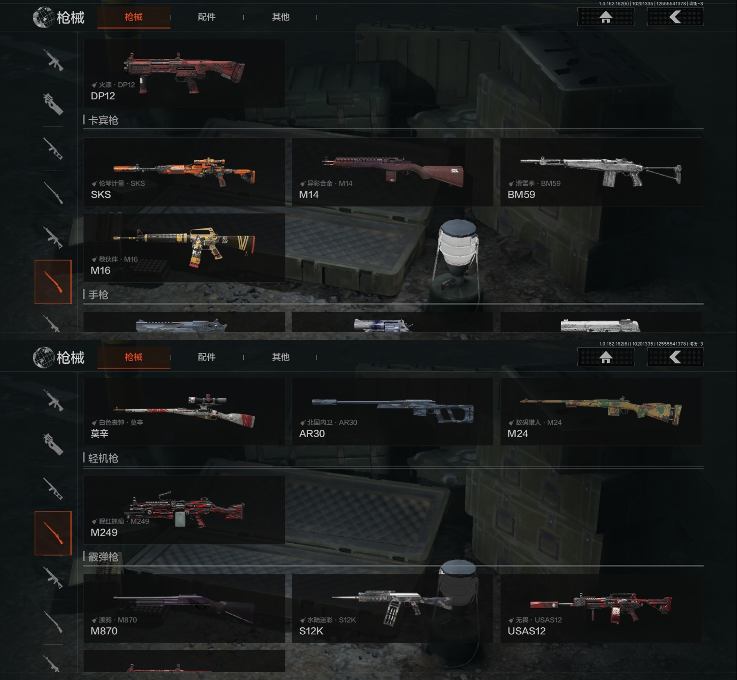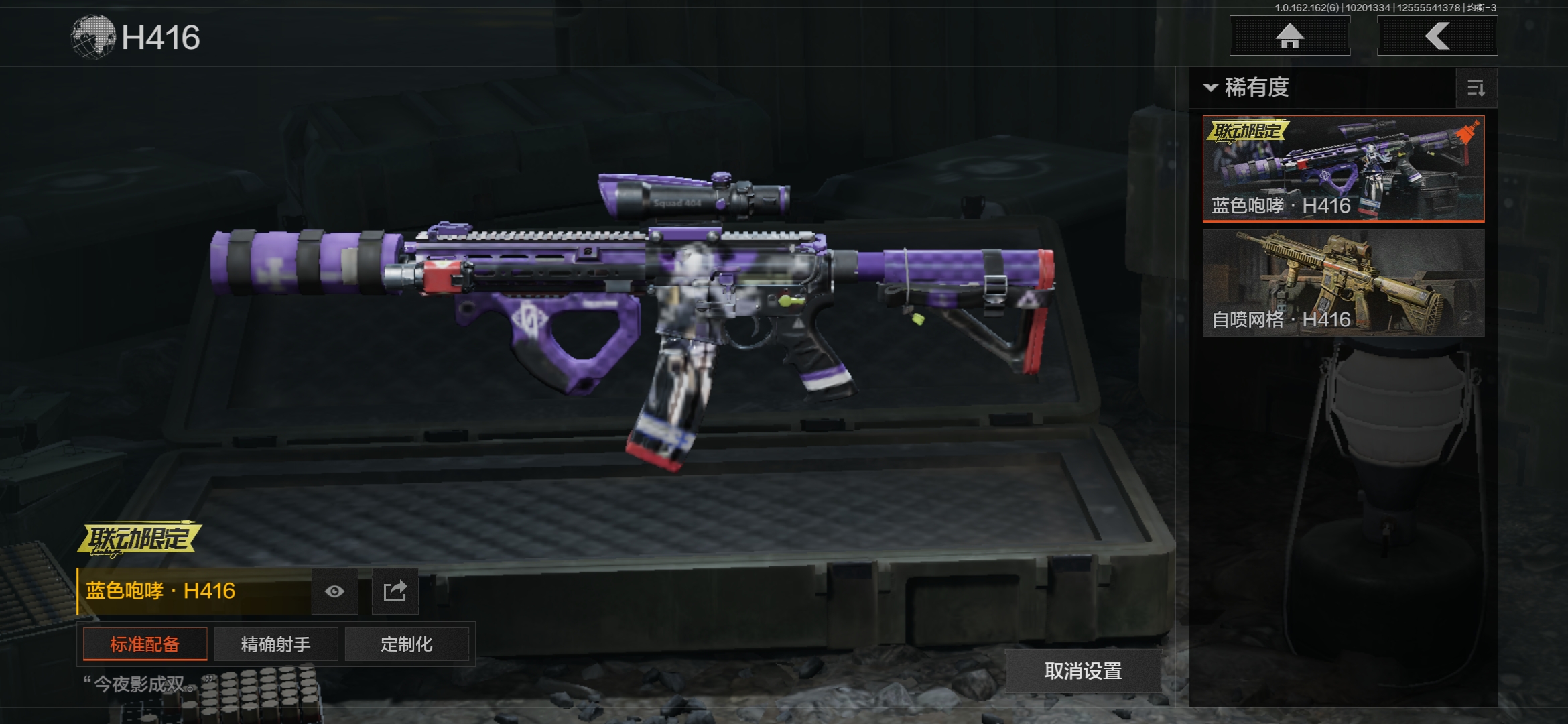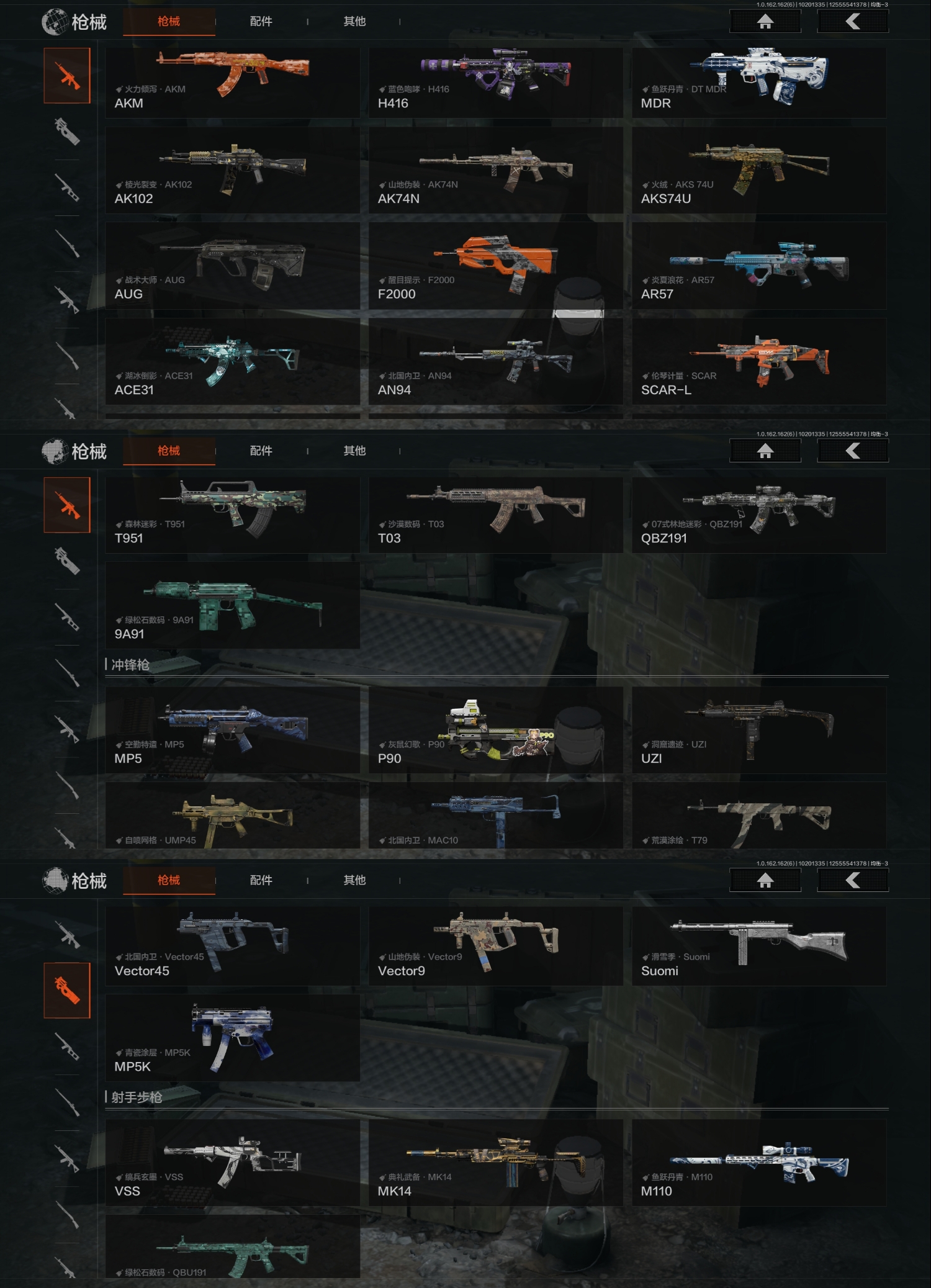 FY5616,近战武器:急袭弯刀,来战·开山刀,角色装扮(紫):少前联动RPK16,都市夜影套装,金色枪皮:蓝色咆哮·H416,紫色枪皮:火力倾泻·AKM,棱光裂变·AK102,湖冰倒影·ACE31,缟兵玄墨·VSS,敬伙伴·M16,山地伪装·AK74N,北国内卫·AN94,安卓Q区实名:可修改