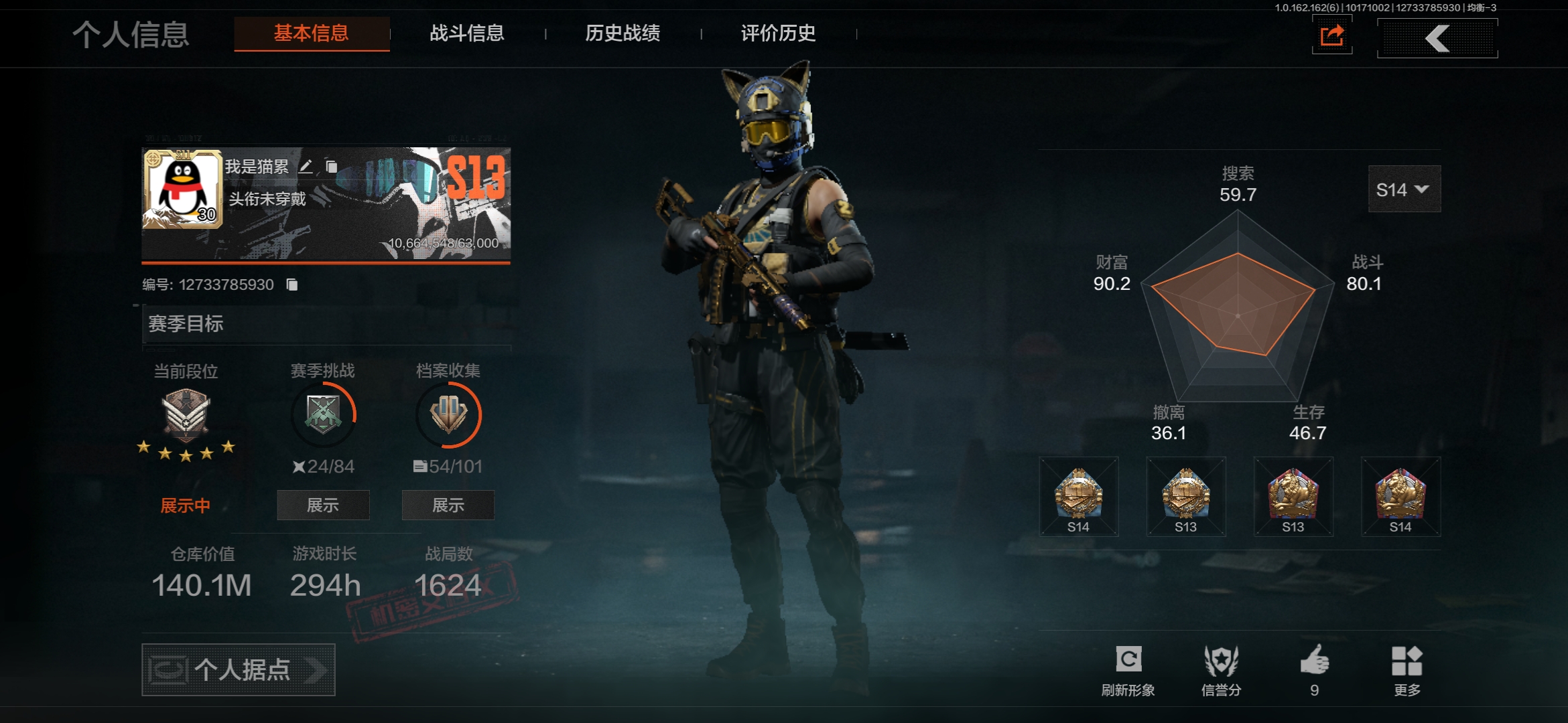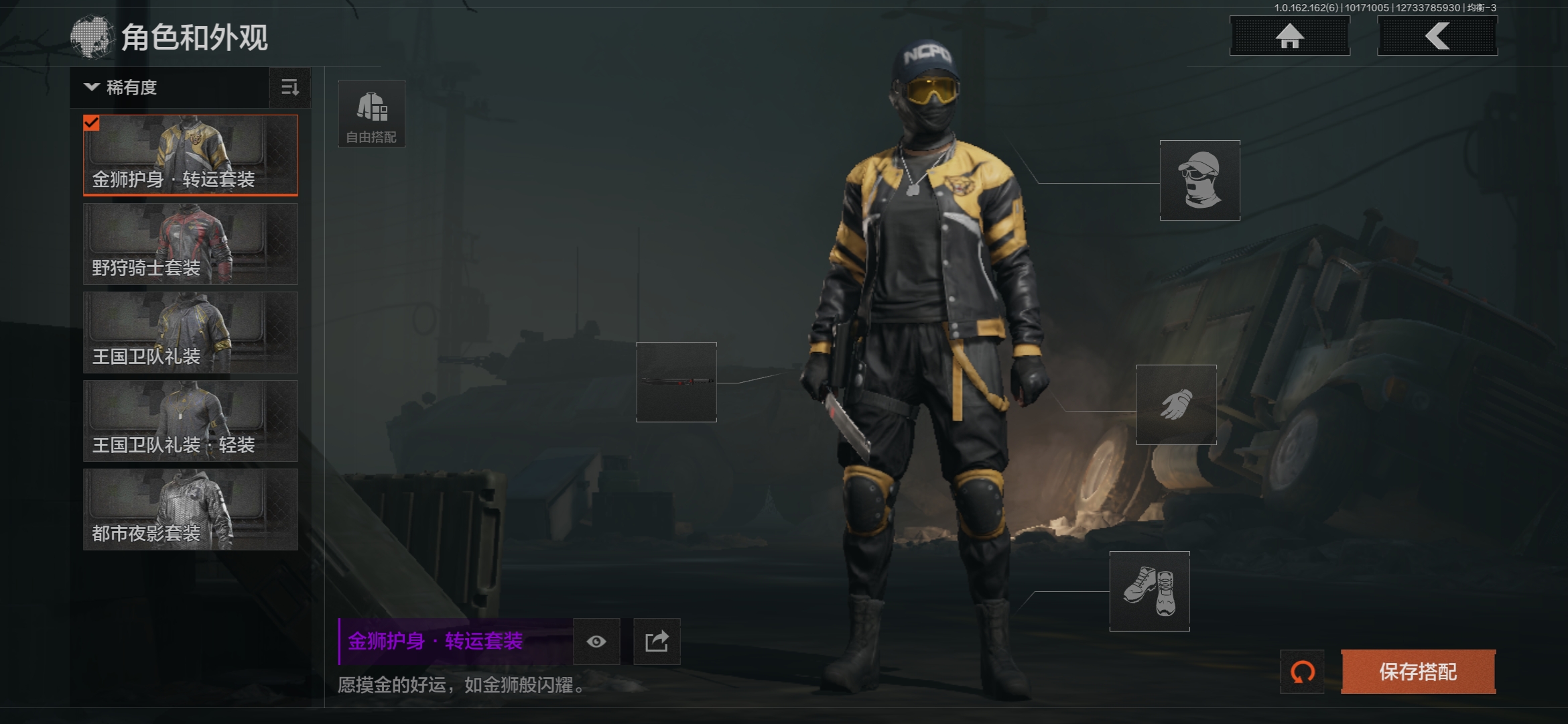 暗区突围【安卓QQ】FY5617,总资产:140m,近战武器:来战·开山刀,角色装扮(紫):金狮护身·转运套装,野狩骑士