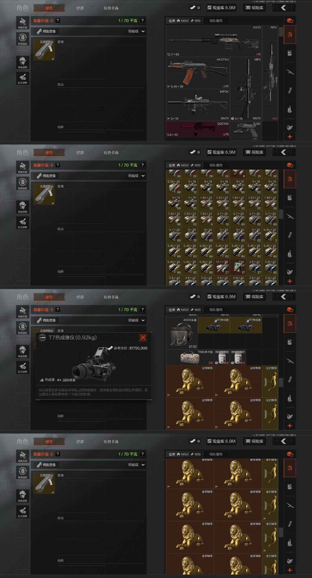 FY5621,总资产:60.3m,近战武器:工兵铲,角色装扮(紫):金狮护身·转运套装,野狩骑士套装,王国卫队礼装,紫色枪皮:猩红羽翼·VSS,秘域鎏金·RPK16,来战·AK74N,典礼武备·MK14,大金:T7热成像,金狮子,古董茶壶,盛宴雕像,保险箱,安卓Q区实名:可修改