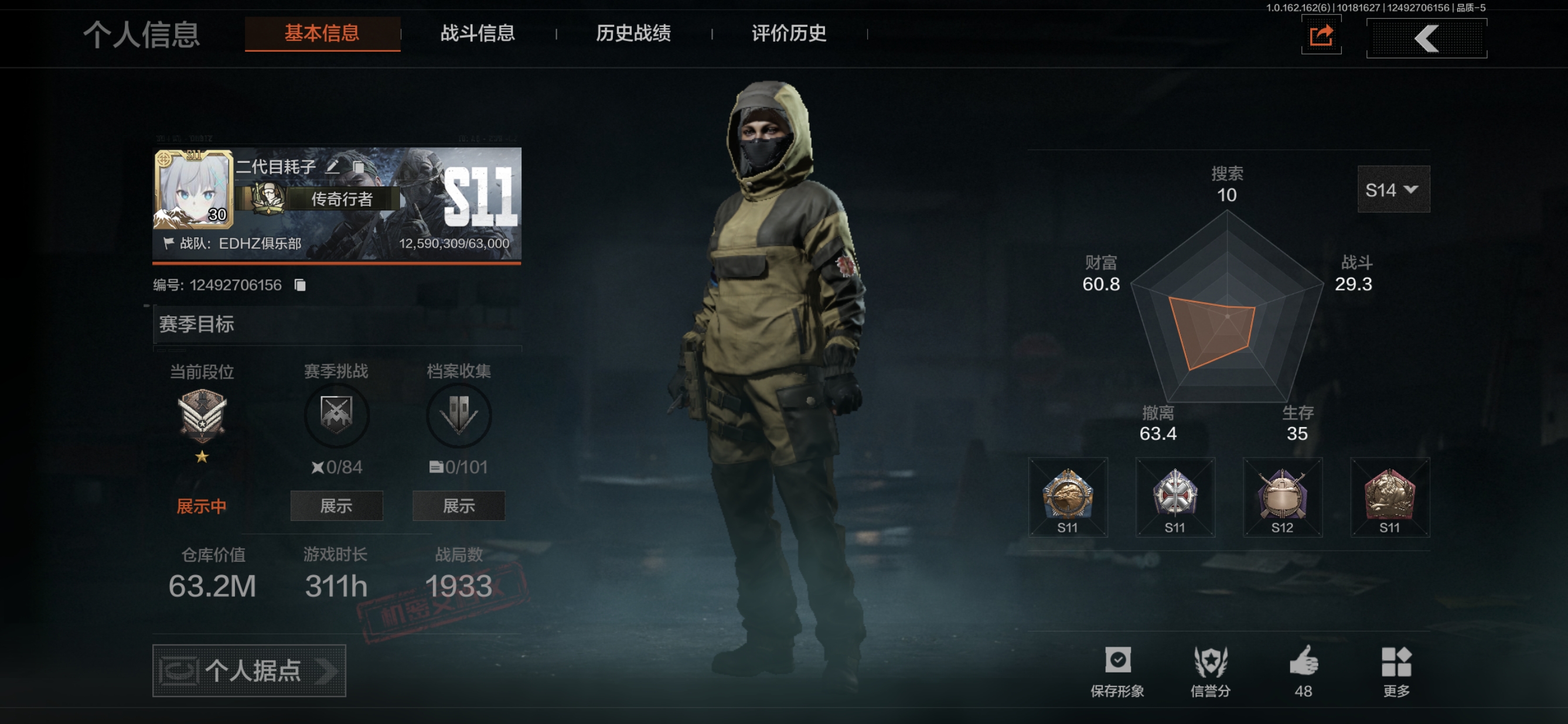 暗区突围【安卓QQ】FY5624,总资产:63m,近战武器:工兵铲,角色装扮(紫):少前联动-AN94,三周年卫衣,都市