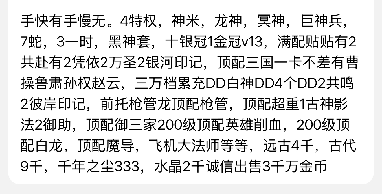4特权,神米,龙神,冥神,巨神兵,7蛇,3一时,黑神套,十银冠1金冠v13,满配贴贴有2共赴有2凭依2万圣2银河印记,顶配三国一卡不差有曹操鲁肃孙权赵云,三万档累充DD白神DD4个DD2共鸣2彼岸印记