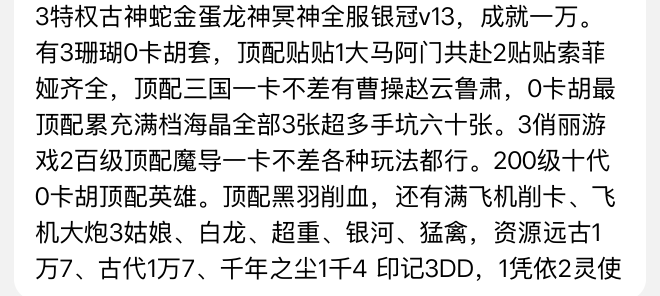 3特权古神蛇金蛋龙神冥神全服银冠v13,成就一万。有3珊瑚0卡胡套,顶配贴贴1大马阿门共赴2贴贴索菲娅齐全,顶配三国一卡不差有曹操赵云鲁肃,0卡胡顶配累充满档海晶,千年尘1千4 印记3DD1凭依2灵使