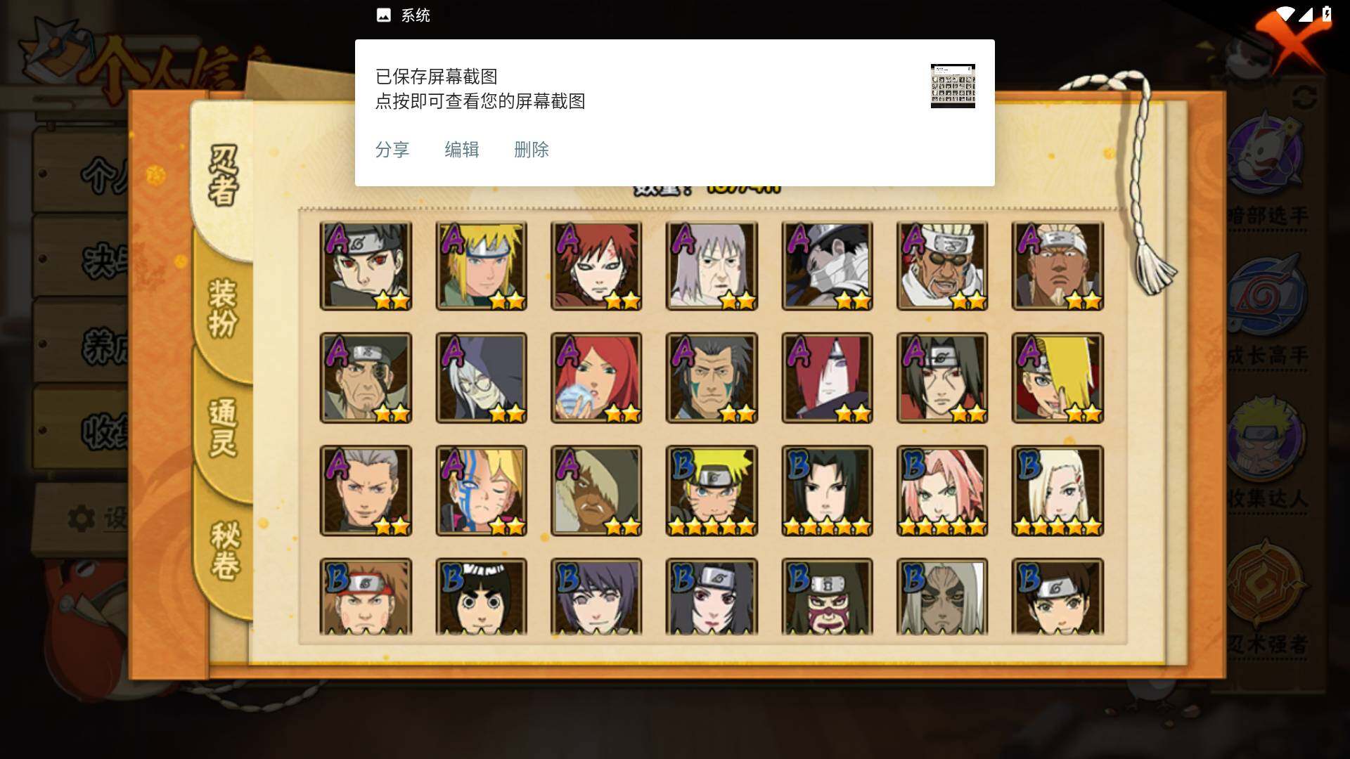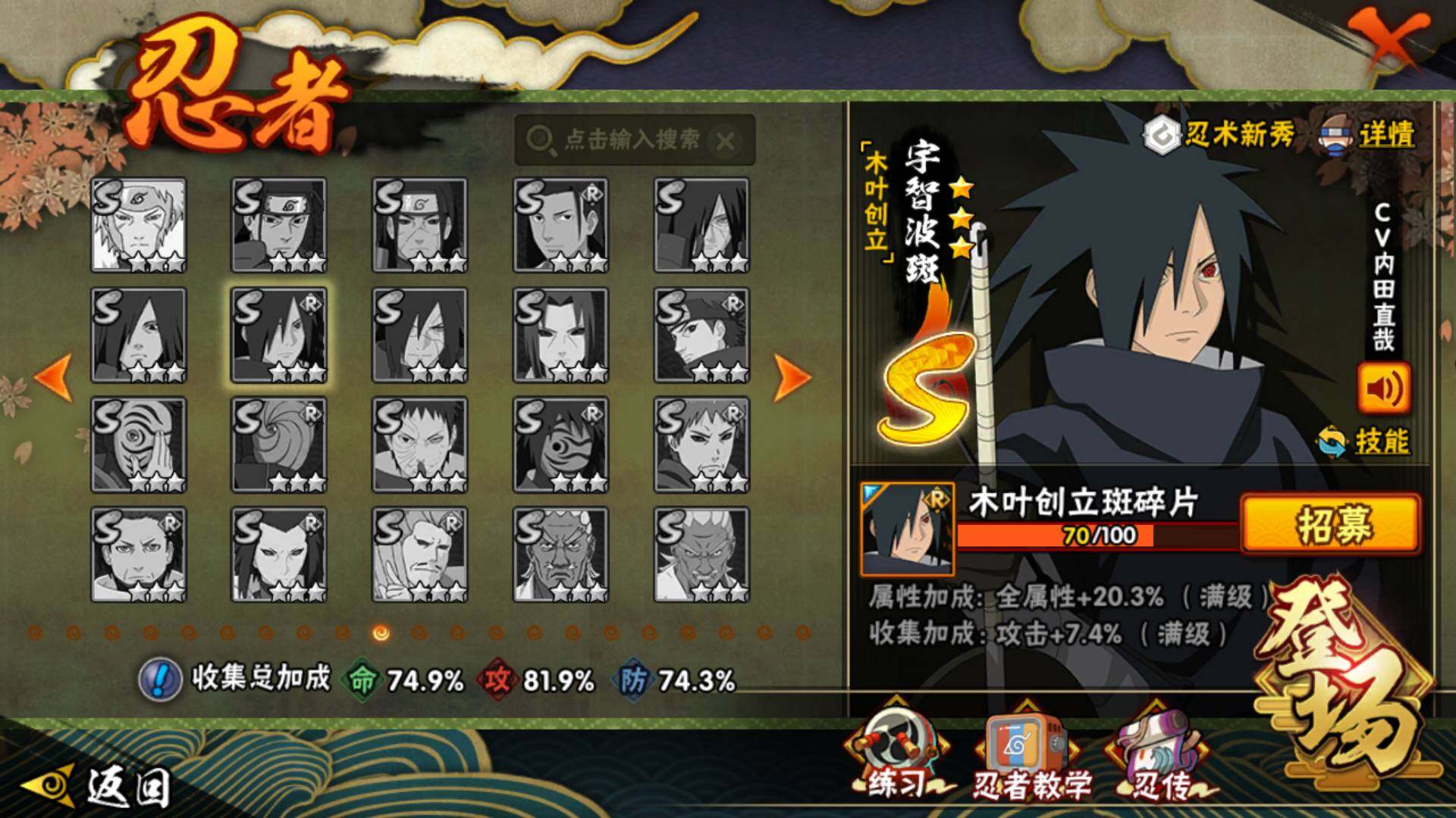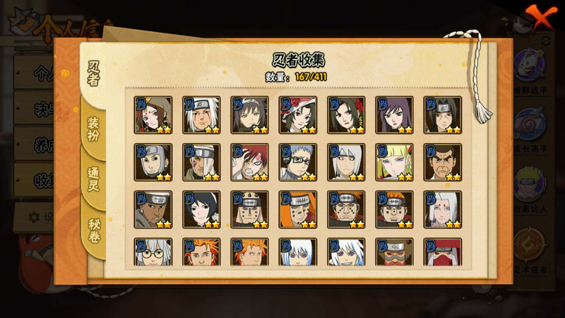 【S级忍者】:宇智波鼬「须佐能乎」(3星),自来也「舞之豪杰」(3星),大蛇丸(3星),自来也「传说中的三忍」(3星),波风水门(3星),漩涡鸣人「九喇嘛连结」(3星),佩恩「天道」(3星),宇智波佐助「永恒万花筒」(3星),宇智波斑 「白面具」(3星宇智波斑「白面具」)