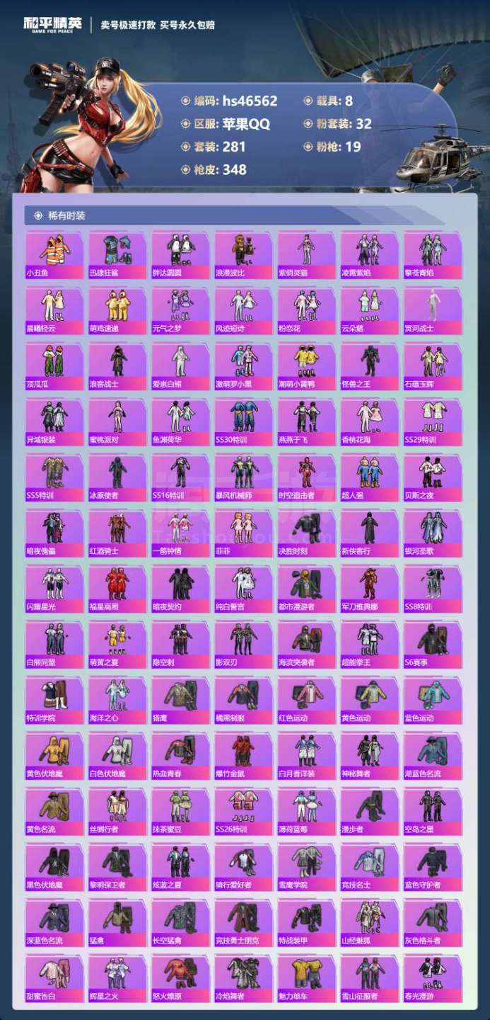 hs46562 苹果手Q-22王牌印记-有战神框-32粉装-19特效枪-8载具-155265热力值-