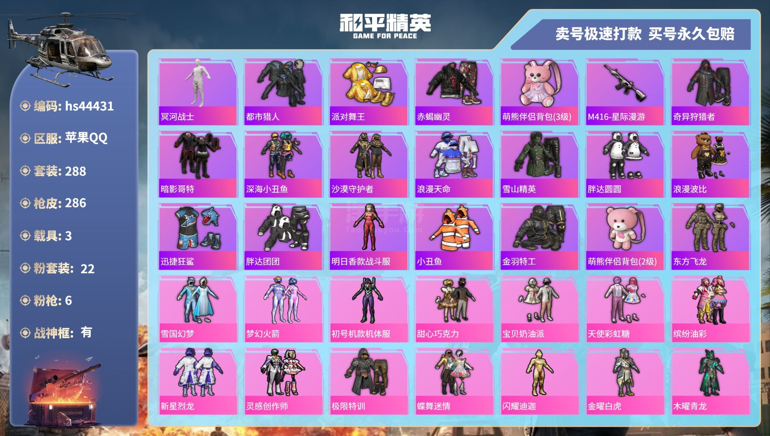 hs44431 苹果手Q-10王牌印记-有战神框-22粉装-6特效枪-3载具-115637热力值-2