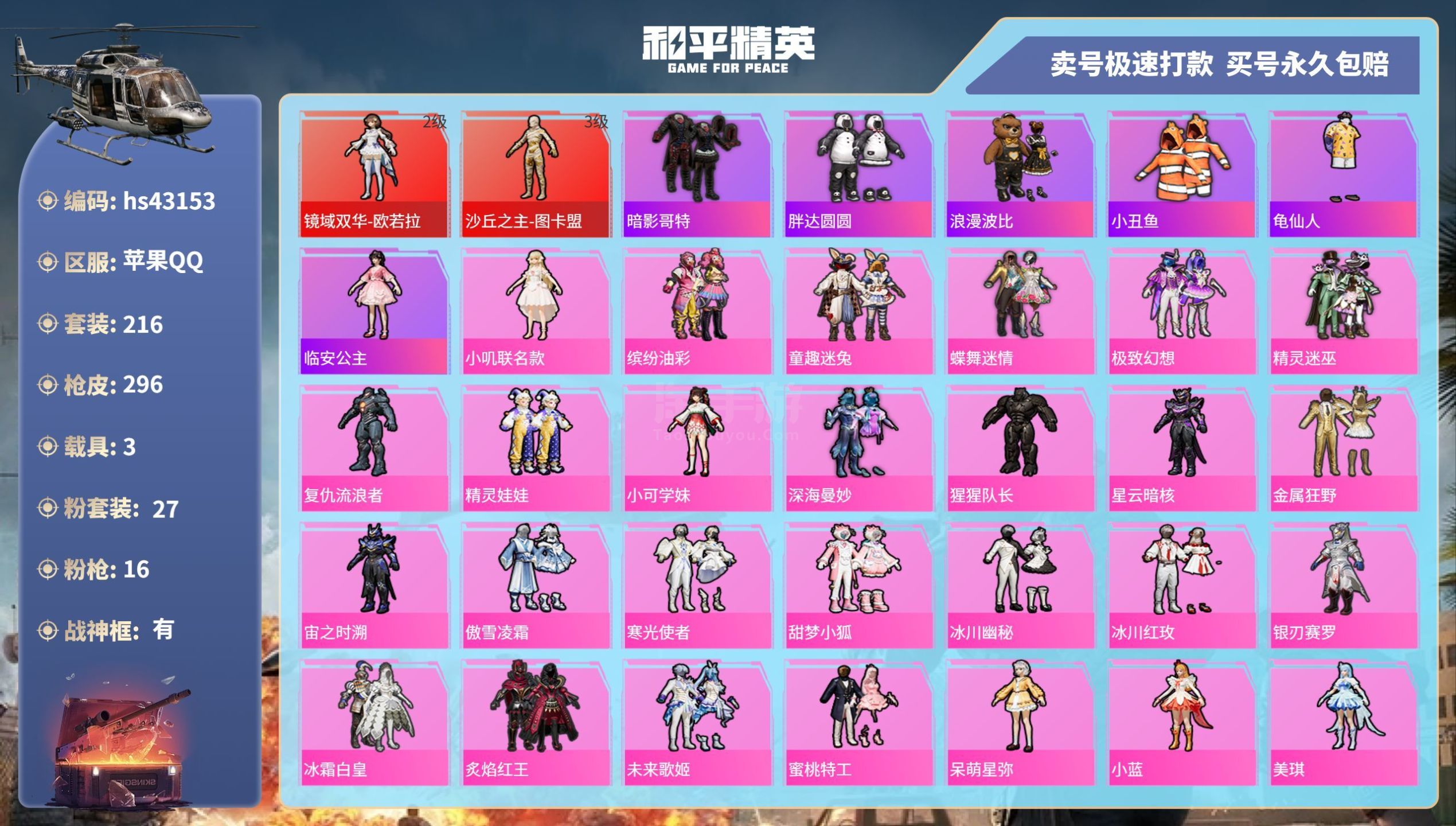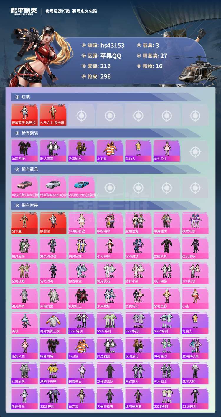 hs43153 苹果手Q-21王牌印记-有战神框-27粉装-16特效枪-3载具-113229热力值-