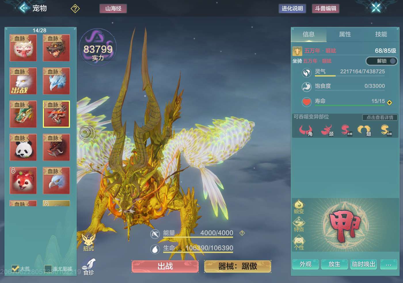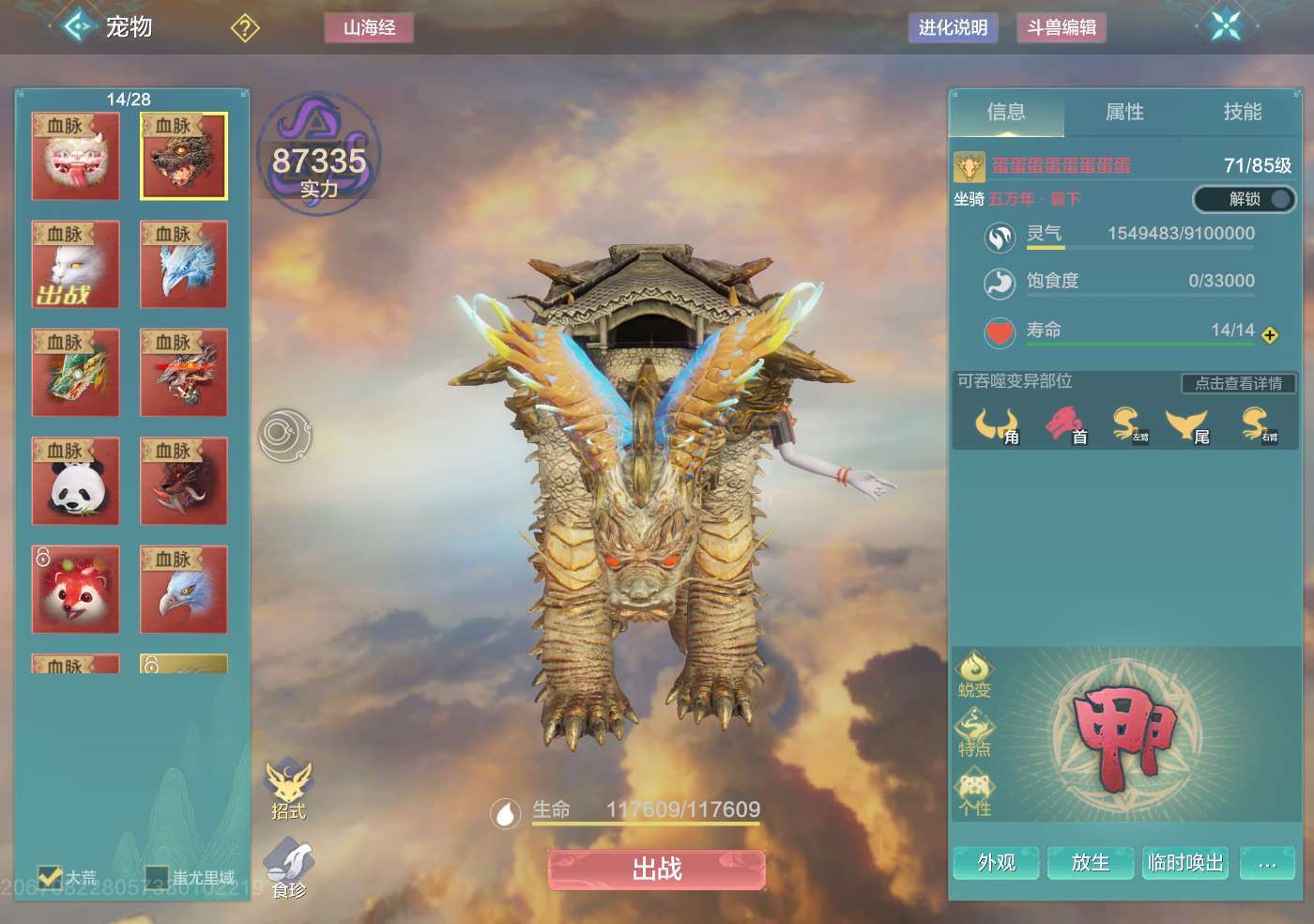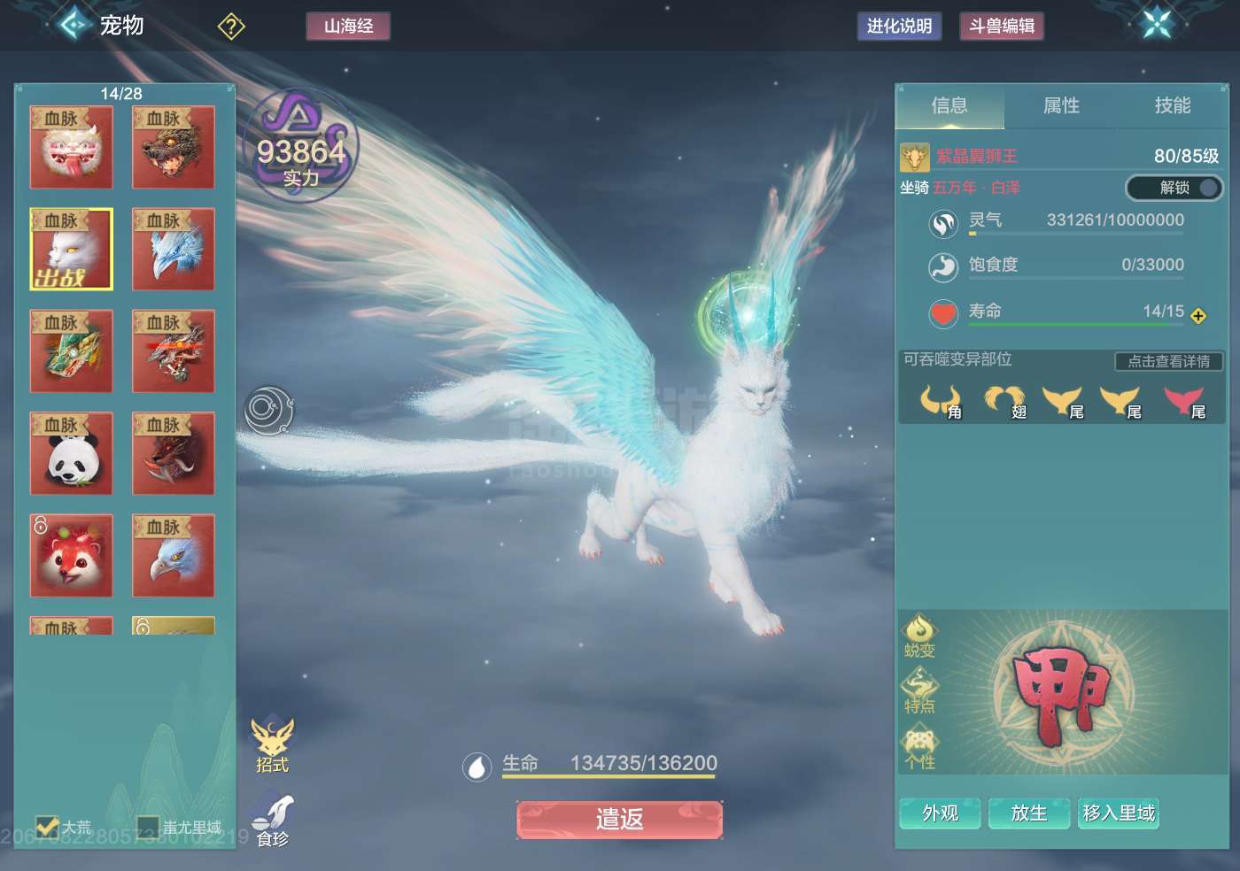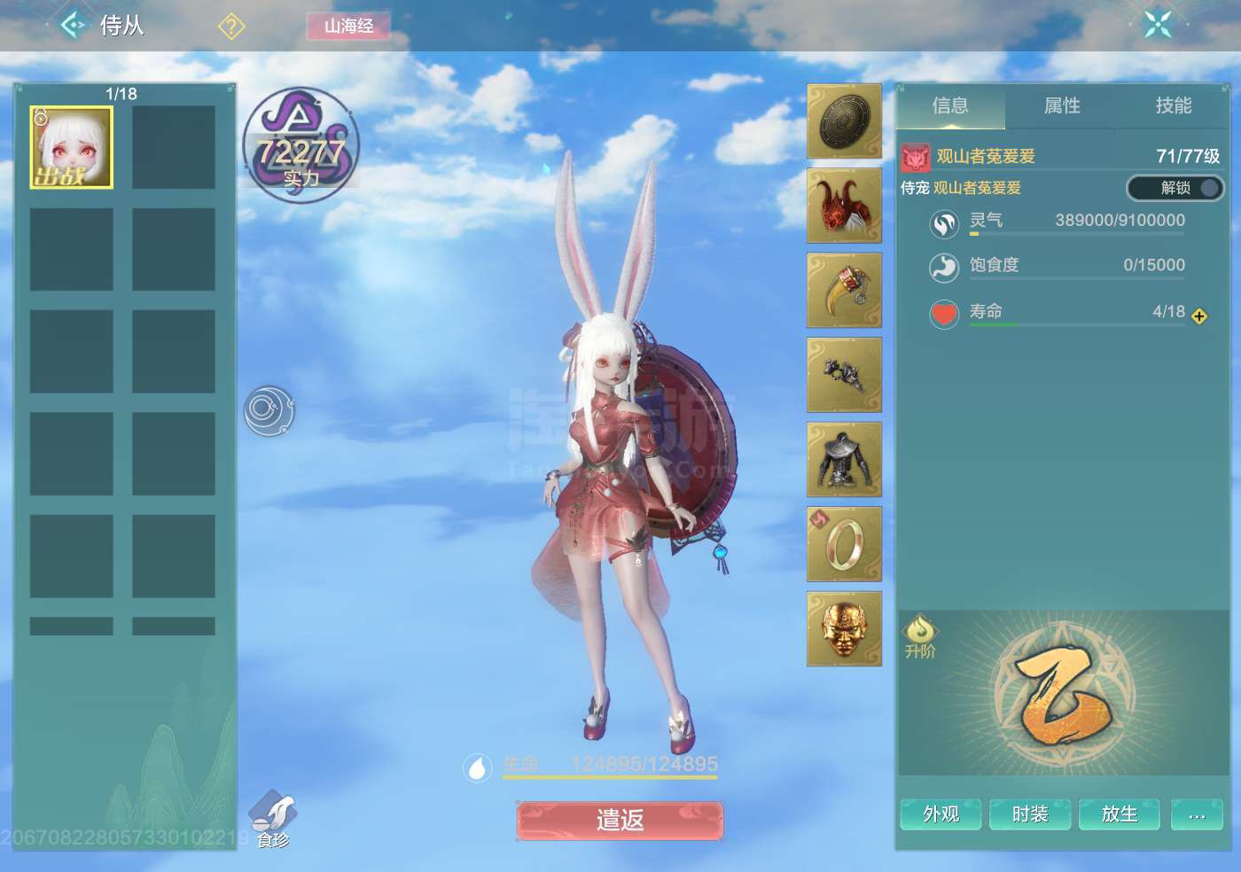 妄想山海【安卓QQ】11万战力,8个五万年宠物,侍从兔媛媛,风攻击2300,有红装,详细请看图