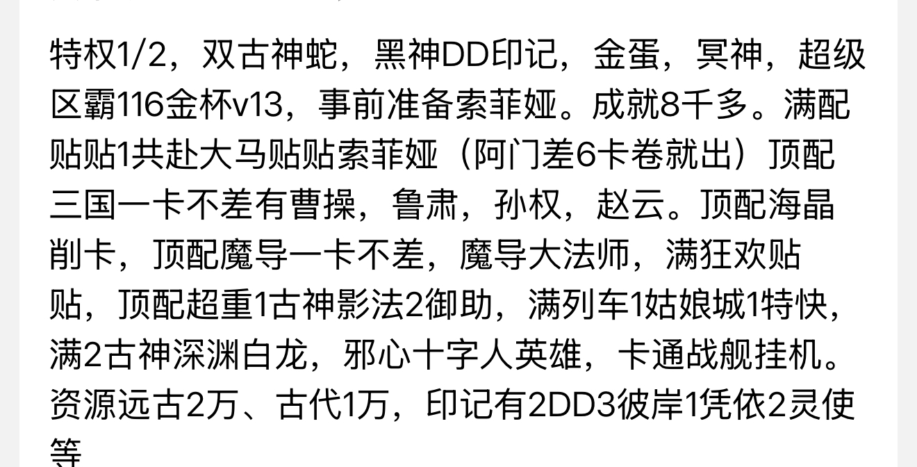 特权1/2,双古神蛇,黑神DD印记,金蛋,冥神,超级区霸116金杯v13,事前准备索菲娅。成就8千多。满配贴贴1共赴大马贴贴索菲娅(阿门差6卡卷就出)顶配三国一卡不差有曹操,鲁肃,孙权,赵云。顶配海晶