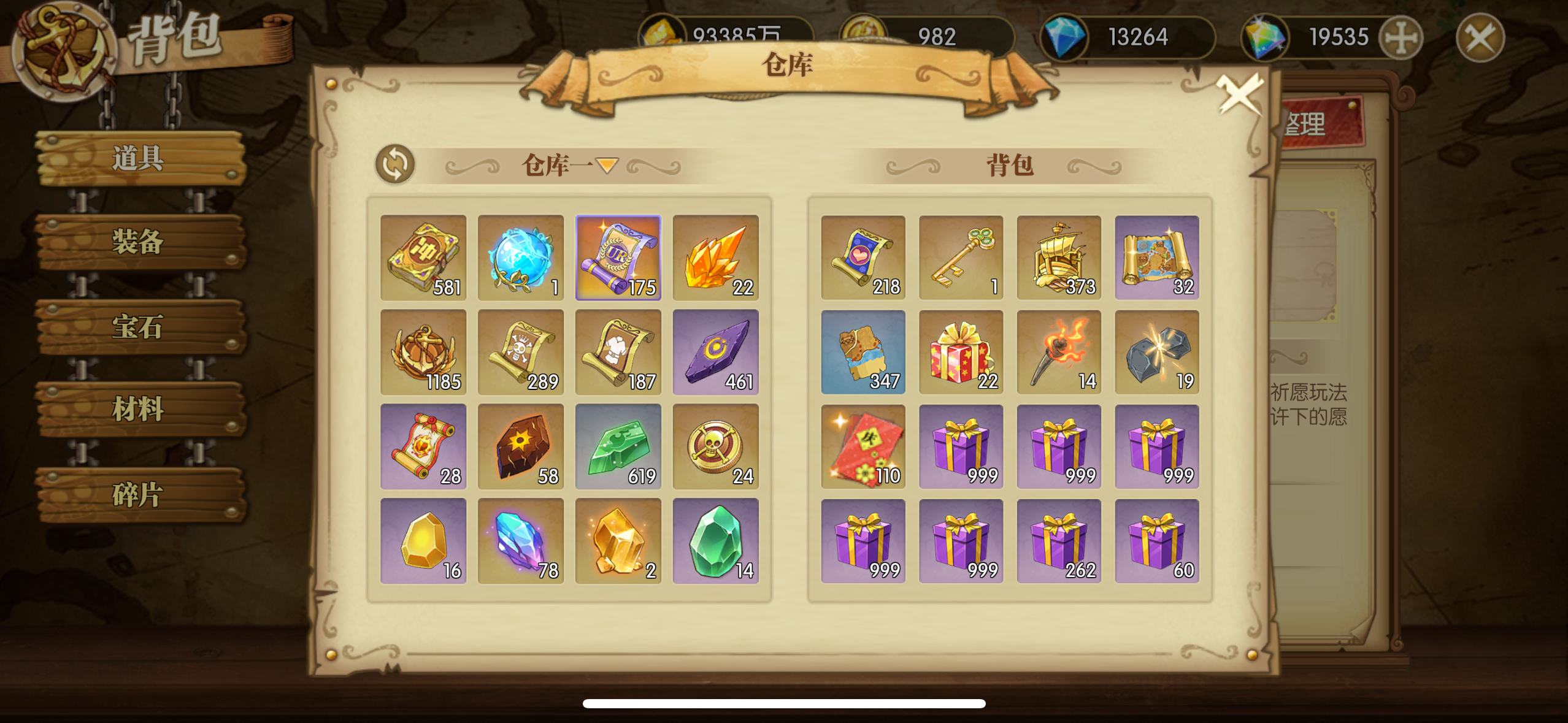 家园8200,装备卷,UR卷,月卡宝库,藏宝图,祀愿卷,船团章等多个,资源持续上升。。。