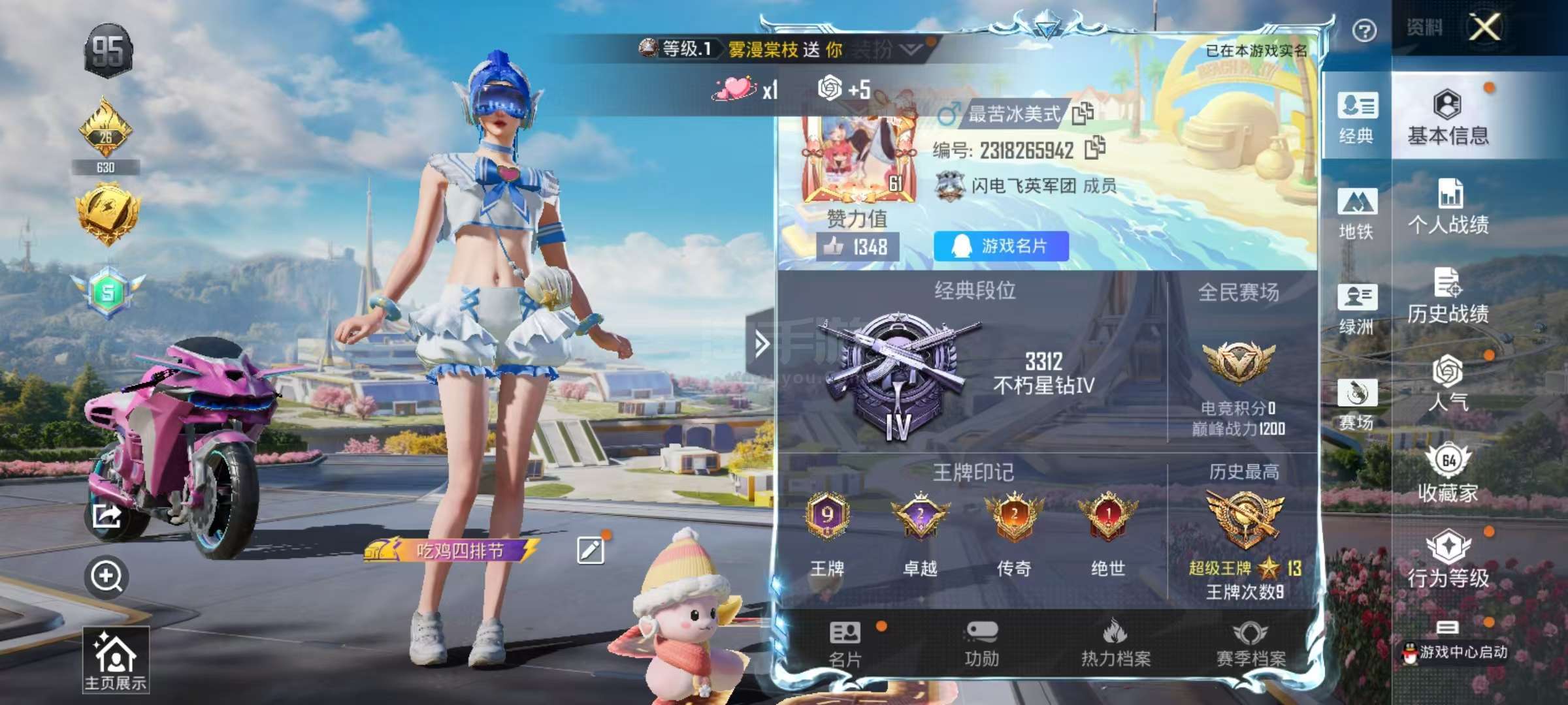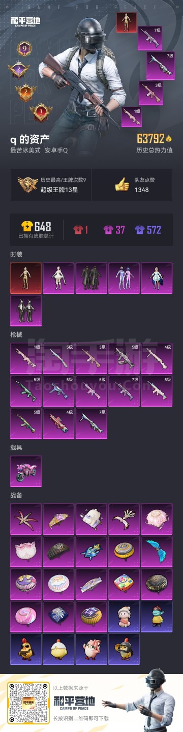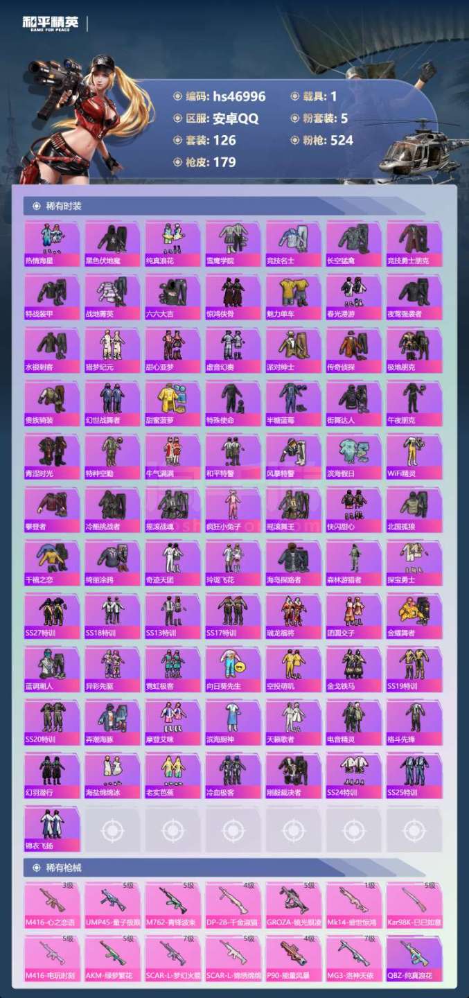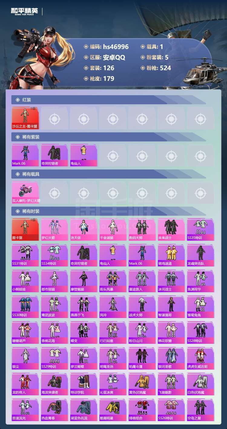 安卓手Q-9王牌印记-1红装-5粉装-13特效枪-1载具-63812热力值-126套装-179枪皮-