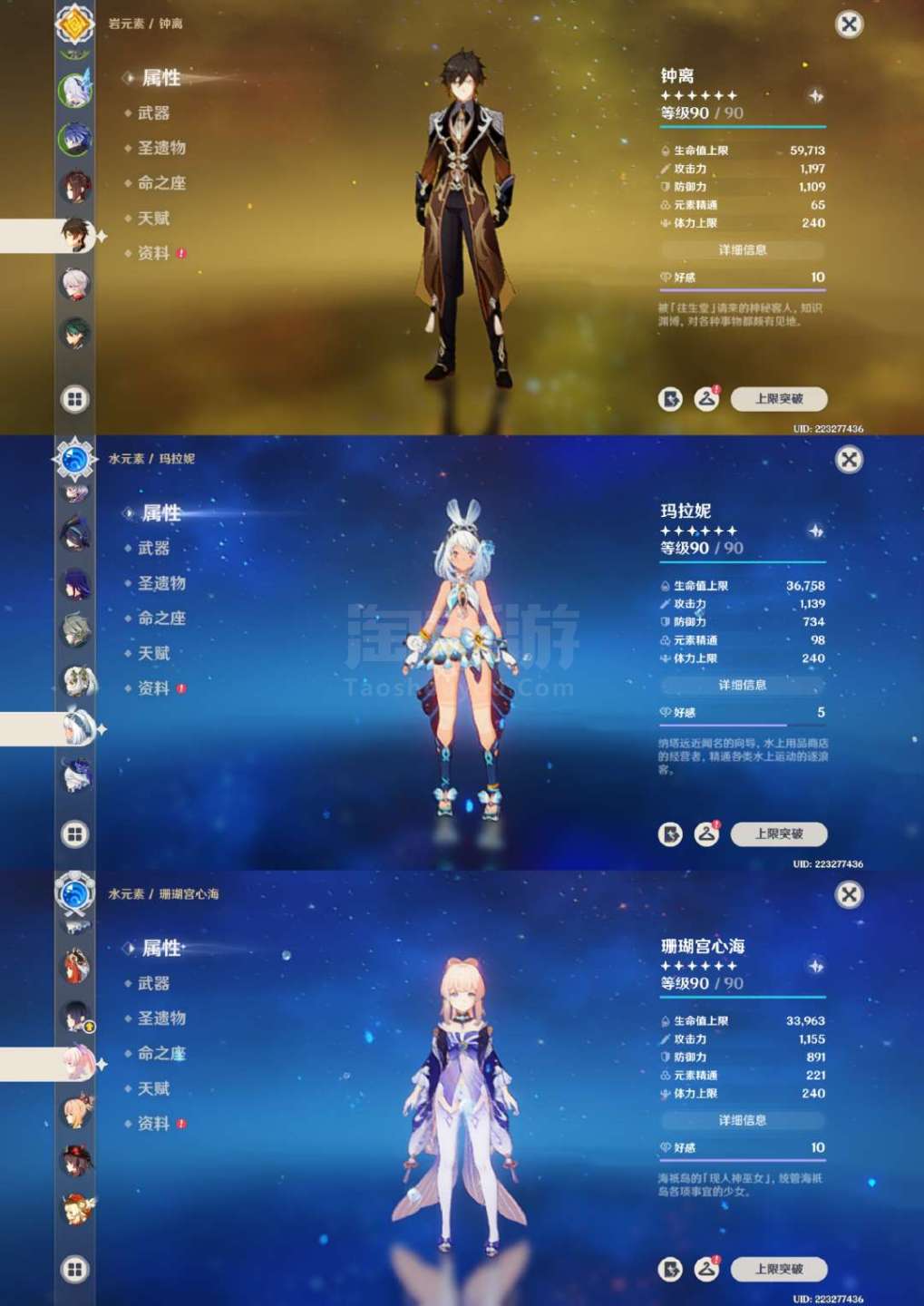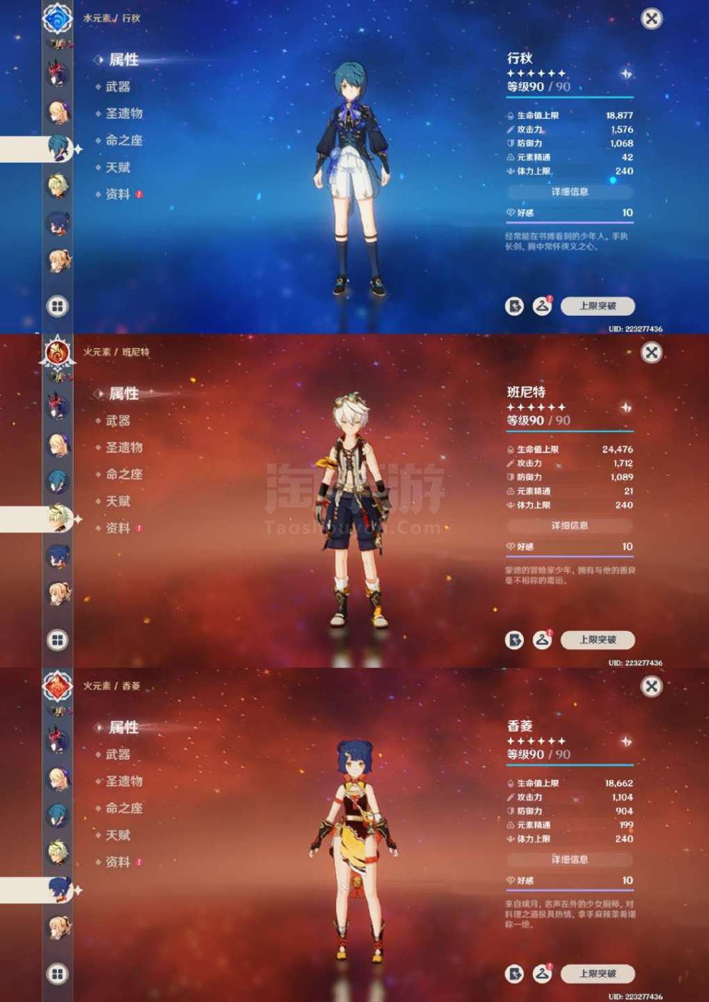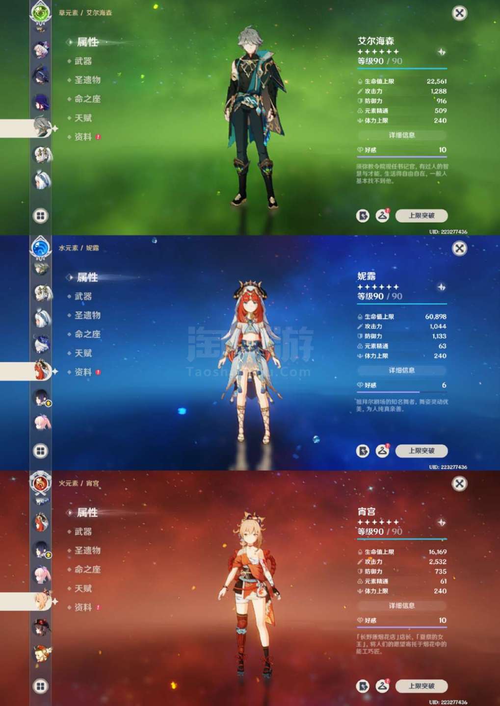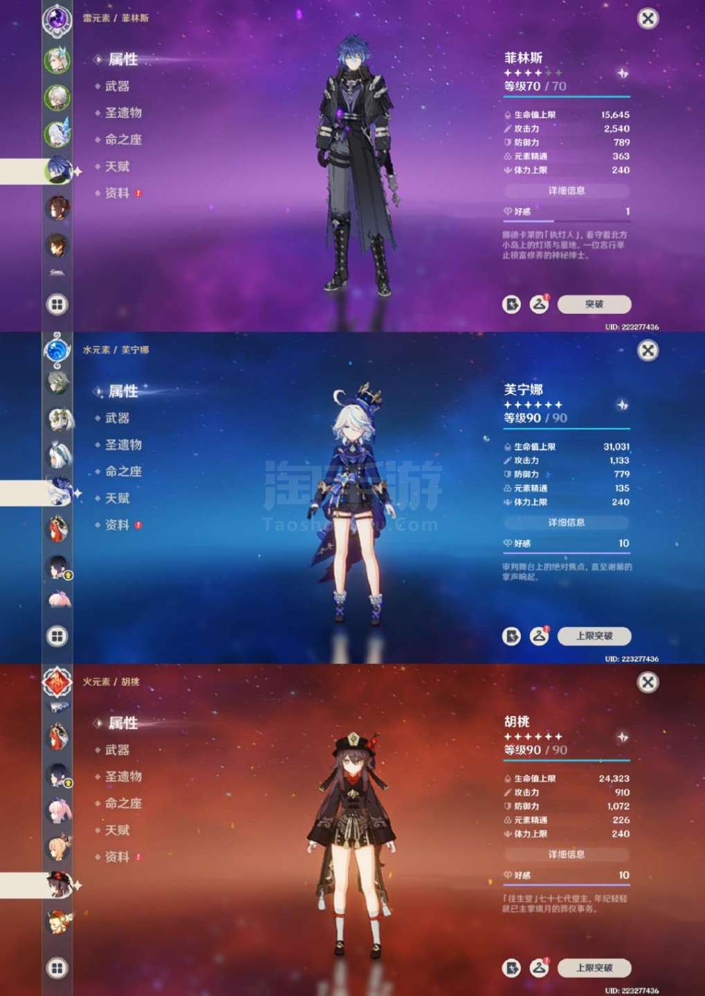 原神【安卓官方】草神2命带专武,龙王克洛琳德1命带专武,夜兰万叶胡桃带专武,具体情况看图,号里专武很多,圣遗物都有