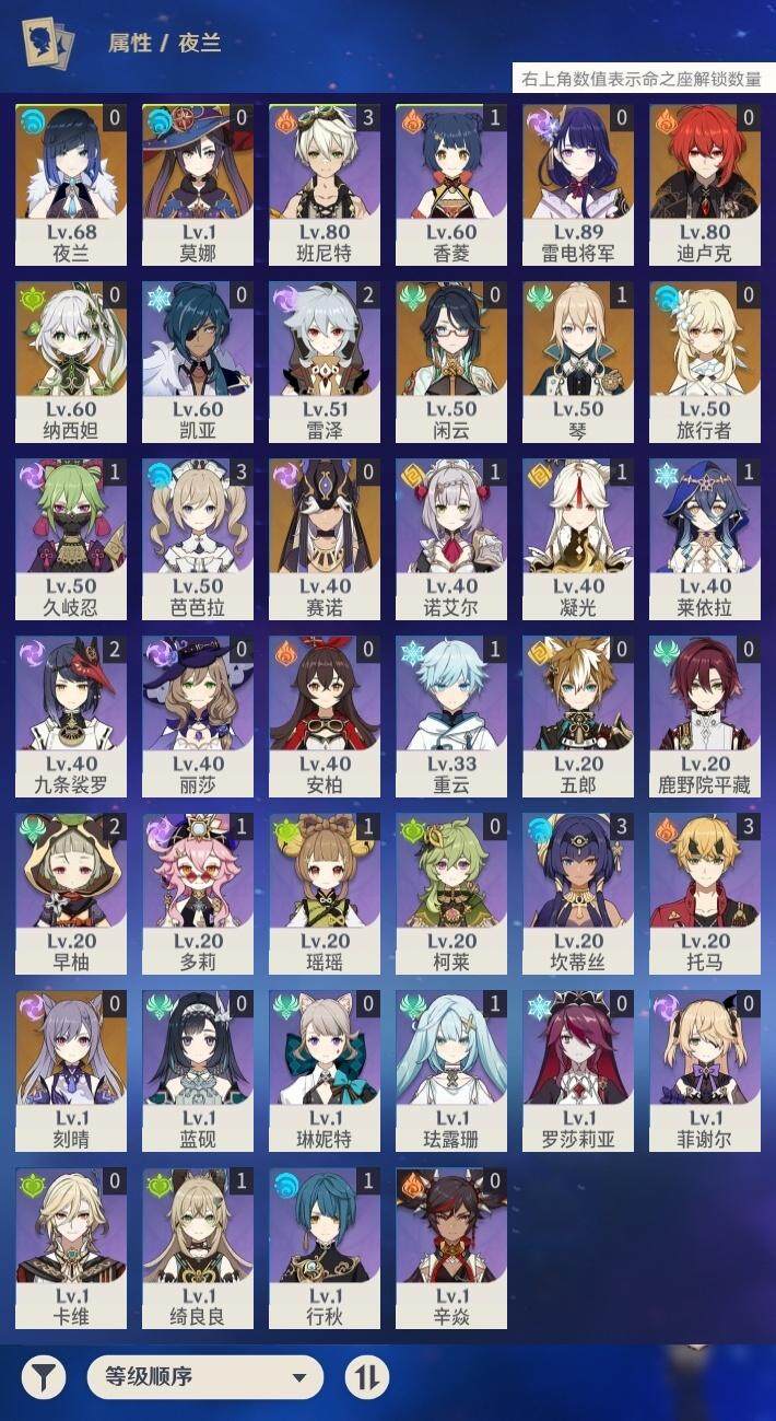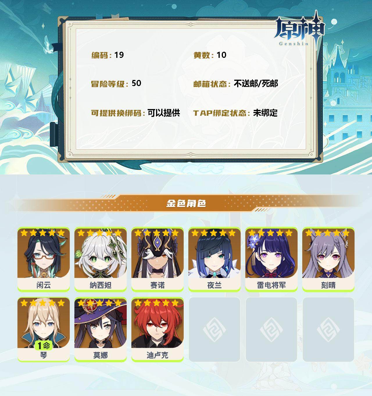 0命闲云,0命纳西妲,0命赛诺,0命夜兰,0命雷电将军,0命刻晴,1命琴,0命莫娜,0命迪卢克