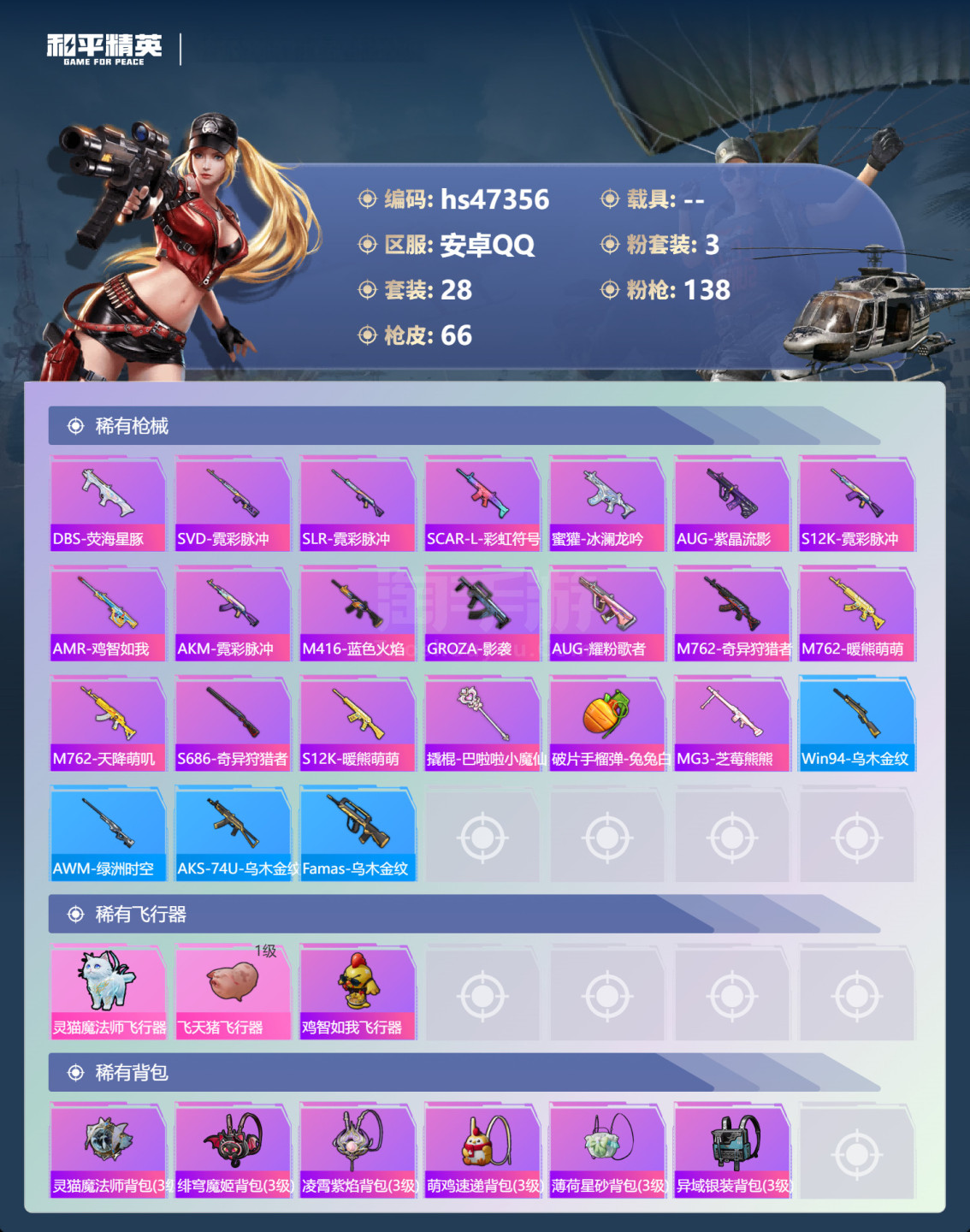 安卓手Q-0王牌印记-3粉装-4特效枪-18284热力值-28套装-66枪皮 【3粉装】套装-梦幻火