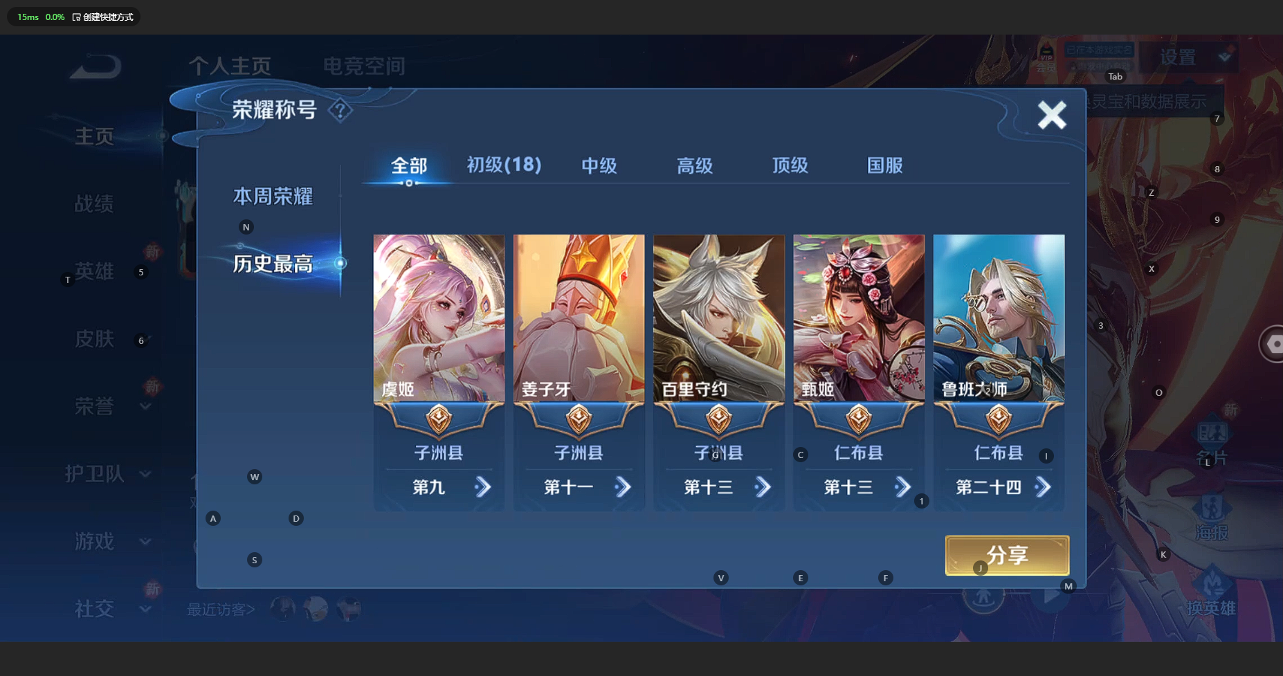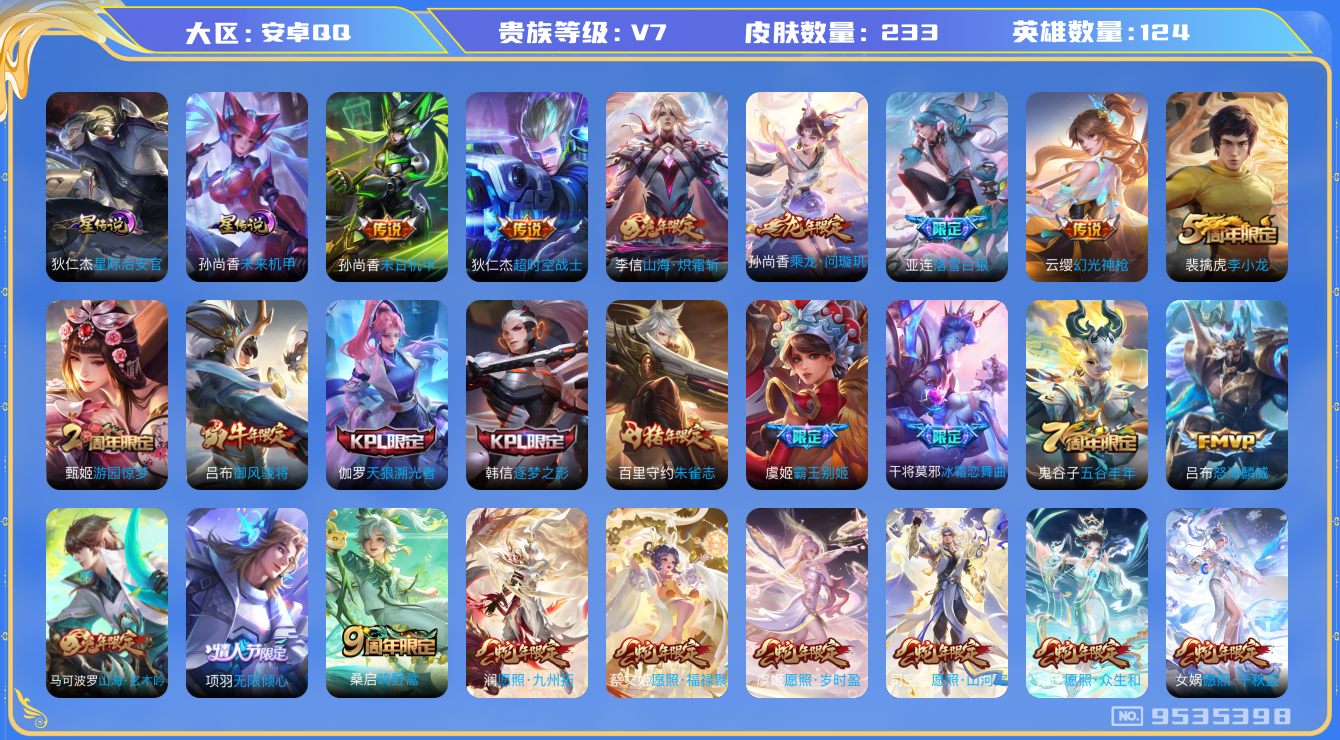 营地账号:2137925831/[9535398]满蛇年 发育路31段 中路27段 233皮肤 2星传说 15传说 80限定 14印记 6按键 幸运值222 ! 贵族等级: V7 星传说: 未来机甲,星际治安官 传说皮: 末日机甲-孙尚香,超时空战士-狄仁杰,山海·炽霜斩,乘龙·问璇玑,落雪白狼,幻光神枪 限定皮: 李小龙,游园惊梦,御风骁将,天狼溯光者,冰霜恋舞曲,逐梦之影,朱雀志,霸王别姬