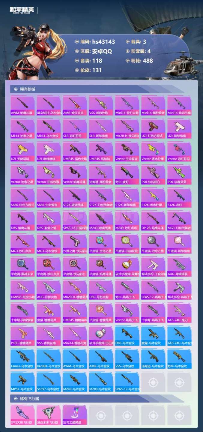 安卓手Q-4王牌印记-4粉装-4特效枪-3载具-46714热力值-118套装-131枪皮-1卓越印记