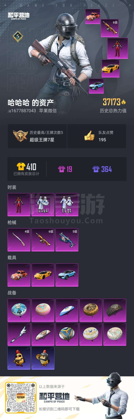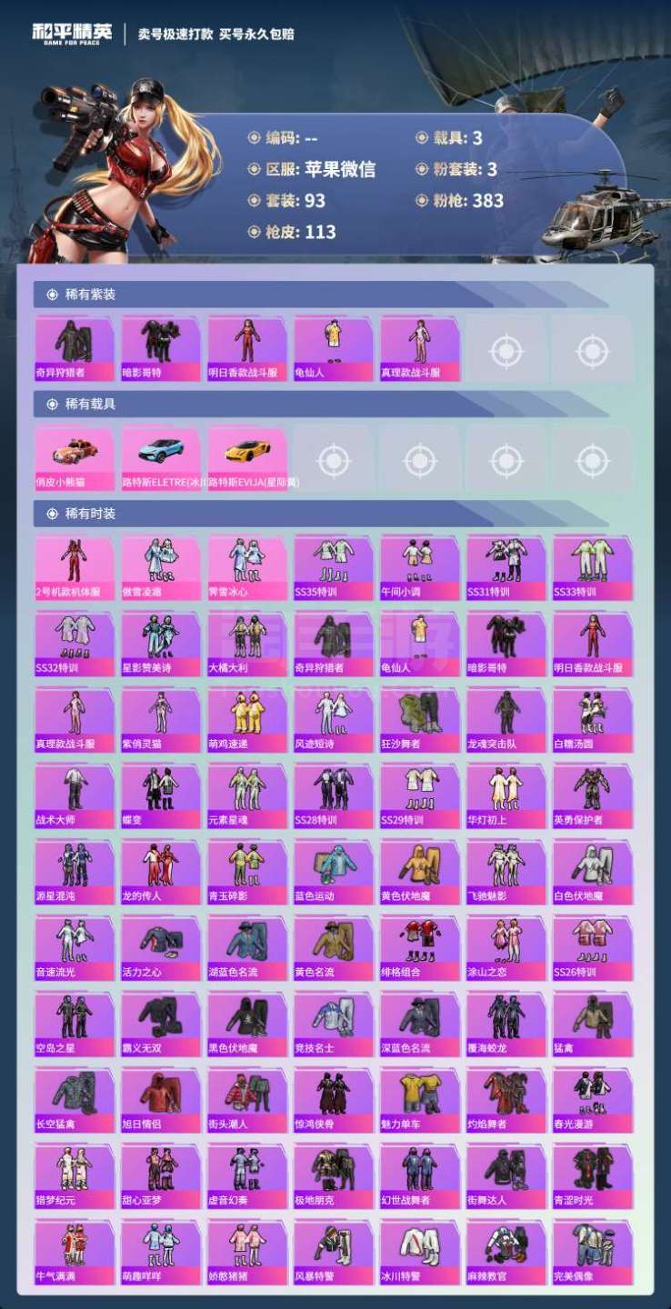 hs47557 苹果微-5王牌印记-3粉装-3特效枪-3载具-37173热力值-93套装-113枪