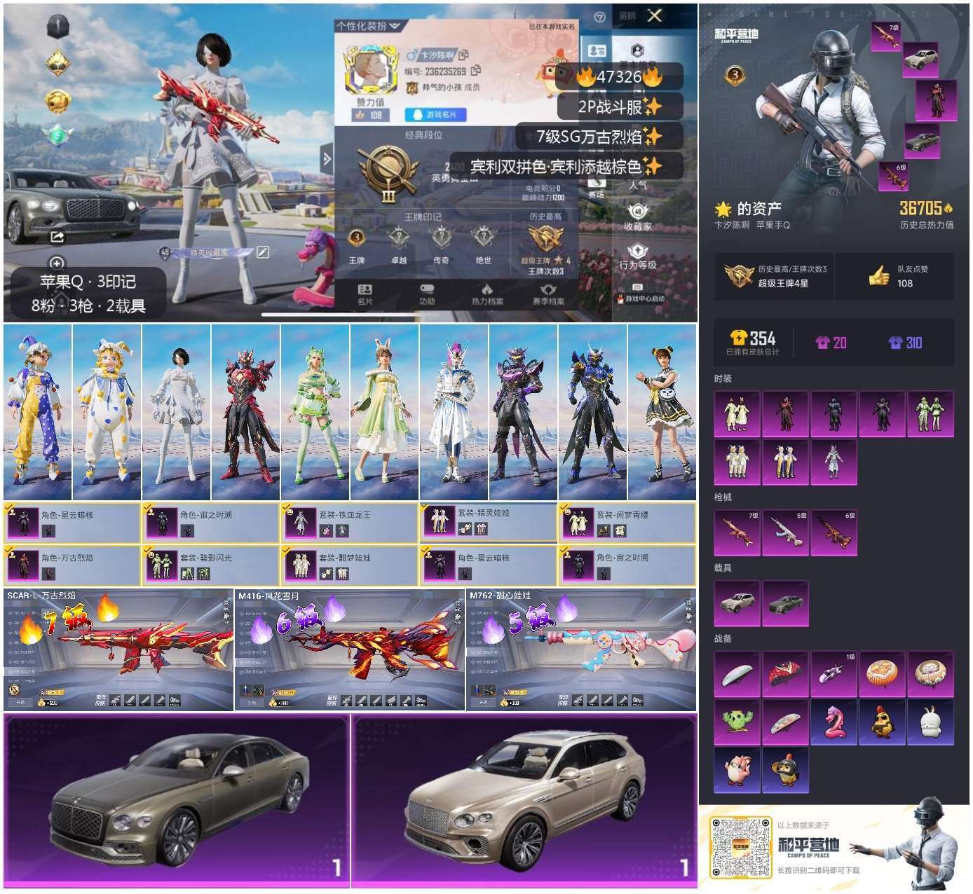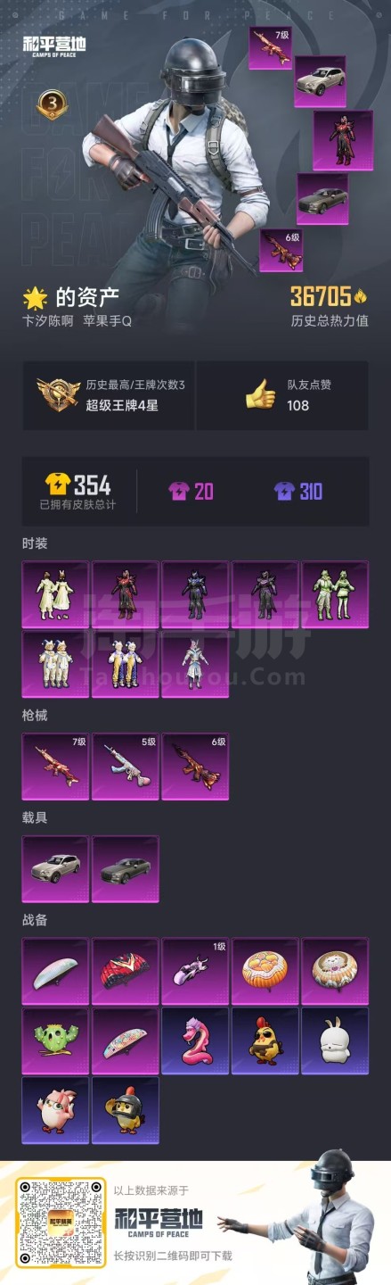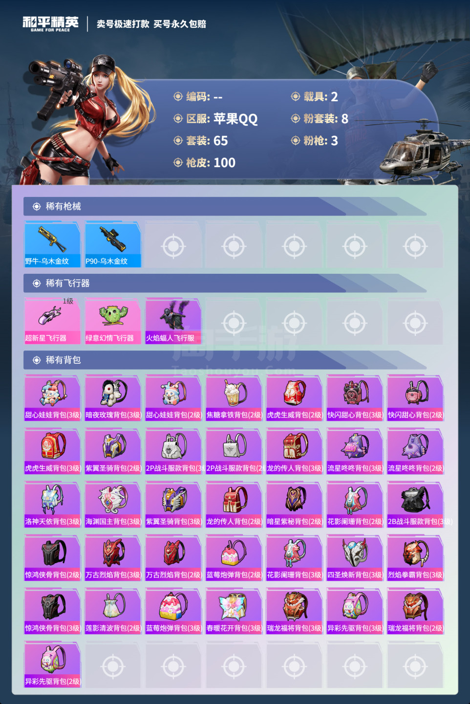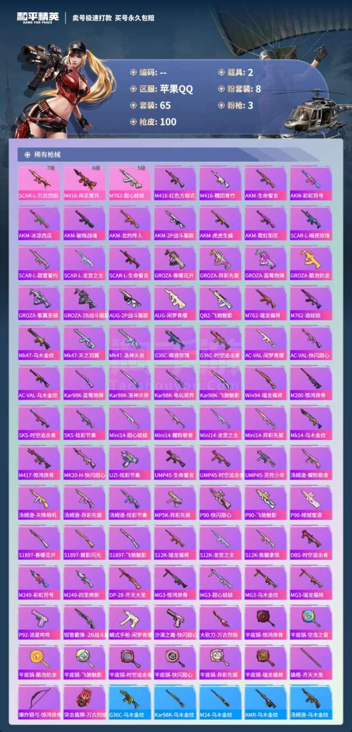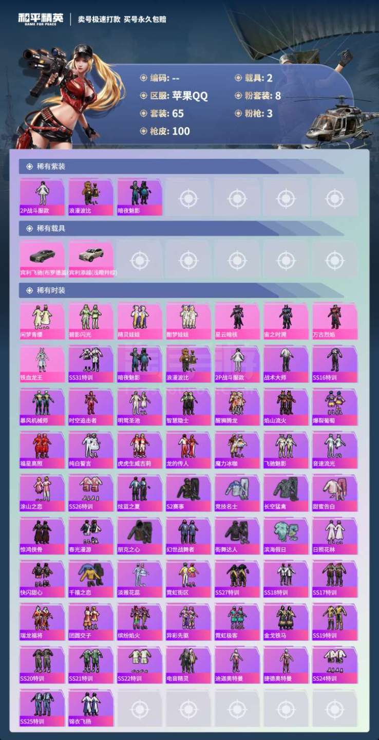 hs47326 苹果手Q-3王牌印记-8粉装-3特效枪-2载具-36705热力值-65套装-100枪