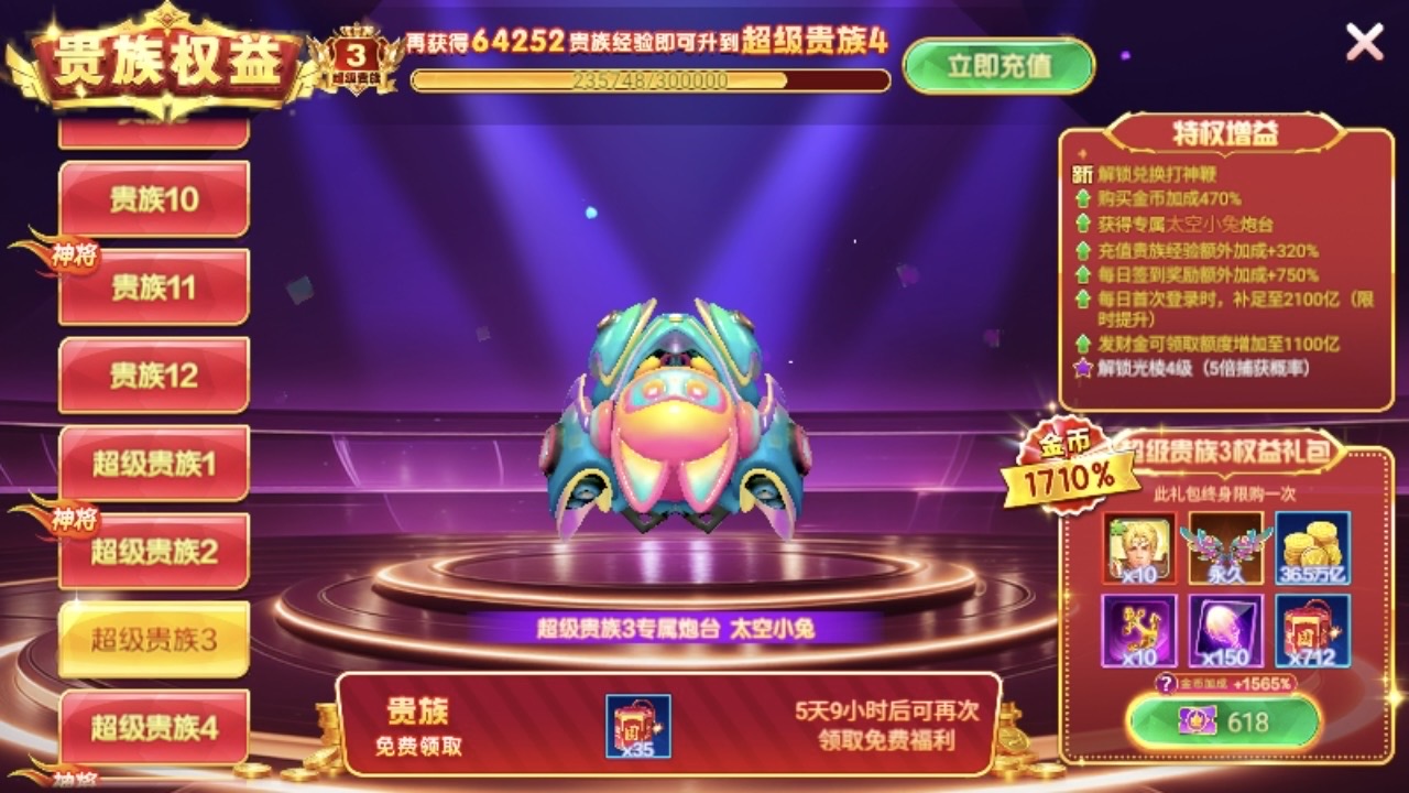超级贵族3无限火力15天神10亿炮,脱坑了低价出,送永久包赔