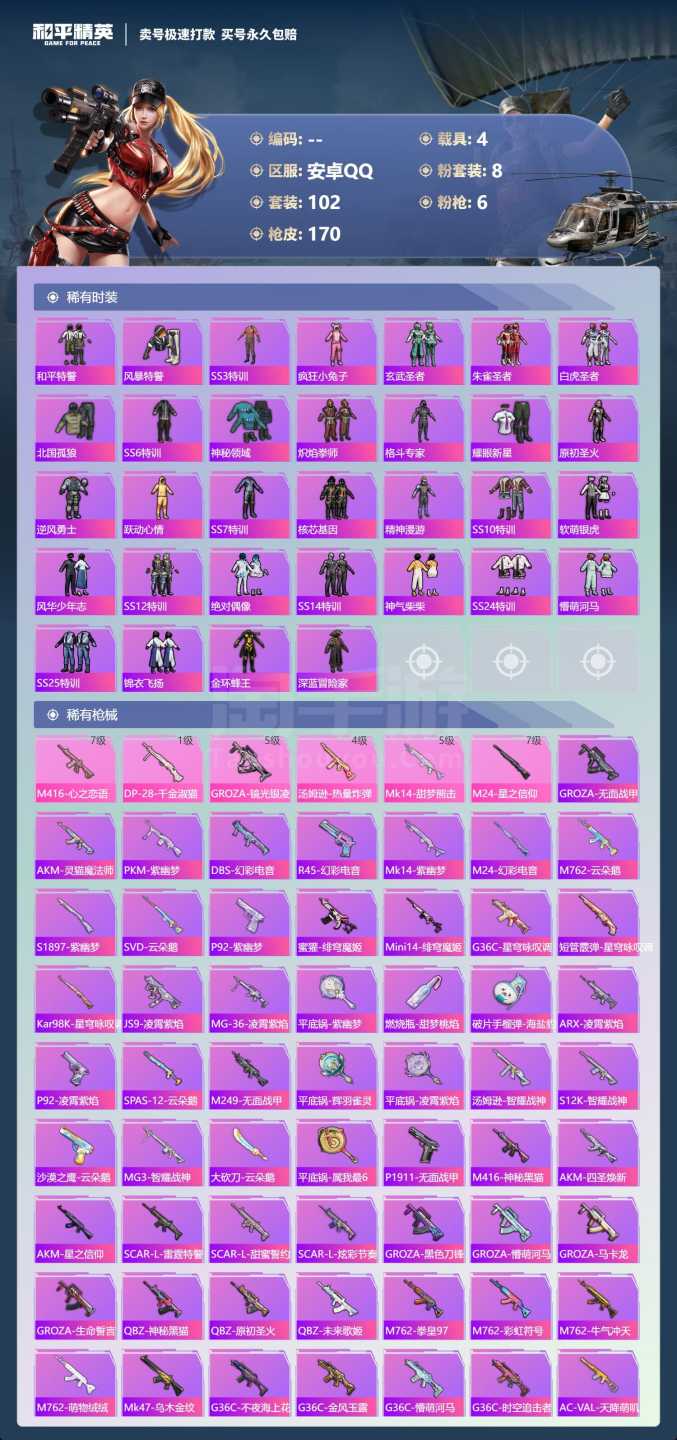 a3918/安卓手QQ/-5王牌印记-8粉装-6特效枪-4载具-61125热力值-102套装-170