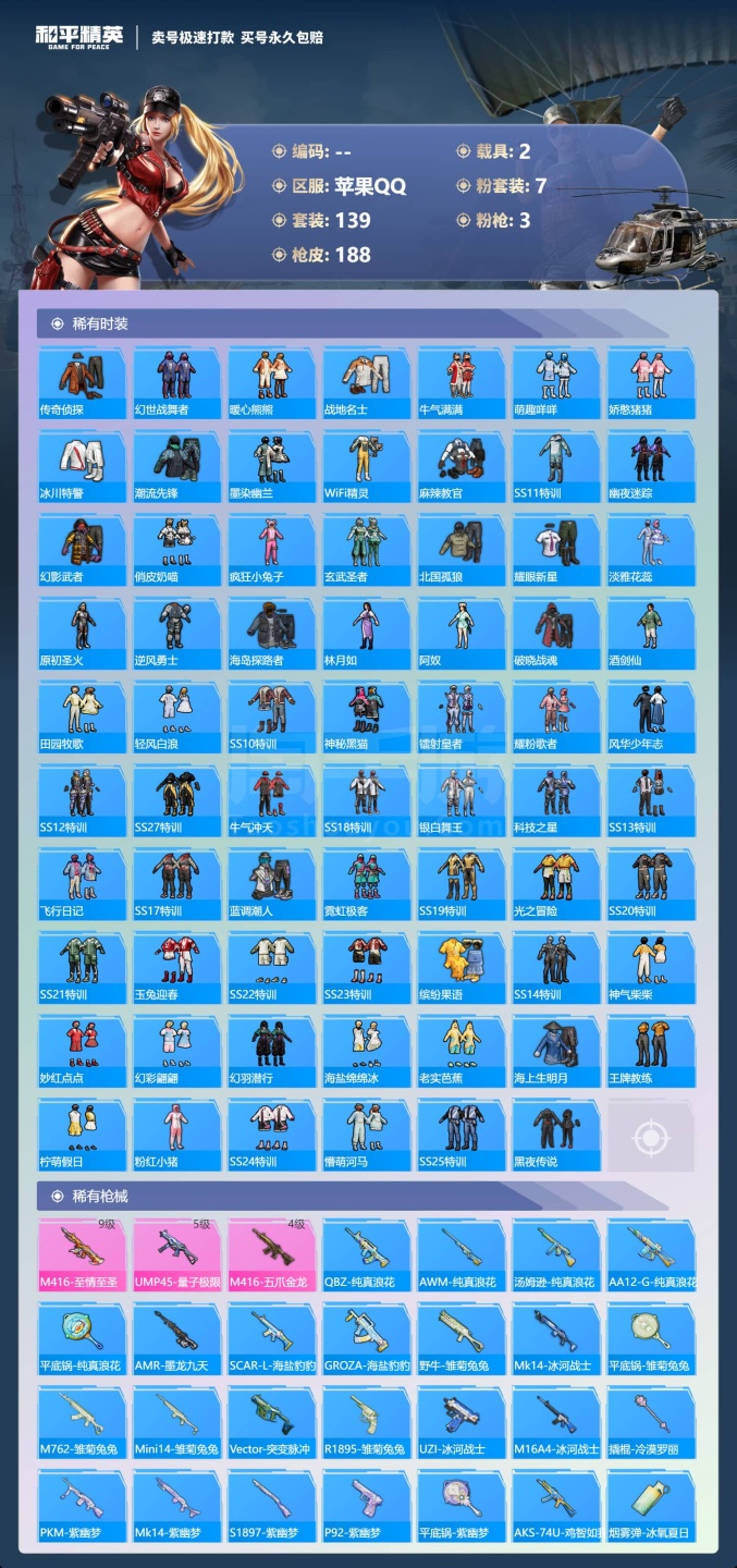 a3730/苹果QQ/-7王牌印记-7粉装-3特效枪-2载具-59737热力值-139套装-188枪