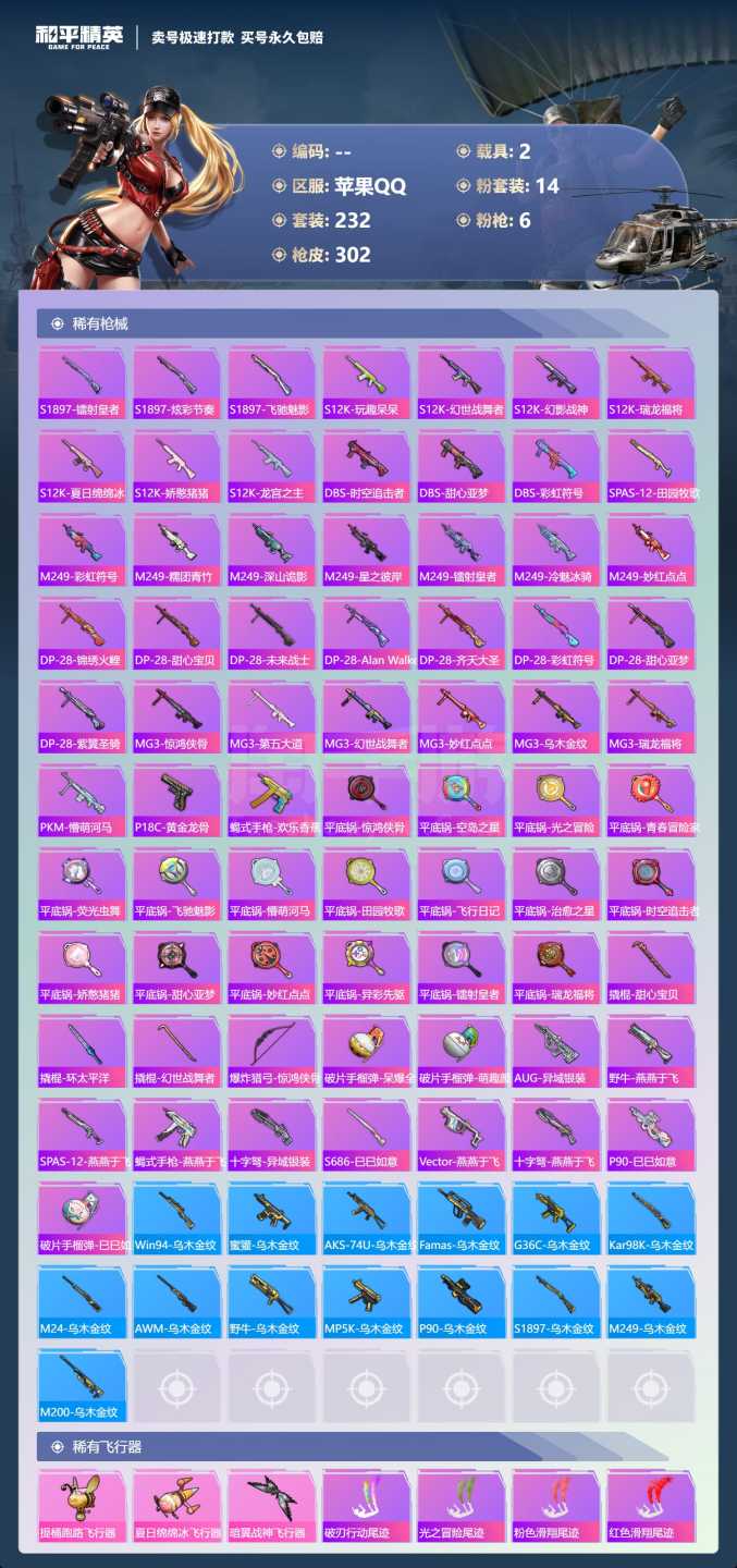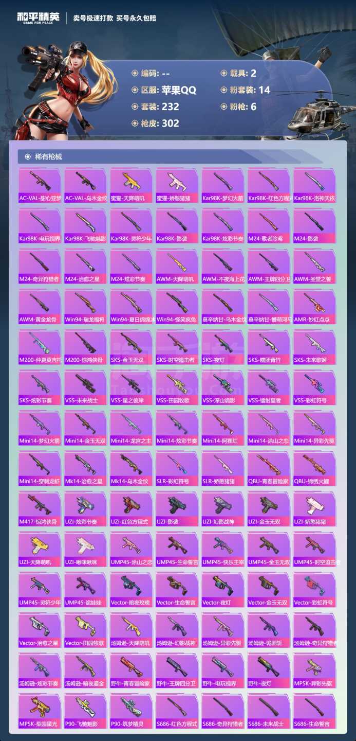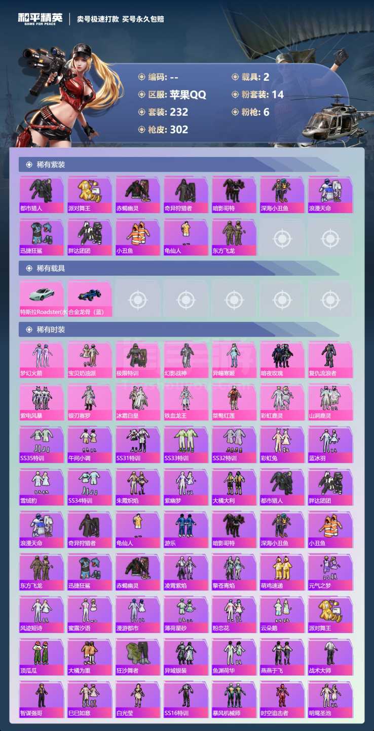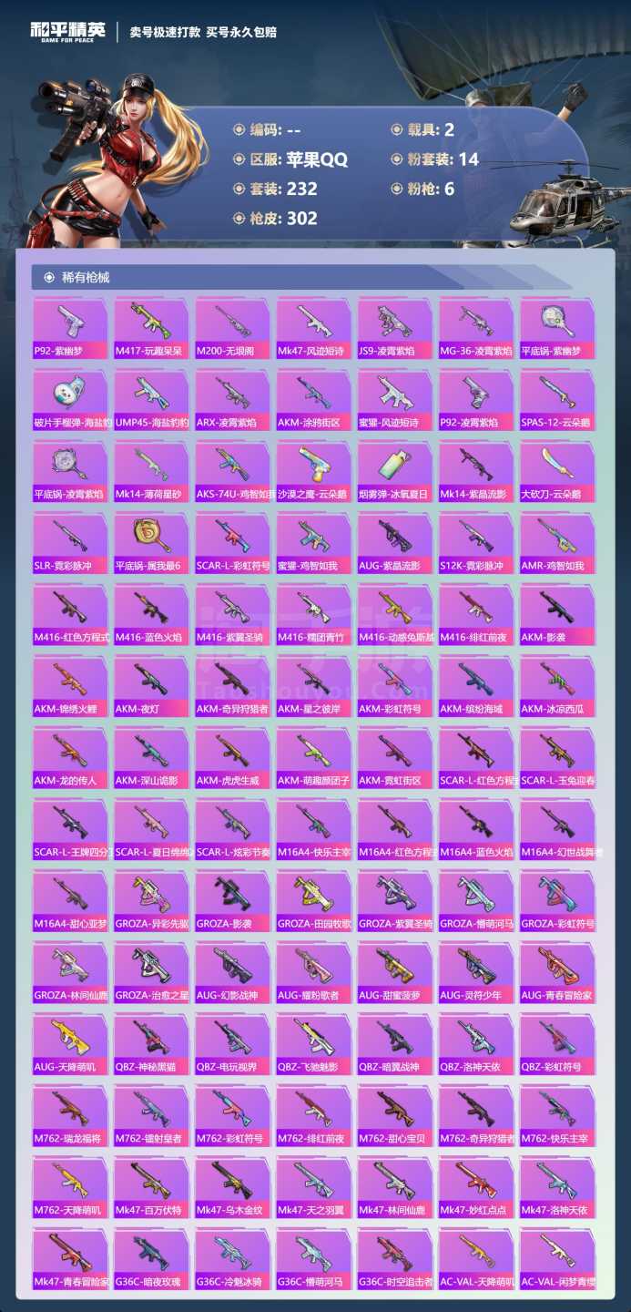 a4040/苹果QQ/一个车币/1500扭蛋碎片/-13王牌印记-14粉装-6特效枪-2载具-985
