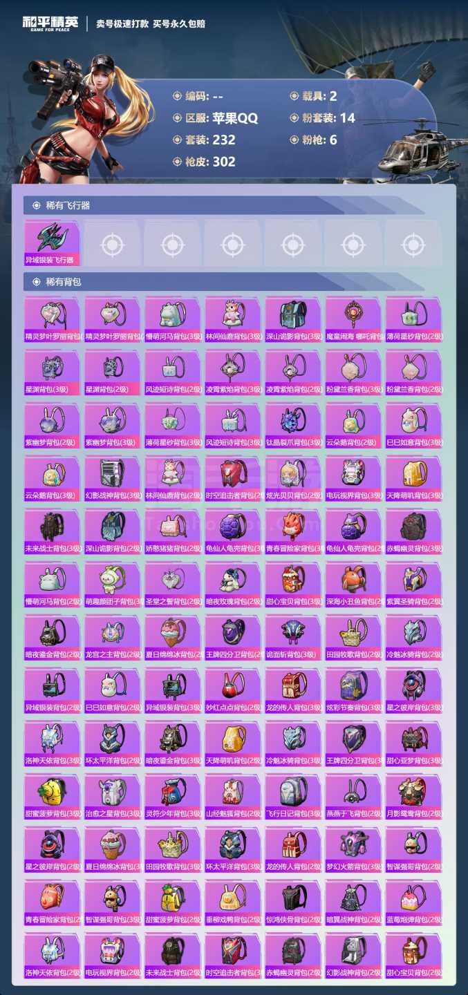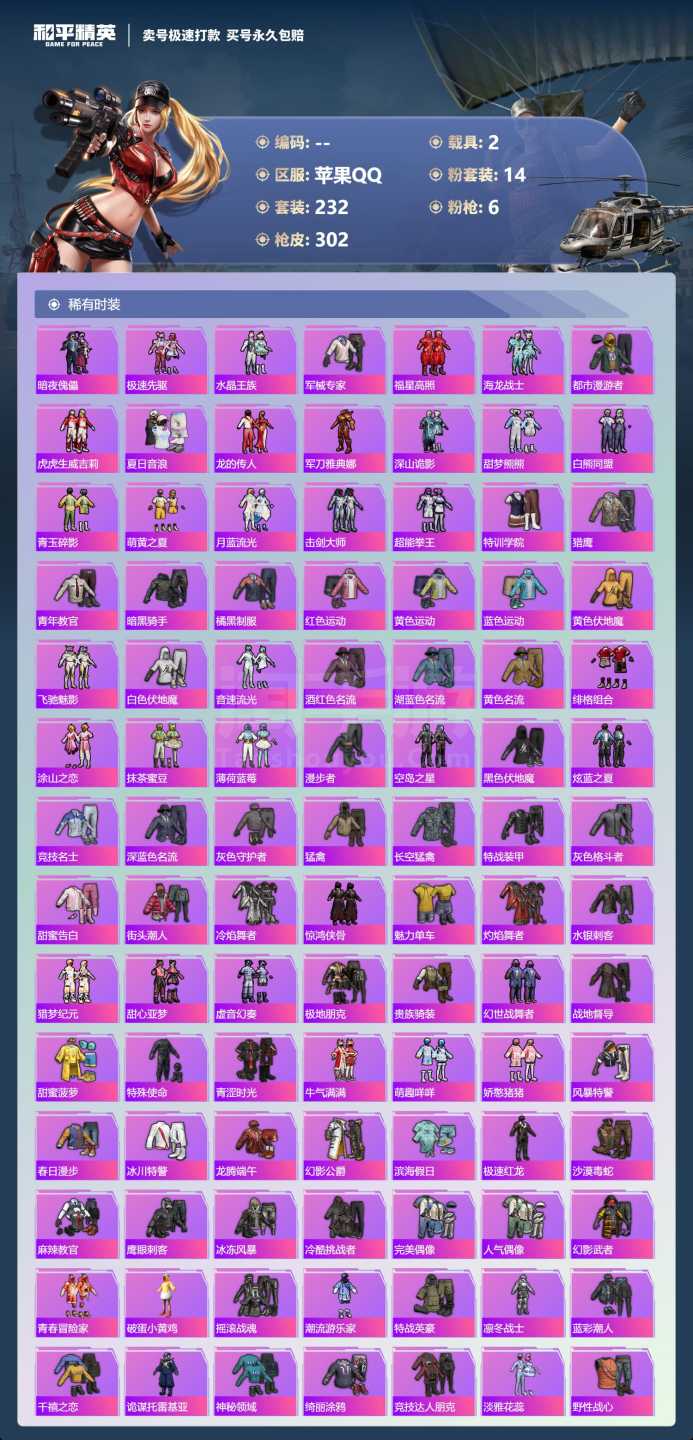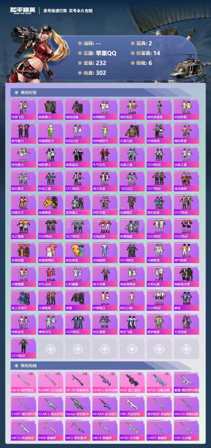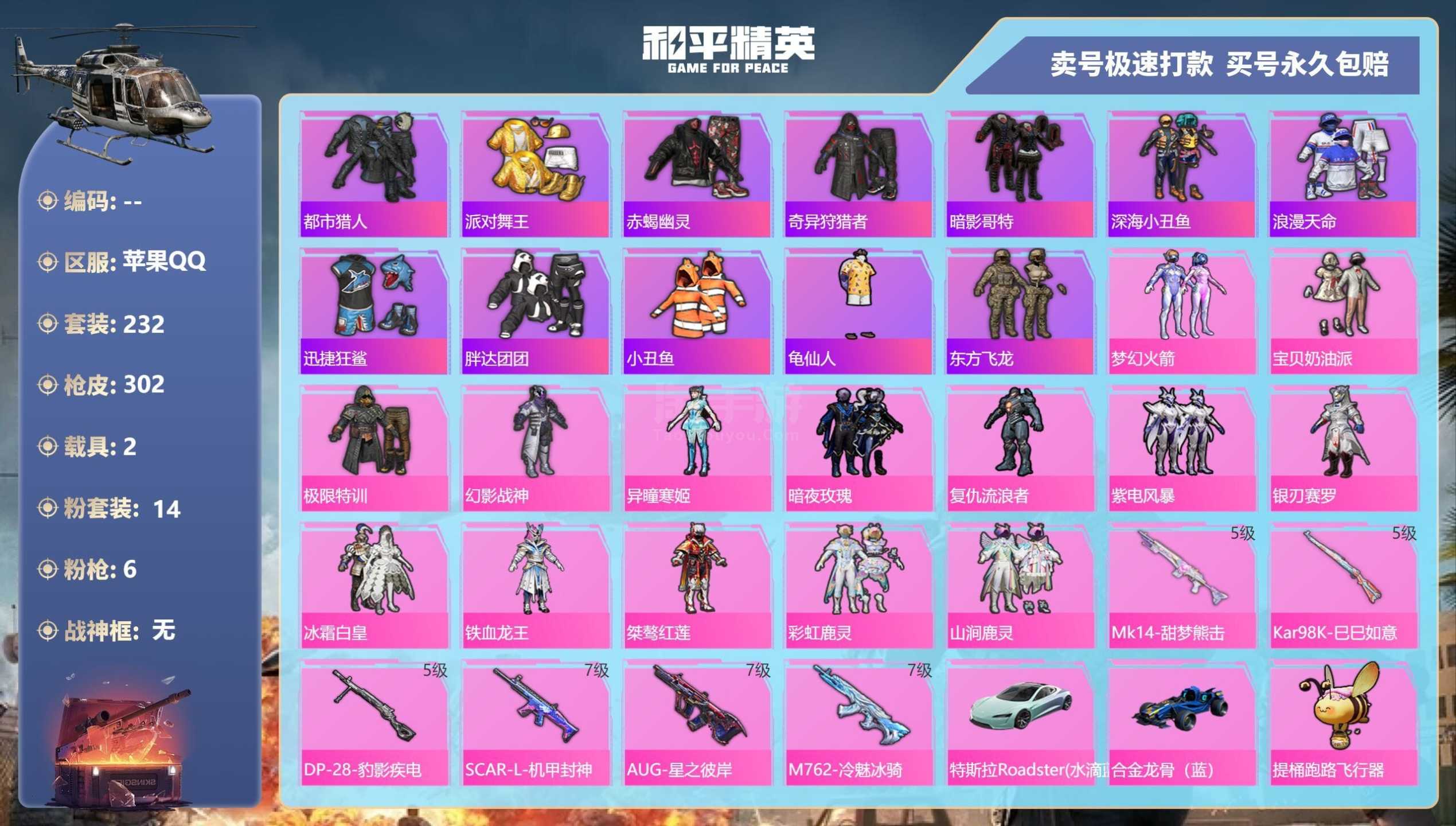 a4040/苹果QQ/一个车币/1500扭蛋碎片/-13王牌印记-14粉装-6特效枪-2载具-985