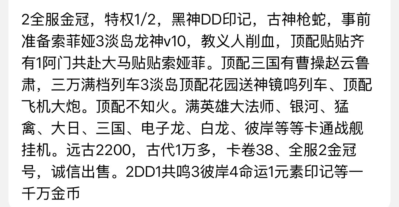 2全服金冠,特权1/2,黑神DD印记,古神蛇,事前准备索菲娅3淡岛龙神v10,教义人削血,顶配贴贴齐有1阿门共赴大马贴贴索娅菲。顶配三国有曹操赵云鲁肃,三万满档列车3淡岛2DD1共鸣3彼岸4命运1元素