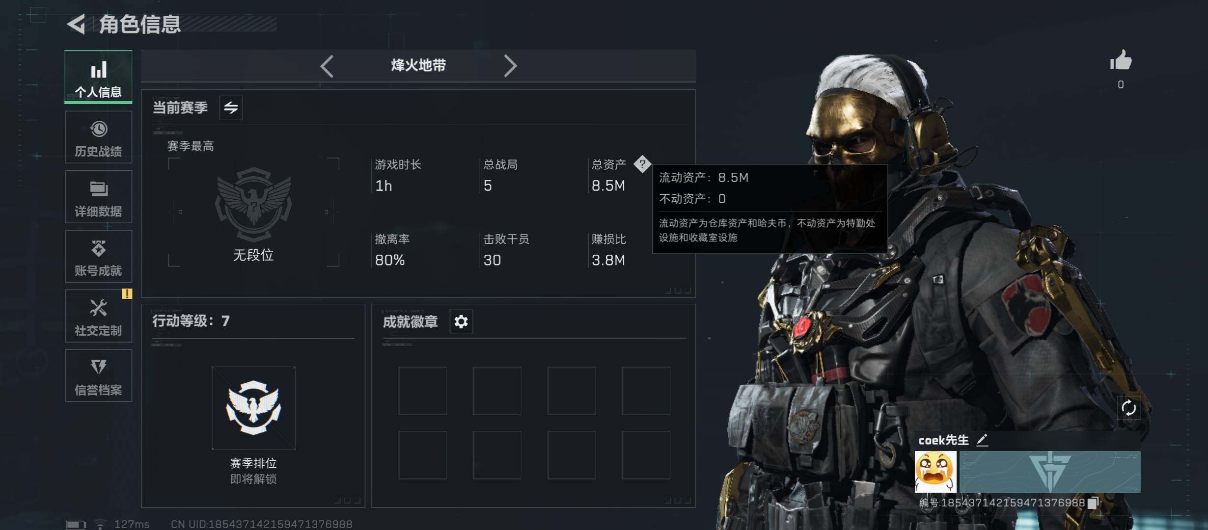 【裸蚀金玫瑰号,8.5M资产,新手入坑首选】【Q区三端互通】【无二次】YXz2859-特勤处:仓库1级/靶场0级/训练中心0级-总资产8.5m-哈夫币546w-烽火等级:7级【勾选了部分账号,详细看图,平台认证商家店铺,保证金商家,安全有保障,性价比超高,永久包赔】