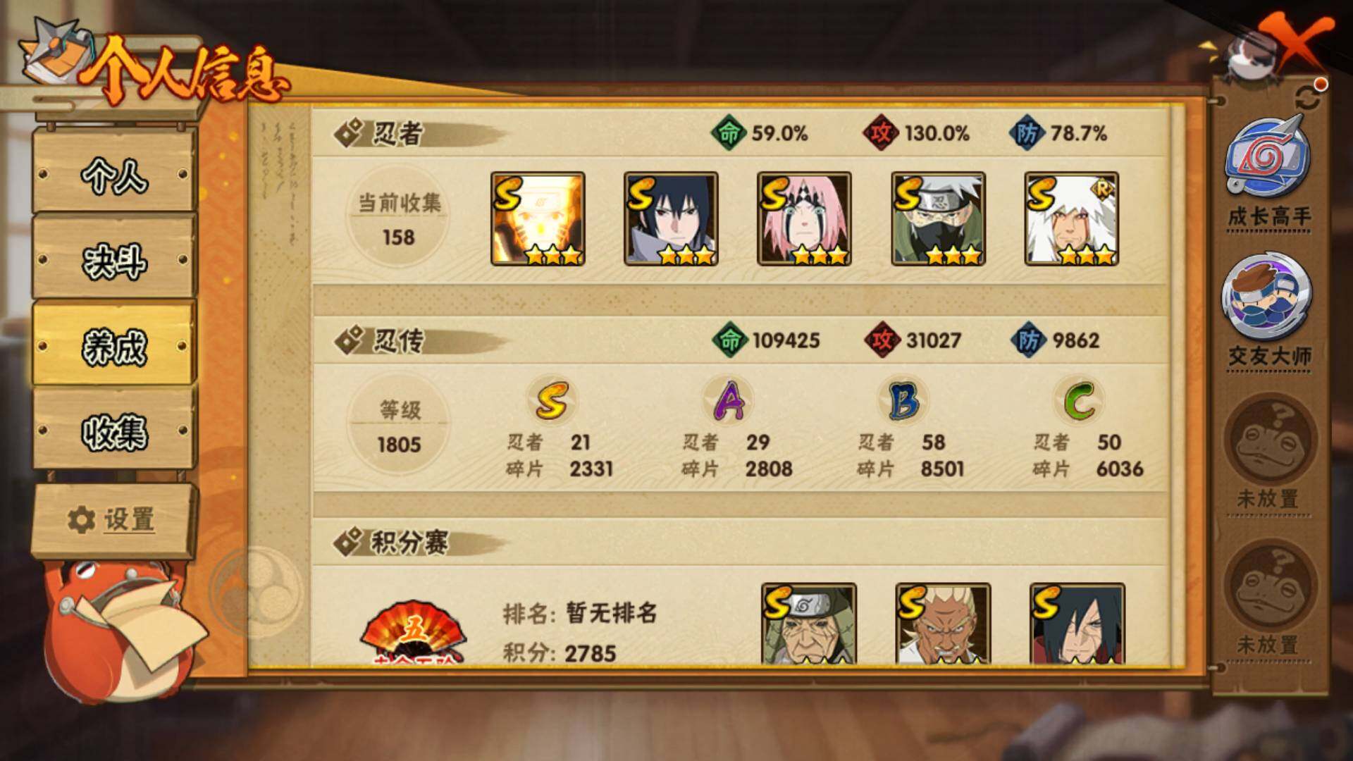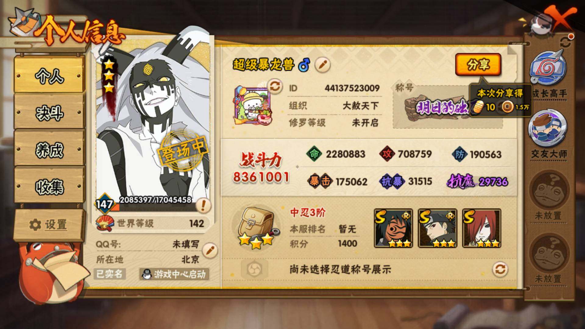 V10/836万战力/总忍者159/21S/29A/最终章舍人/红夜带土/须佐止水/创立柱间/大筒木桃式/九喇嘛水门/须佐卡卡西/传说自来也/白面具/忍战艾/秽土水门/秽土解斑/秽土长门/秽土日斩/九喇嘛鸣人/永恒佐助/忍战樱/漂泊小南/秽土再不斩/秽土角都/15通灵/45密卷/1.9千金币
