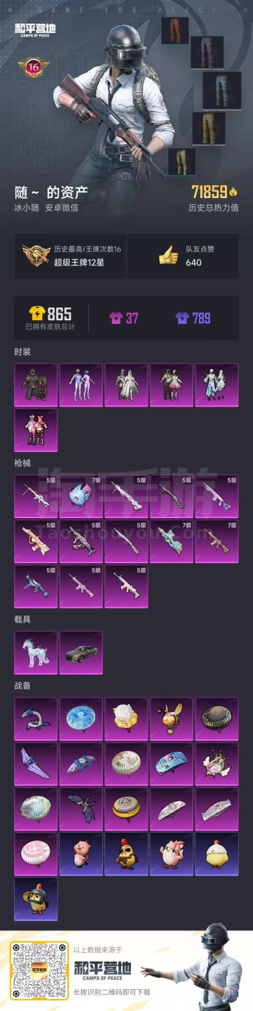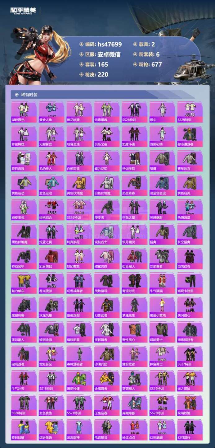 hs47699 安卓微-16王牌印记-6粉装-13特效枪-2载具-71859热力值-165套装-2