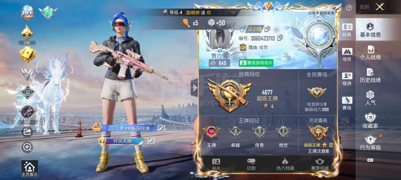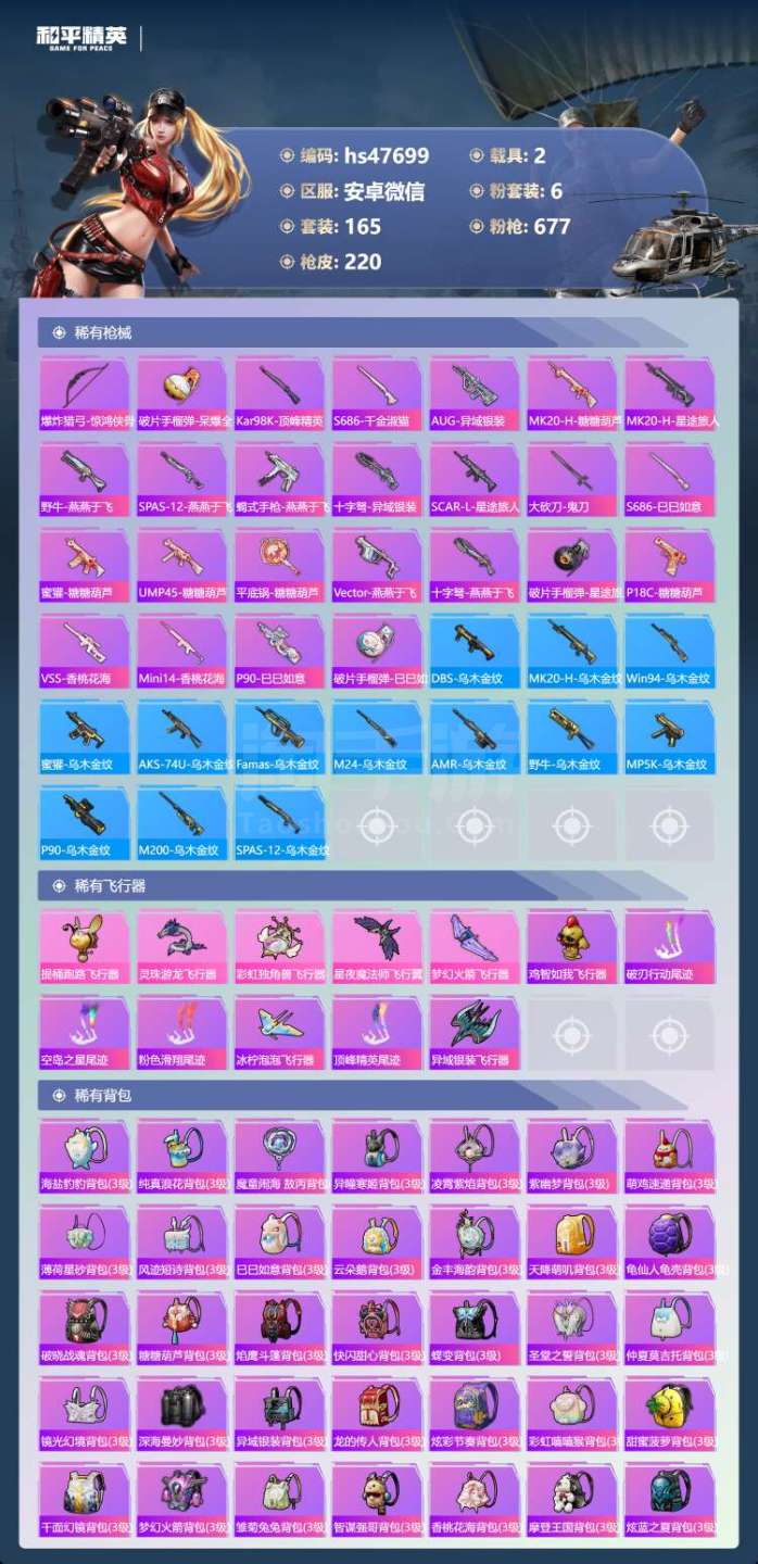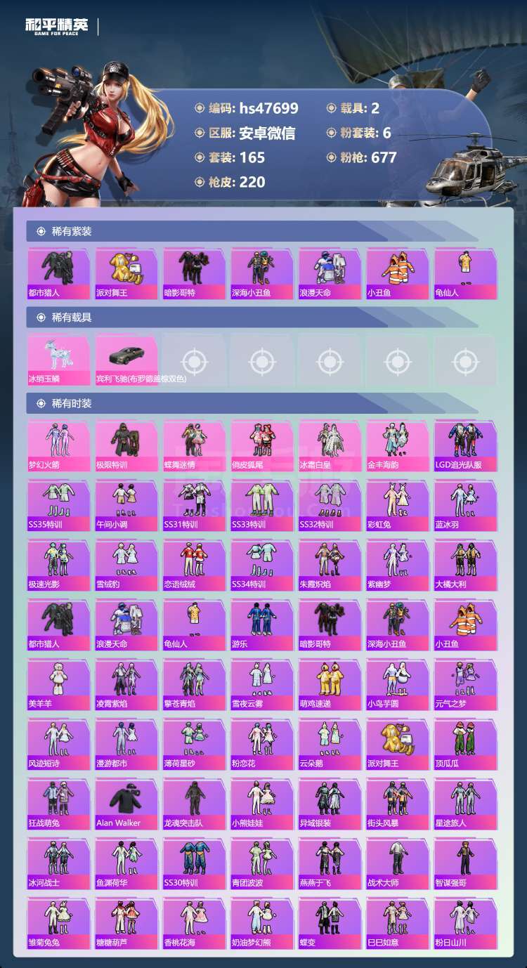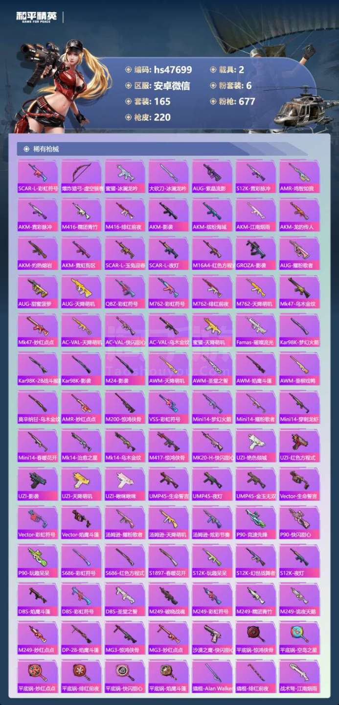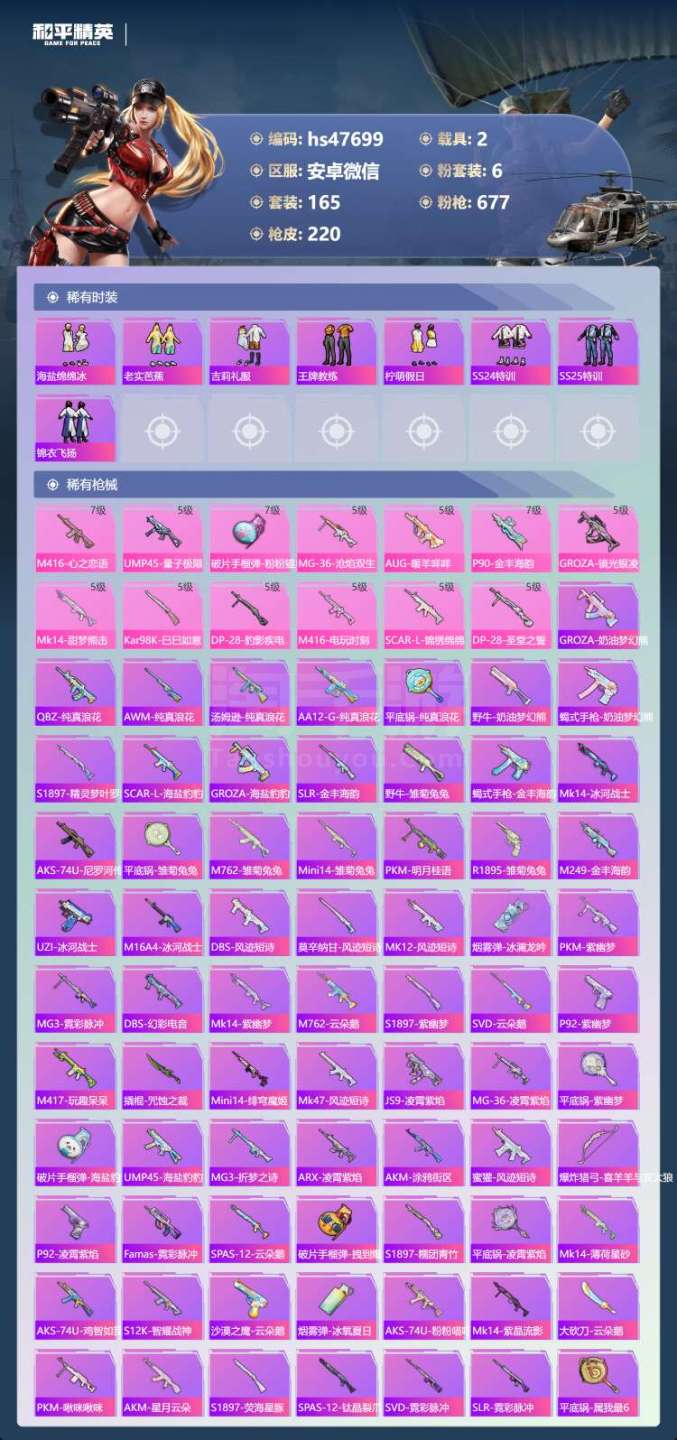 和平精英【安卓微信】hs47699 安卓v-16王牌印记-6粉装-13特效枪-2载具-71859热力值-165套装-2