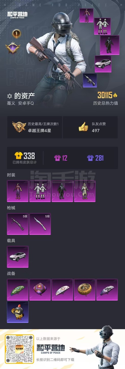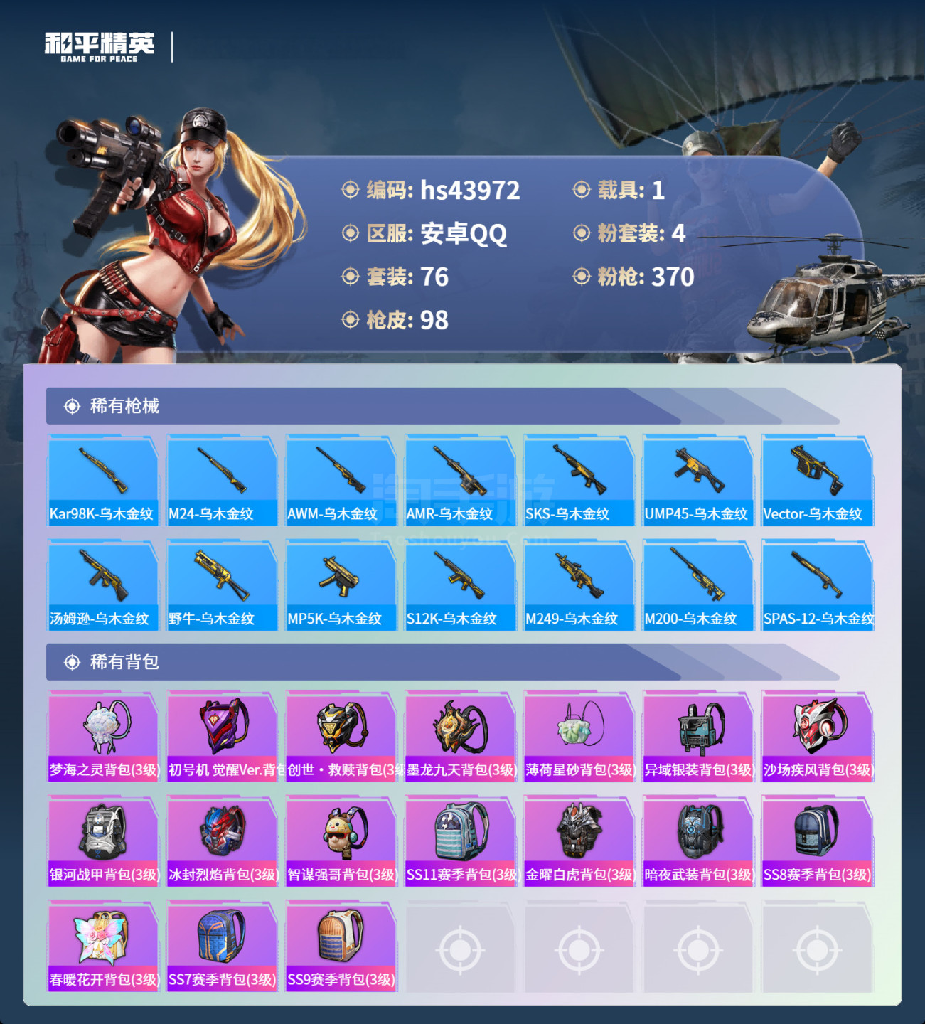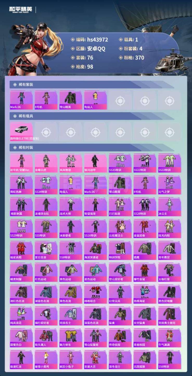 和平精英【安卓QQ】hs43972 安卓手Q-1王牌印记-4粉装-2特效枪-1载具-30115热力值-76套装-98枪皮