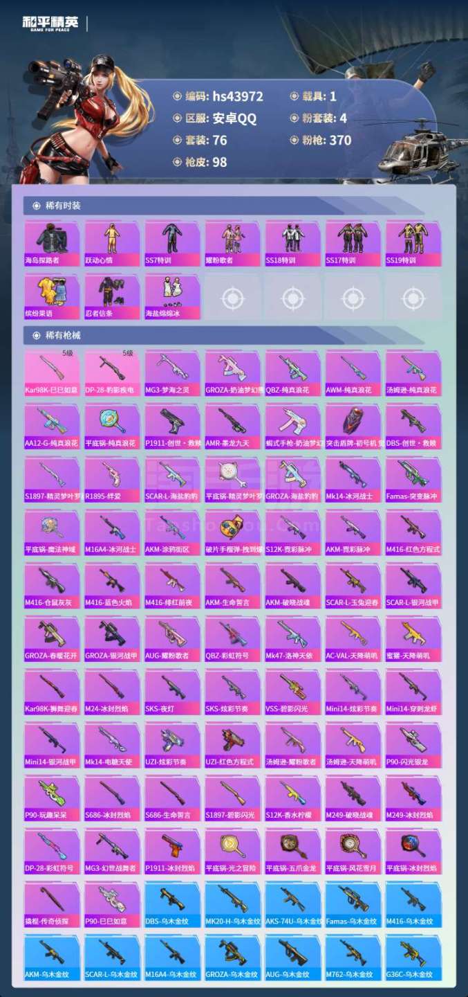 hs43972 安卓手Q-1王牌印记-4粉装-2特效枪-1载具-30115热力值-76套装-98枪皮