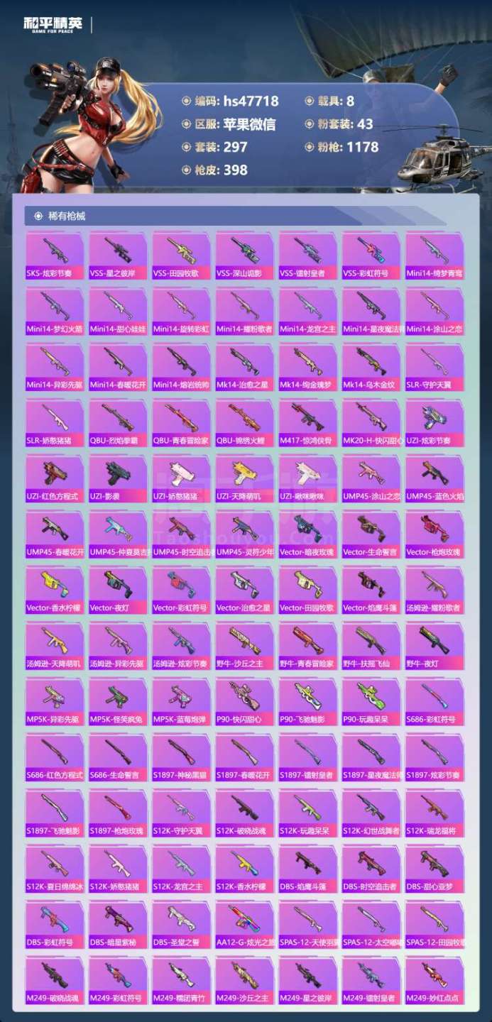 hs47718 苹果微-23王牌印记-有战神框-1红装-43粉装-14特效枪-8载具-166983