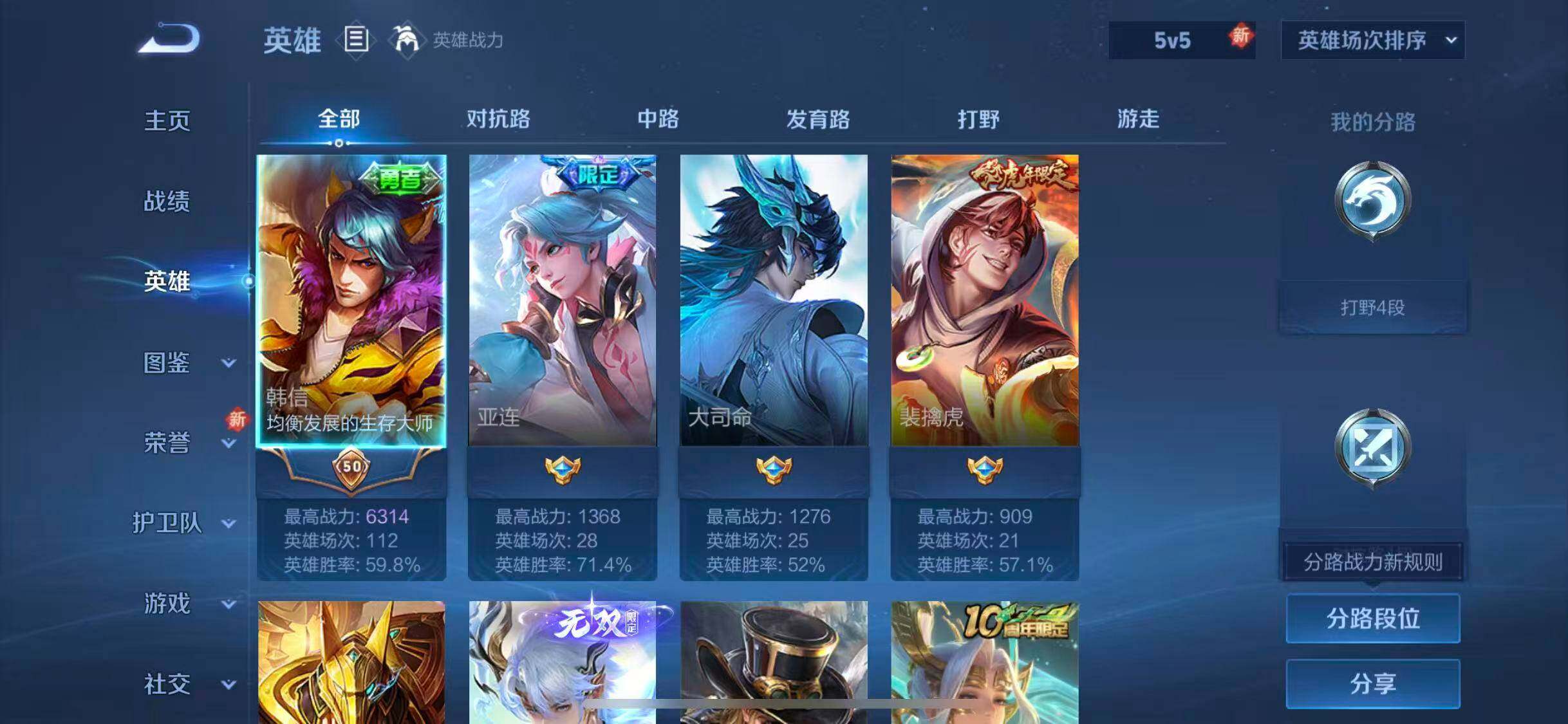 【号有社交限制, 不影响游戏正常使用!】贵族等级: V6 英雄数: 59 皮肤