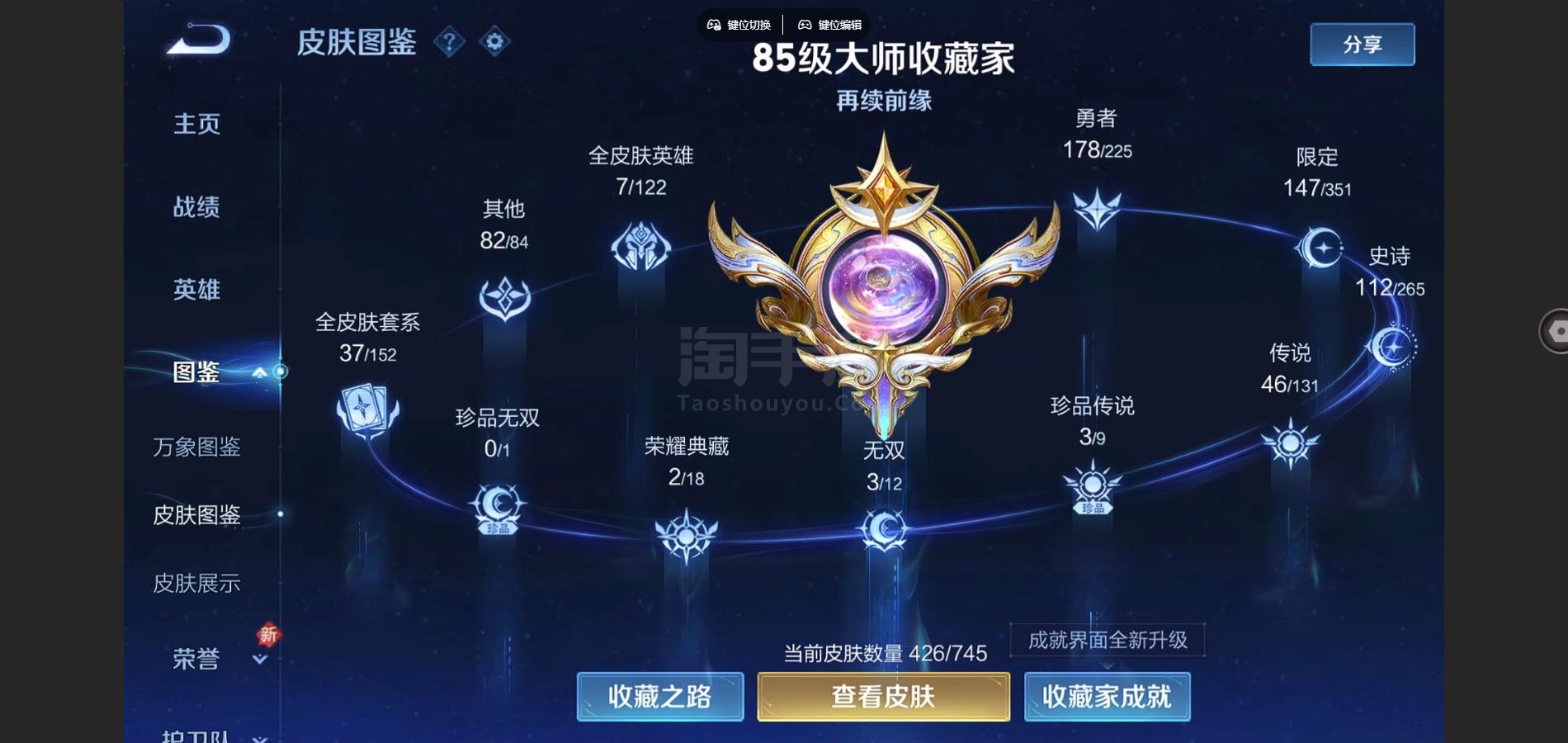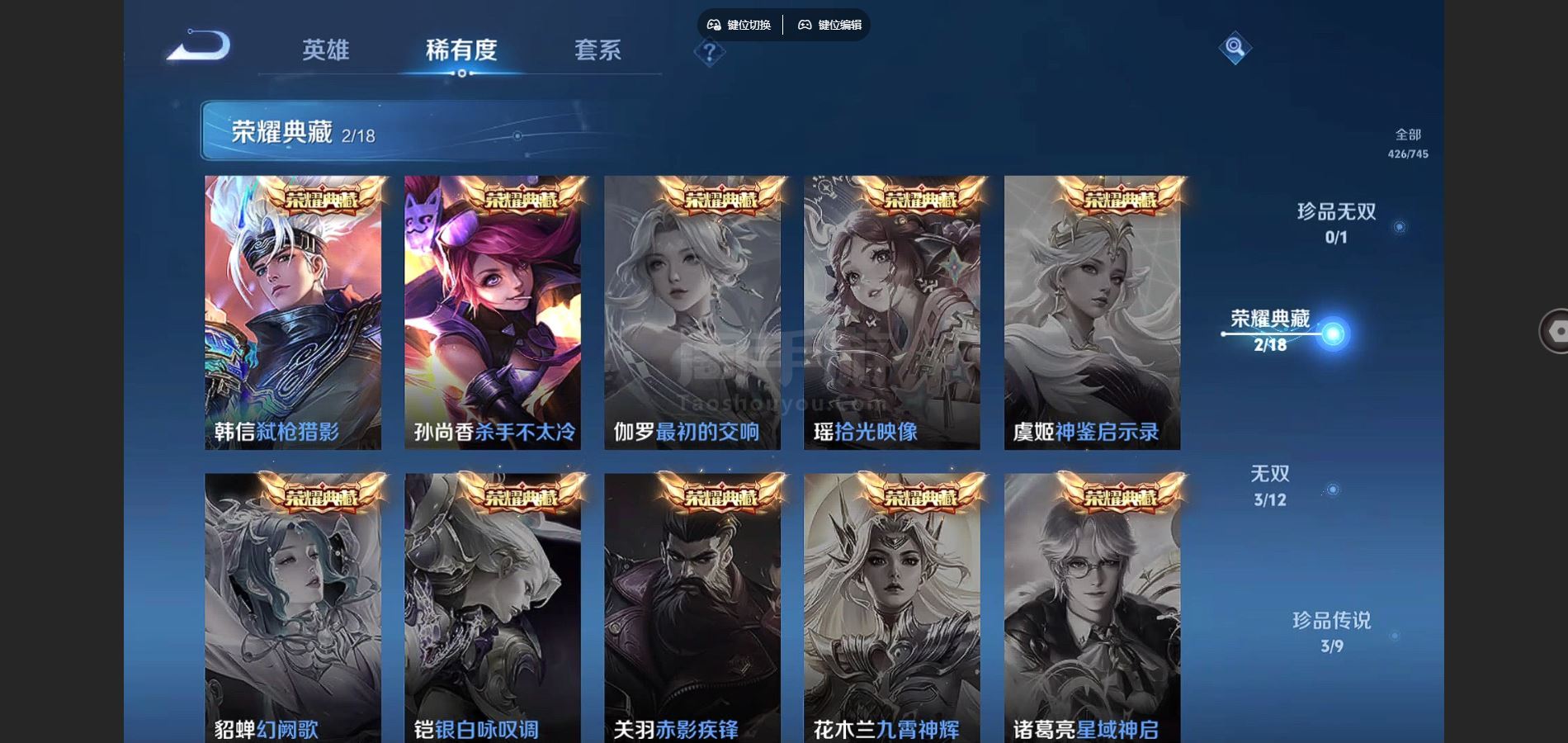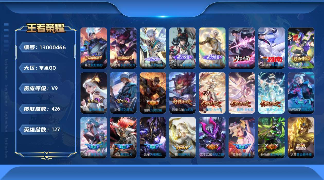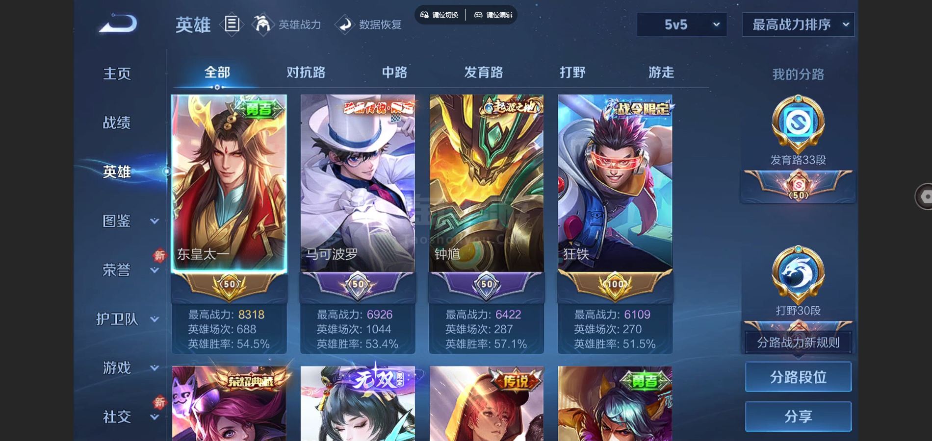 V9-426皮肤2典藏3无双3珍品传说44传说 发育路33段 打野30段 金标东皇太一 狂铁 2星传
