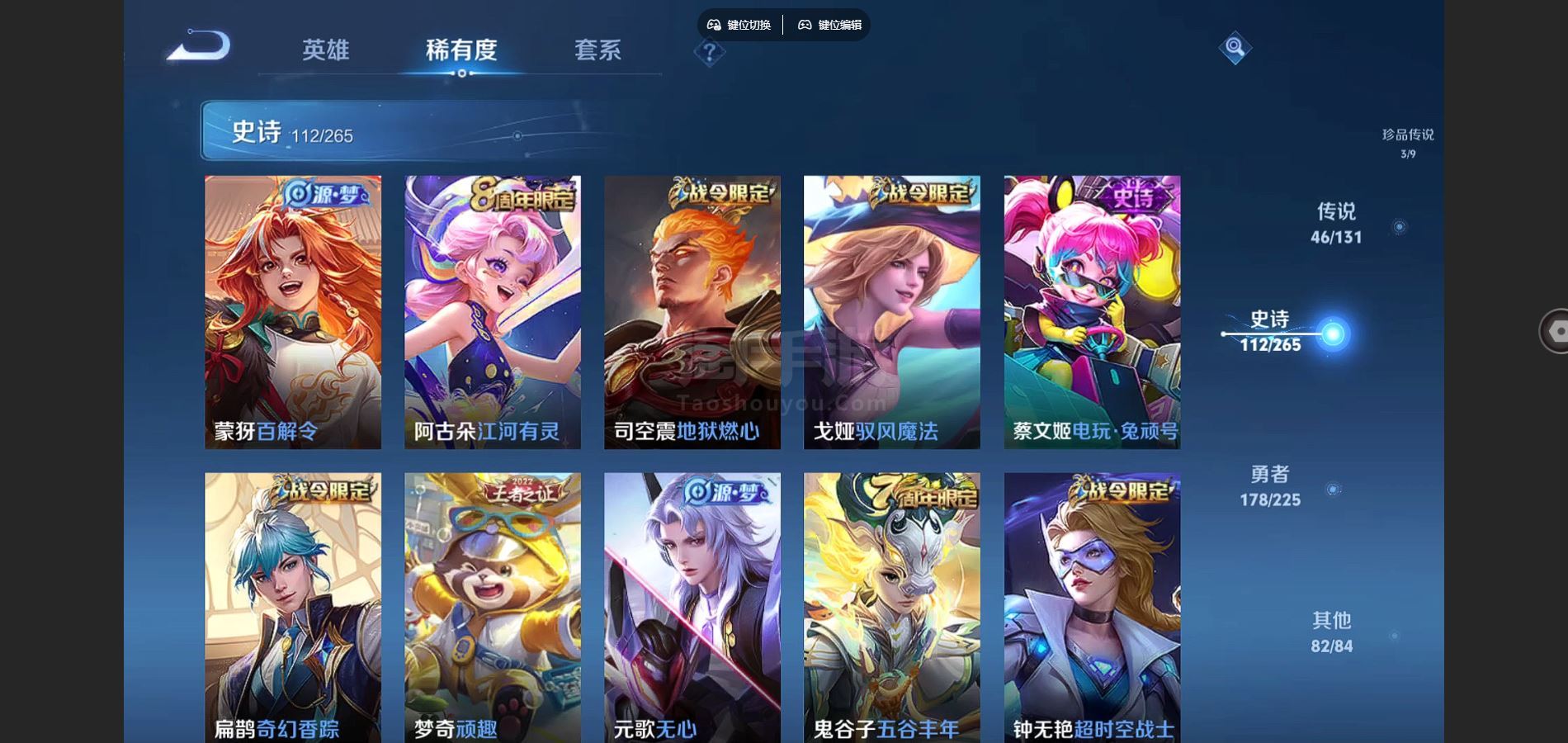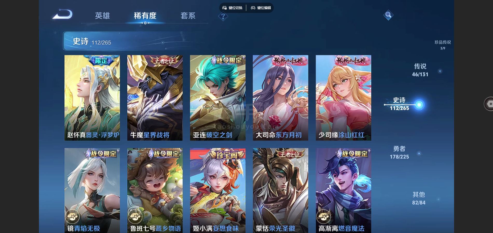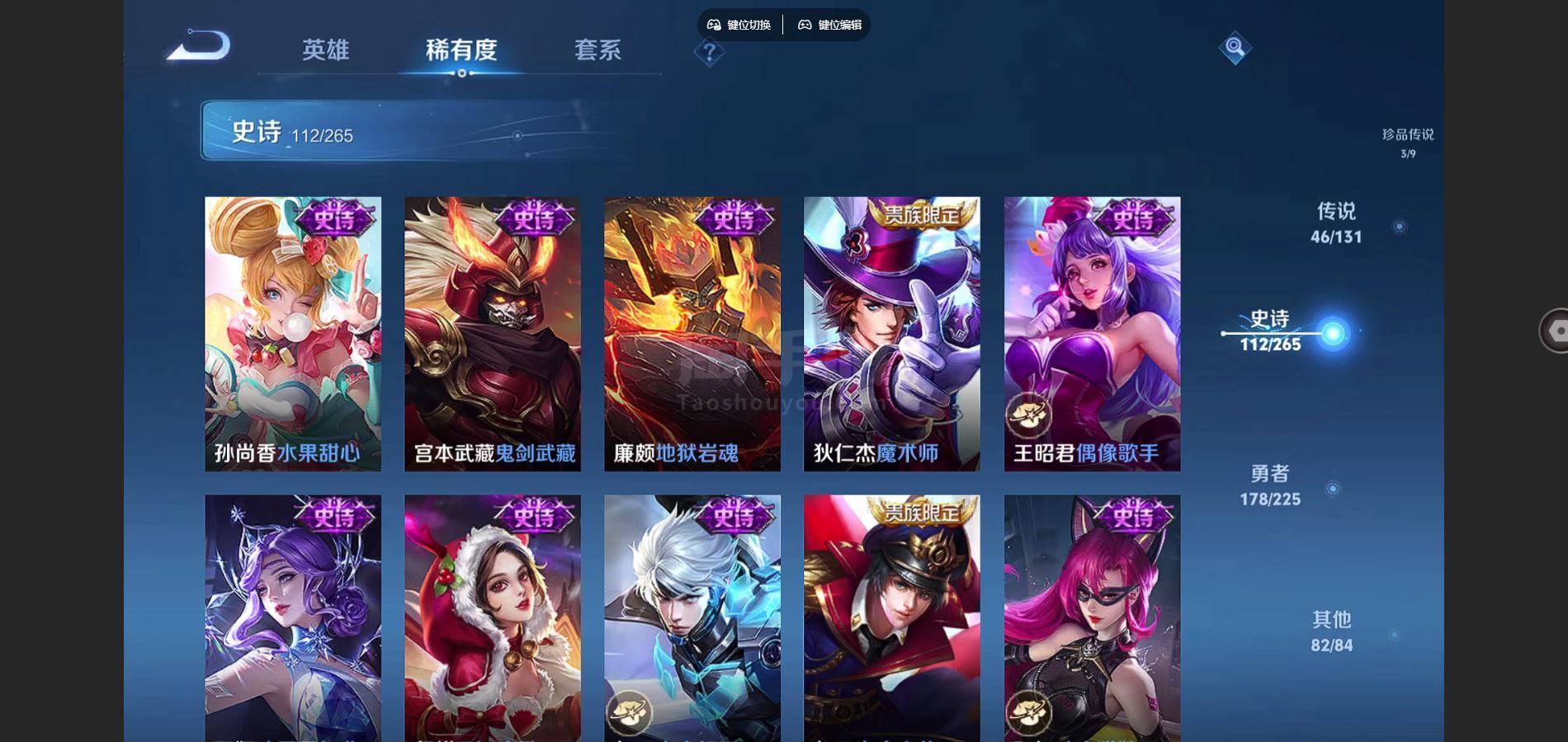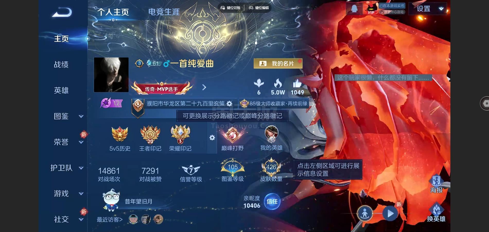 V9-426皮肤2典藏3无双3珍品传说44传说 发育路33段 打野30段 金标东皇太一 狂铁 2星传