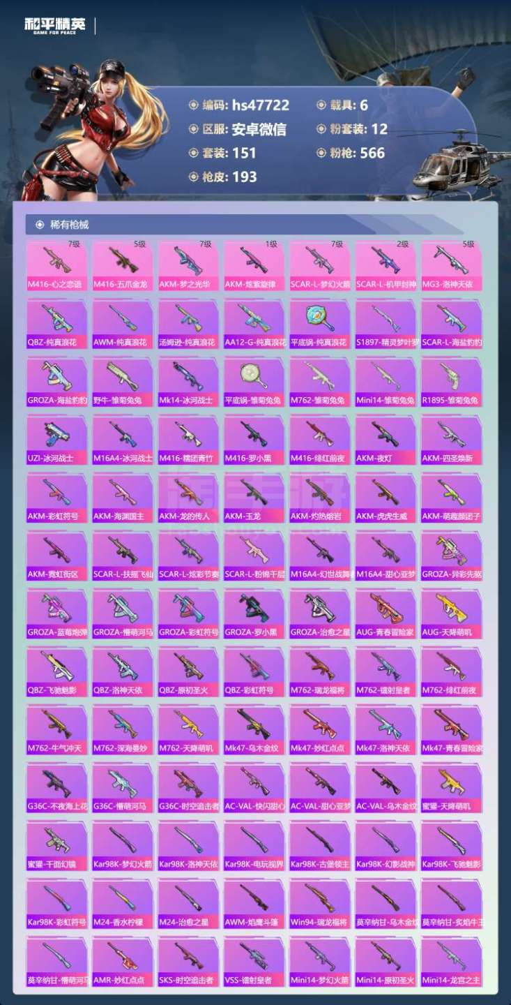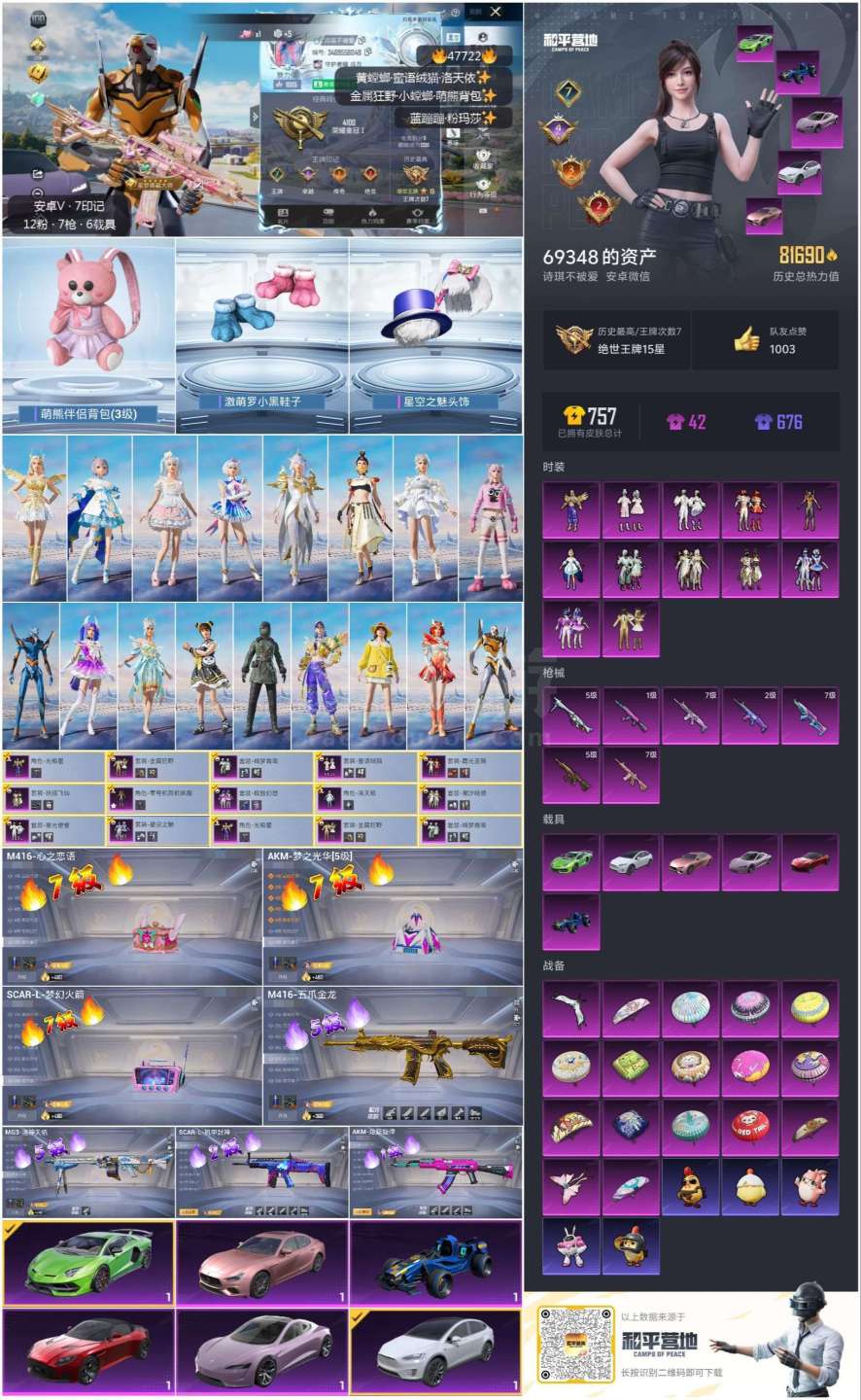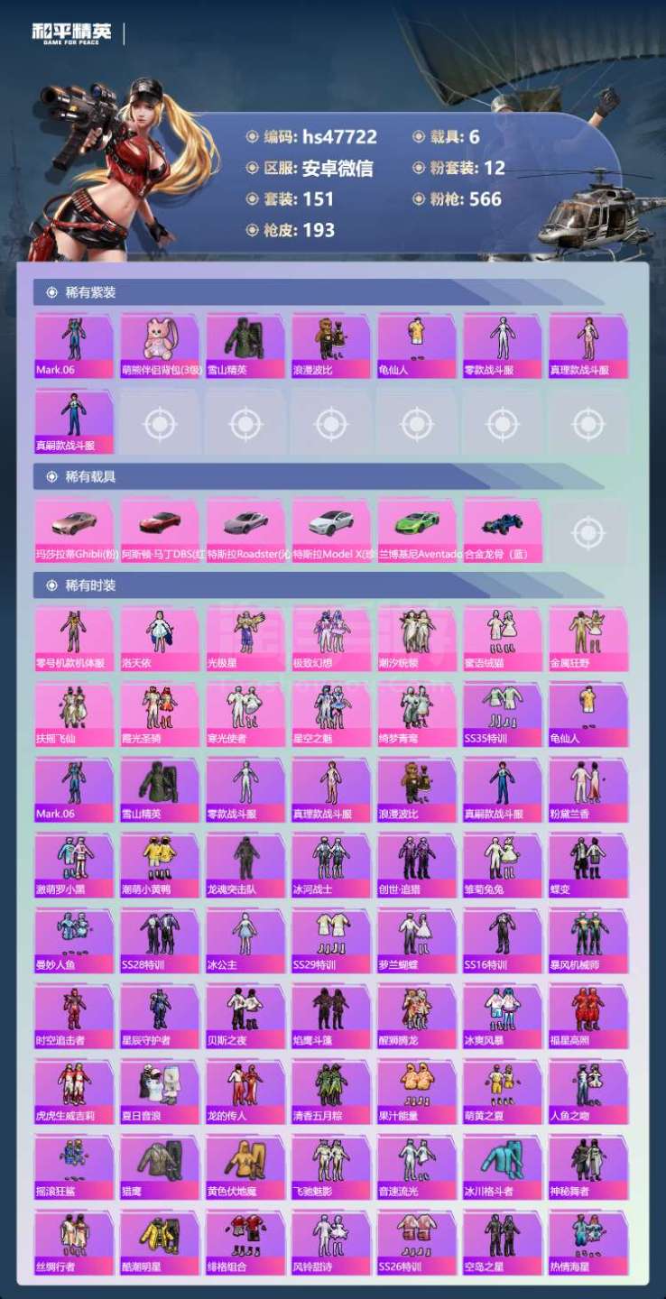安卓微-7王牌印记-12粉装-7特效枪-6载具-81818热力值-151套装-193枪皮-4卓越印