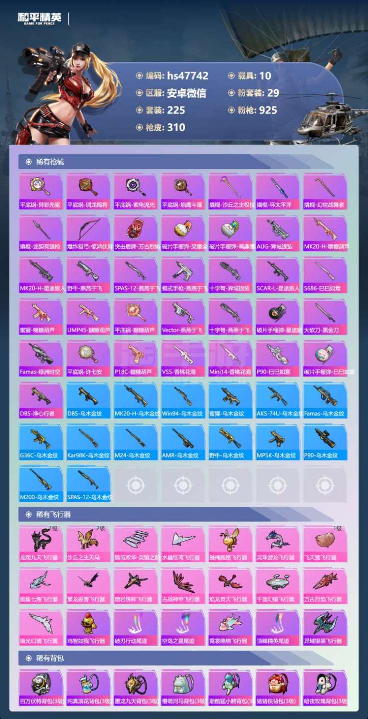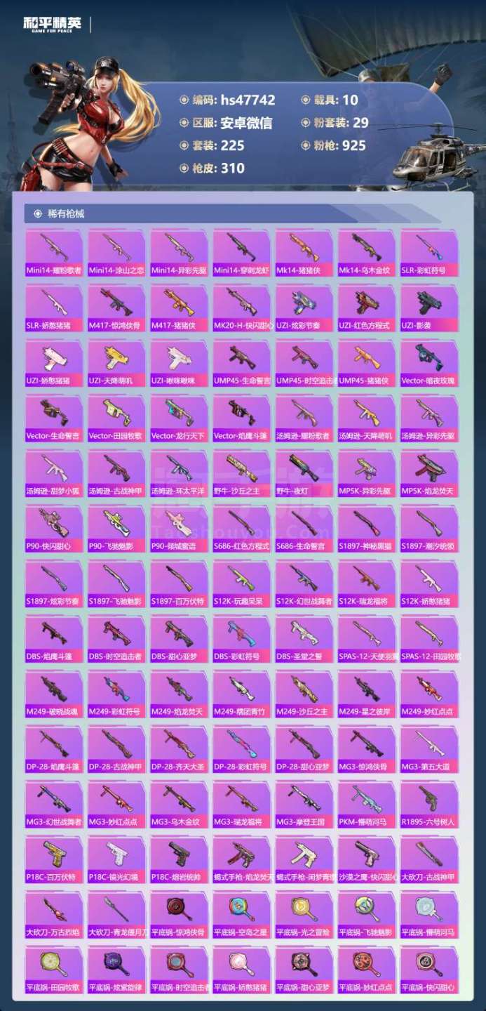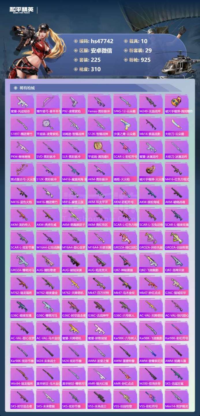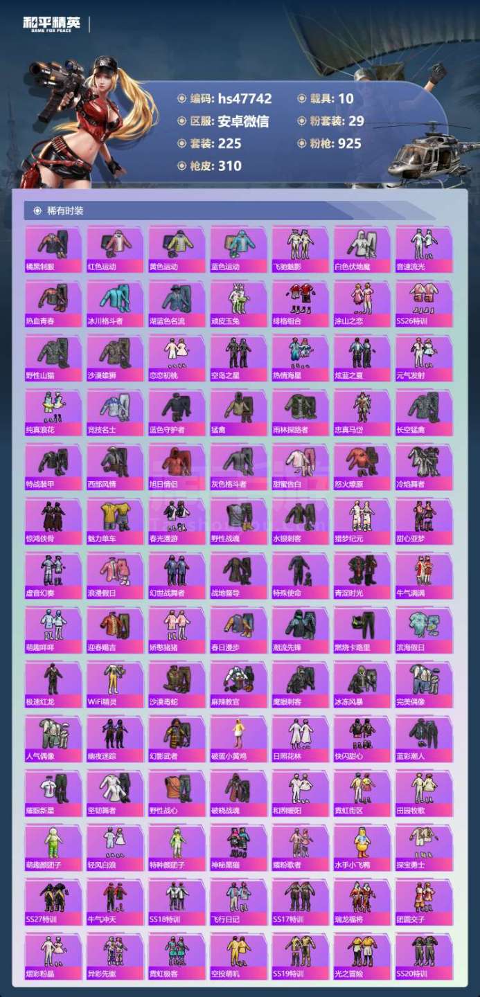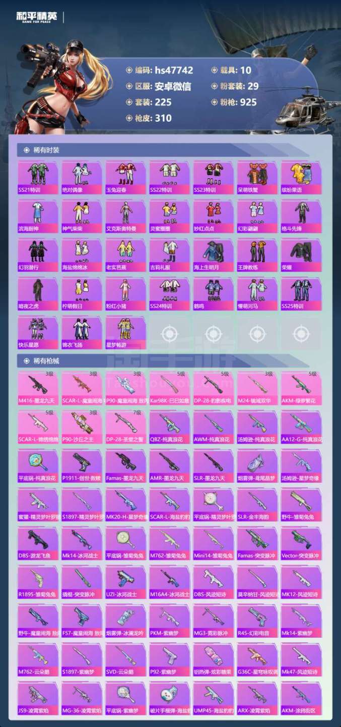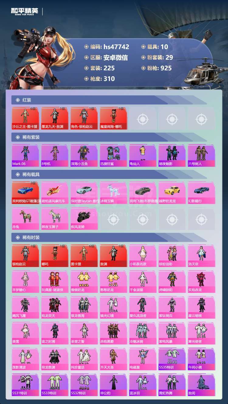 安卓微-20王牌印记-4红装-29粉装-10特效枪-10载具-141306热力值-225套装-31