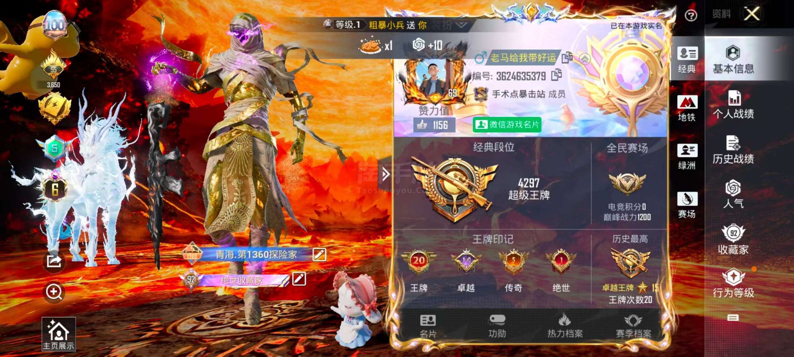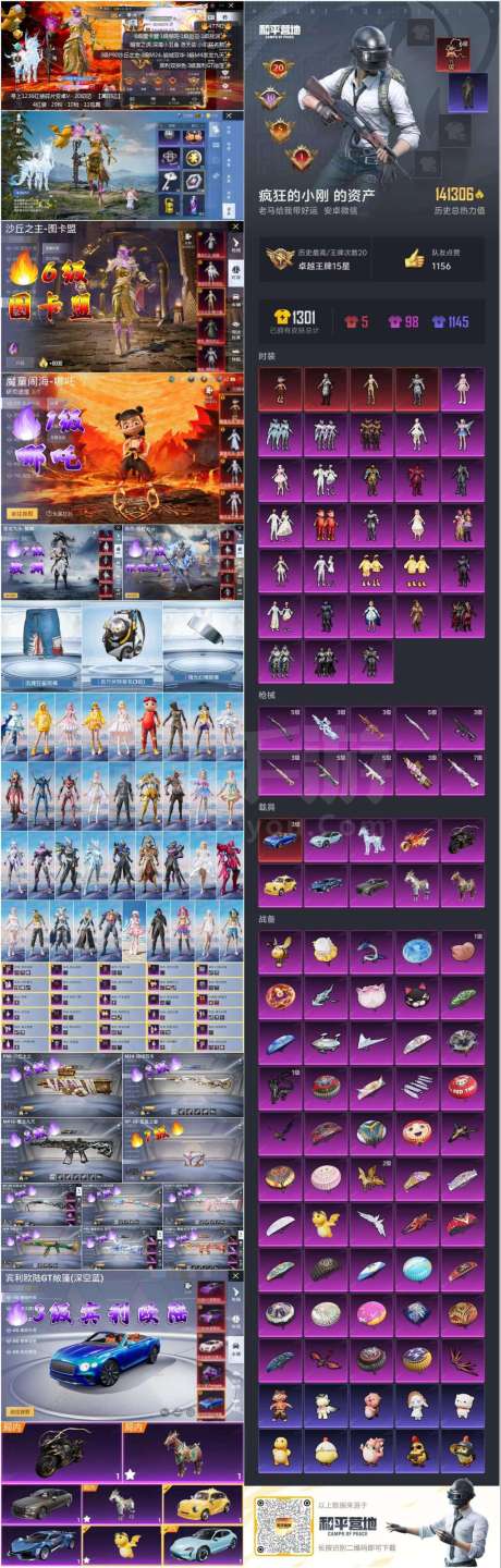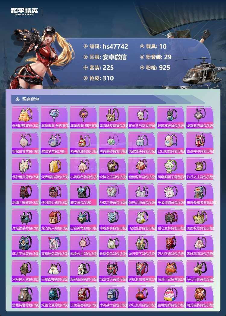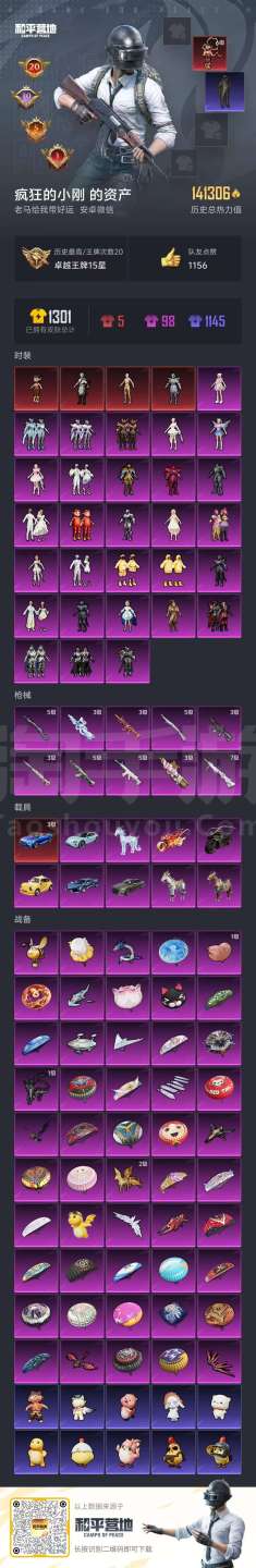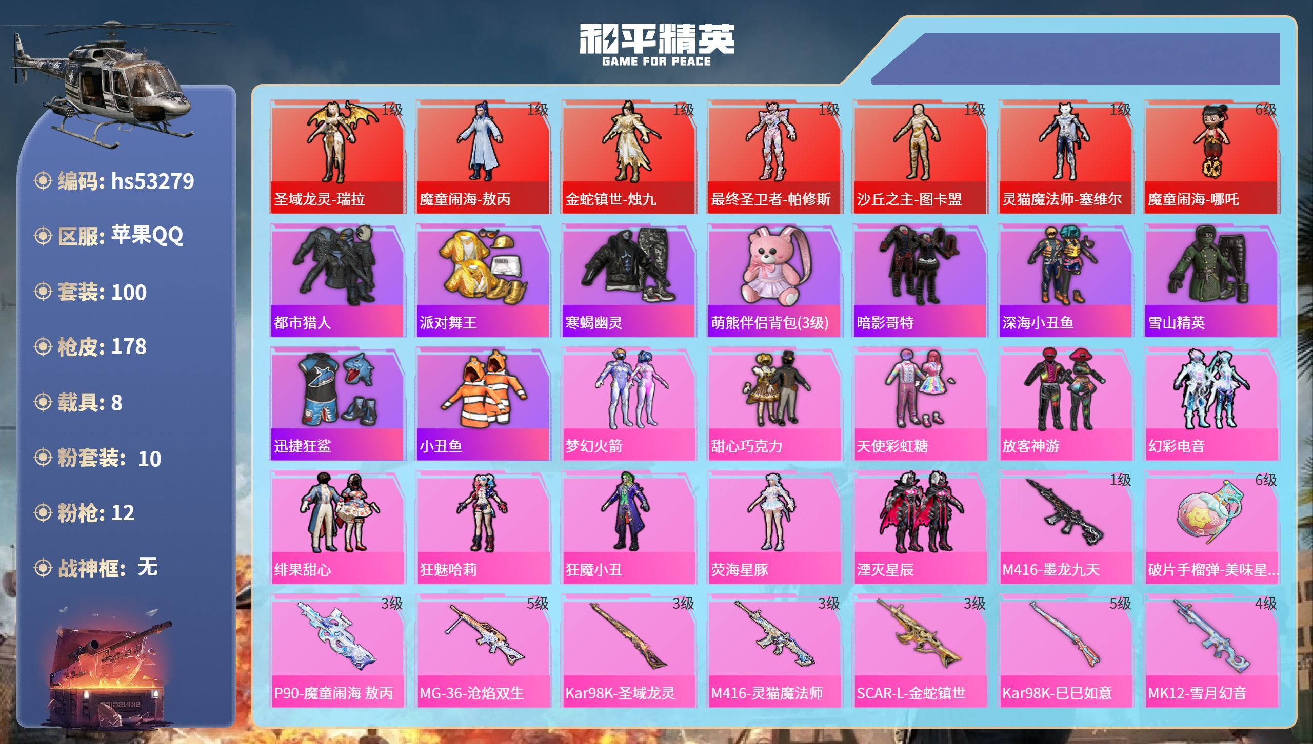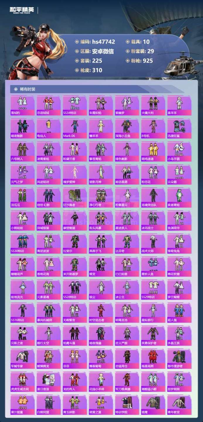 安卓微-20王牌印记-4红装-29粉装-10特效枪-10载具-141306热力值-225套装-31