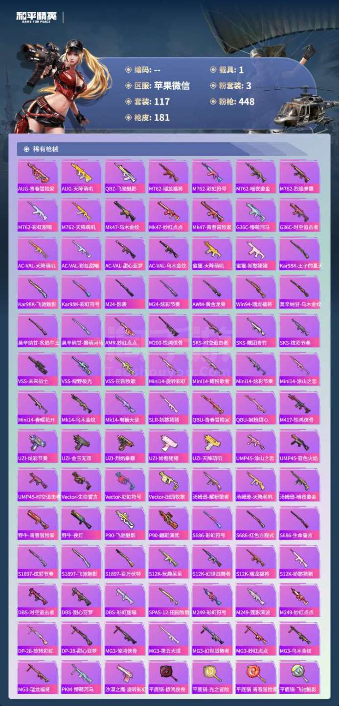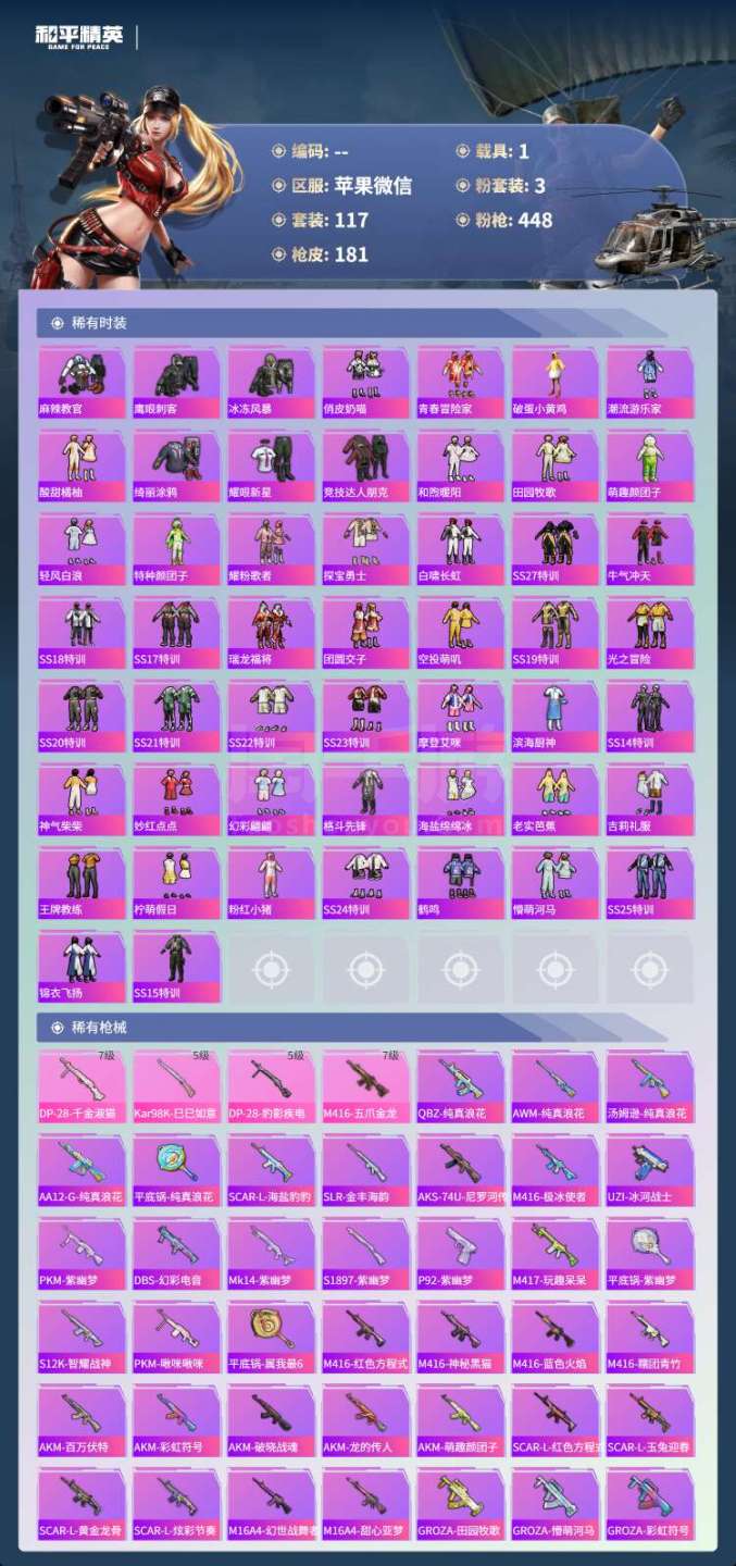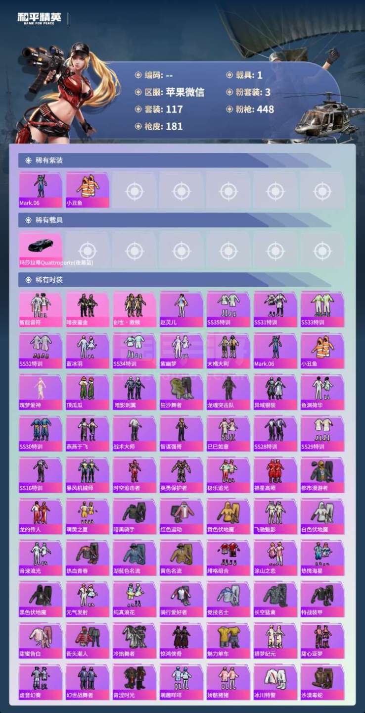 苹果微-11王牌印记-3粉装-4特效枪-1载具-56564热力值-117套装-181枪皮-2卓越印
